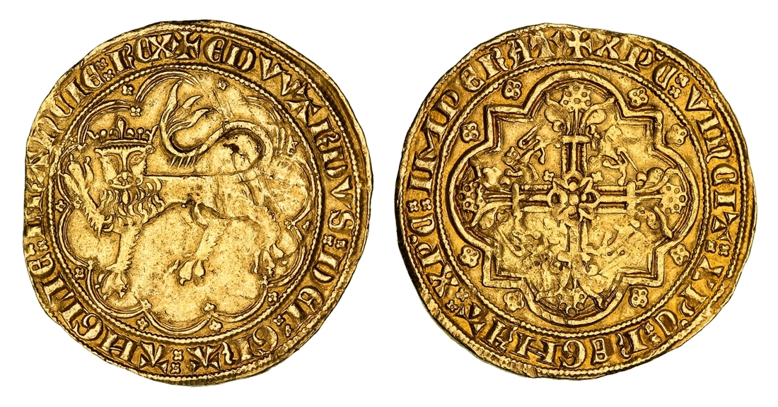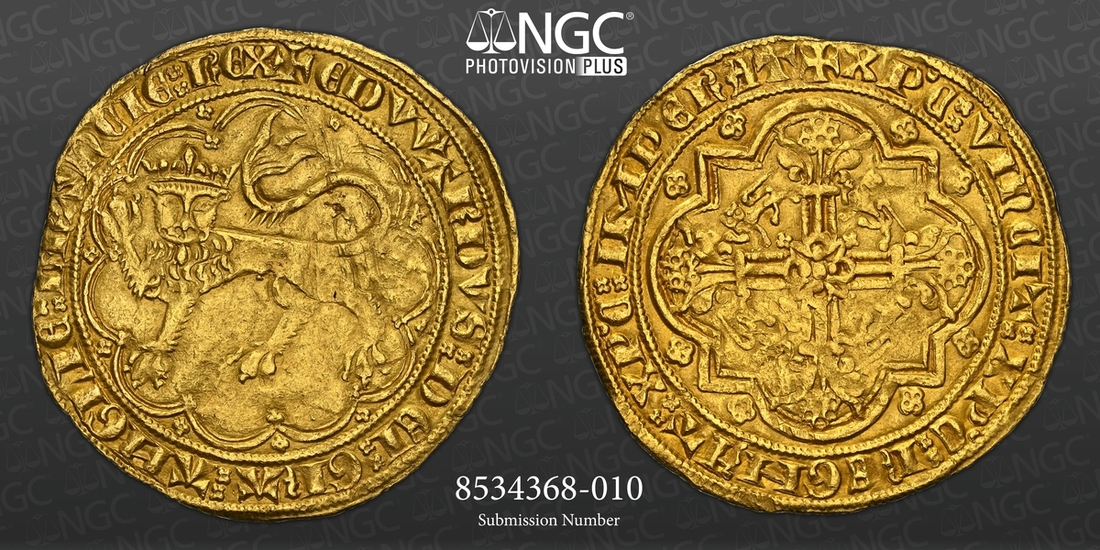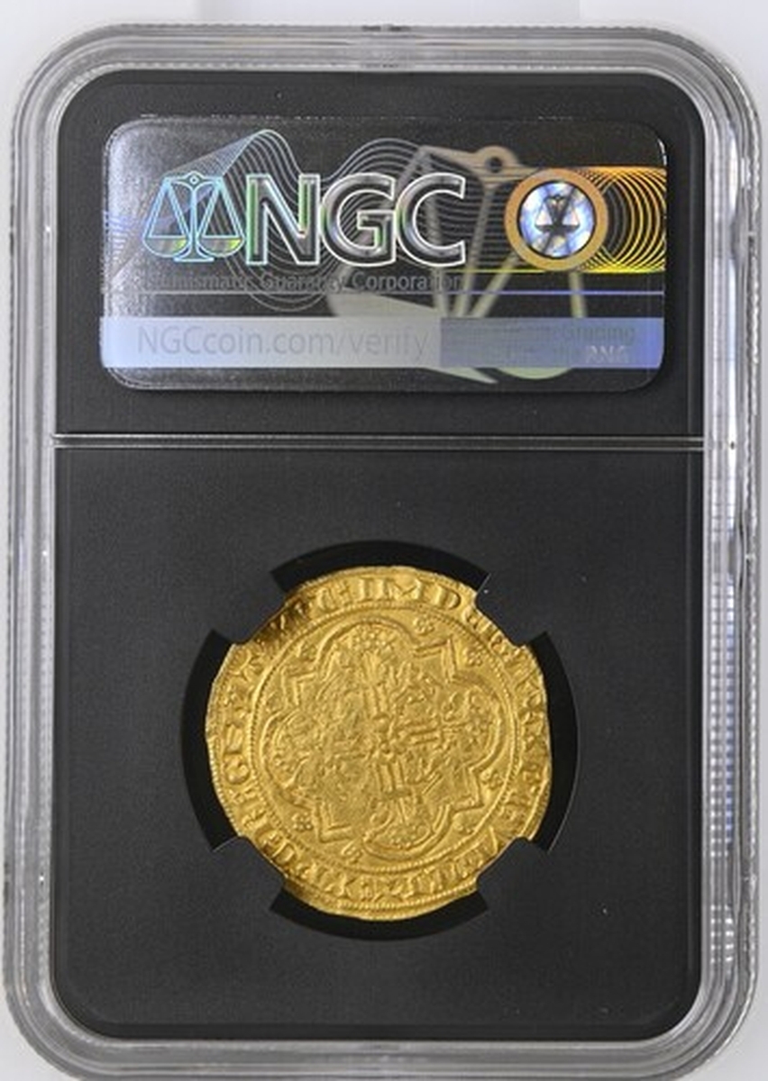 (x) NGC AU | Anglo-Gallic, Edward III (1327-1377), Leopard d'Or, + EDVVARDVS : DEI : GRA : ANGLIE : FRANCIE : REX, rosette stops, crowned leopard passant left, rev. + XP'C : VINCIT : XP'C : REGNAT : XP'C : IMPERAT, rosette stops, ornate cross fleury, beaded inner tressure, voided quatrefoils in spandrels, 3.588g [55.37grns], 3h, m.m. cross pattée (Schneider III, 14; Elias 39 variety), a trace off-struck with weakness to Lion's rump, otherwise residually lustrous and with a hint of tone, almost very fine, in NGC Black 'Carrington' holder, graded Almost Uncirculated (Cert. #8534368-010)