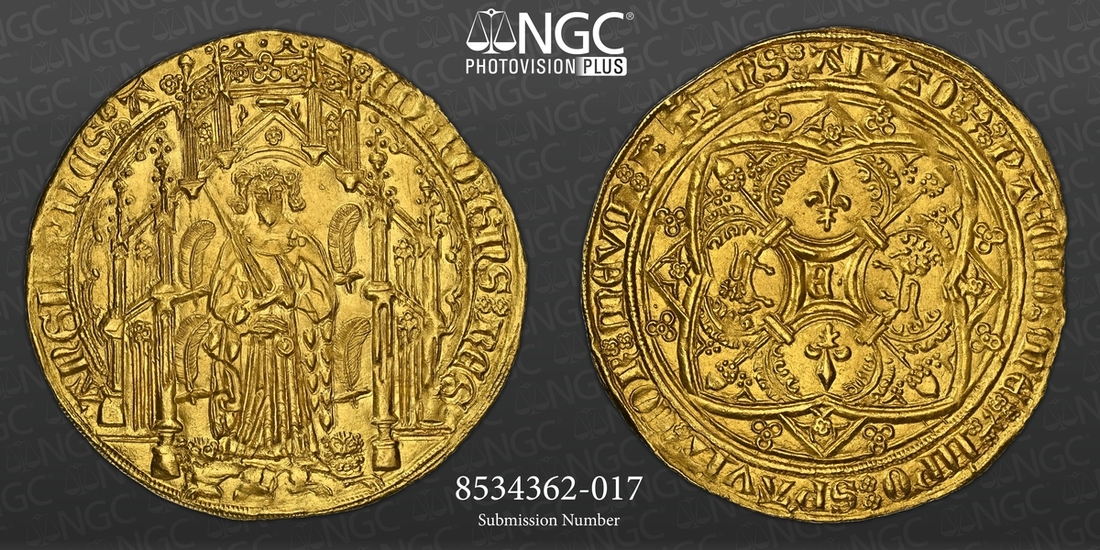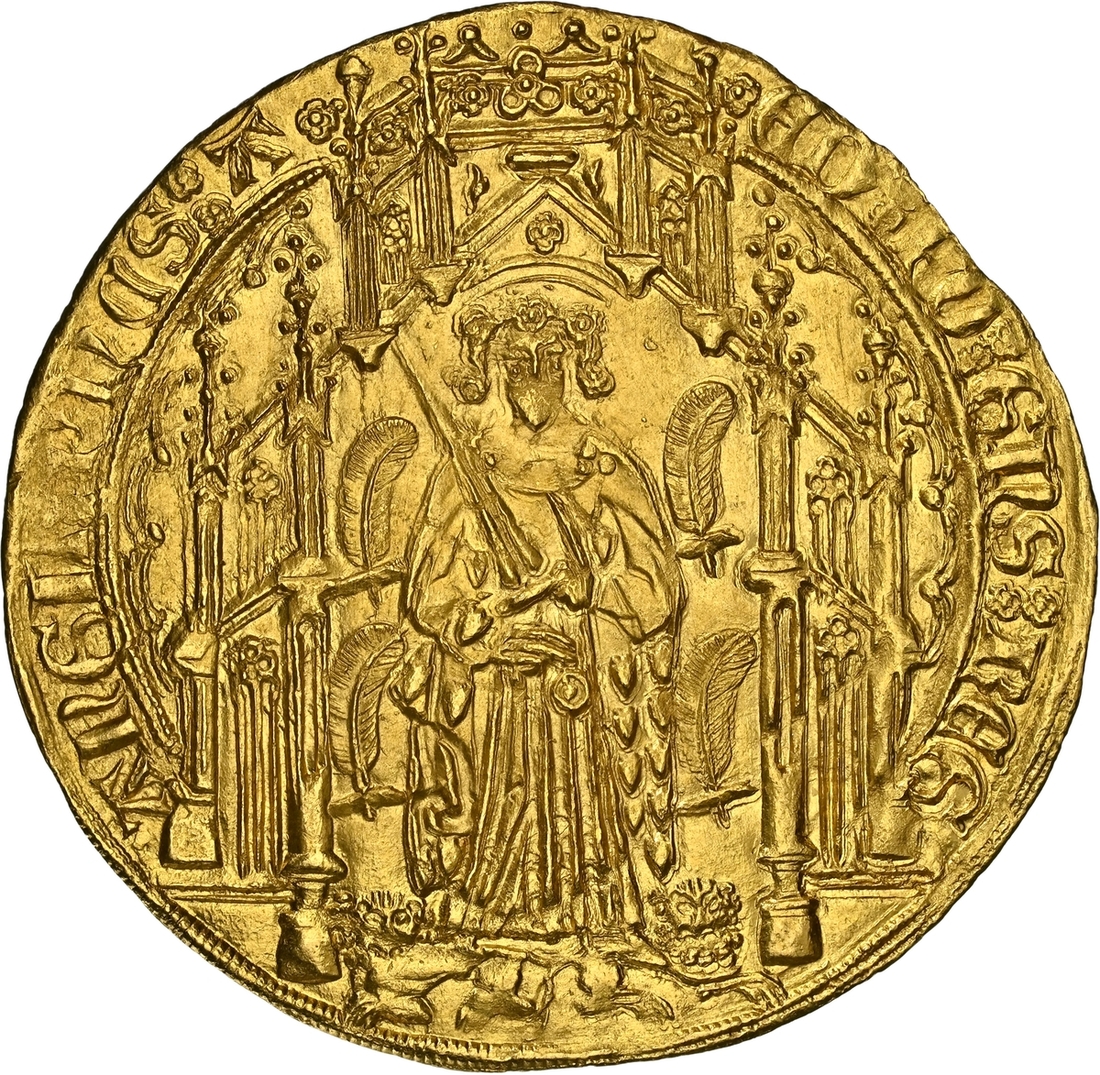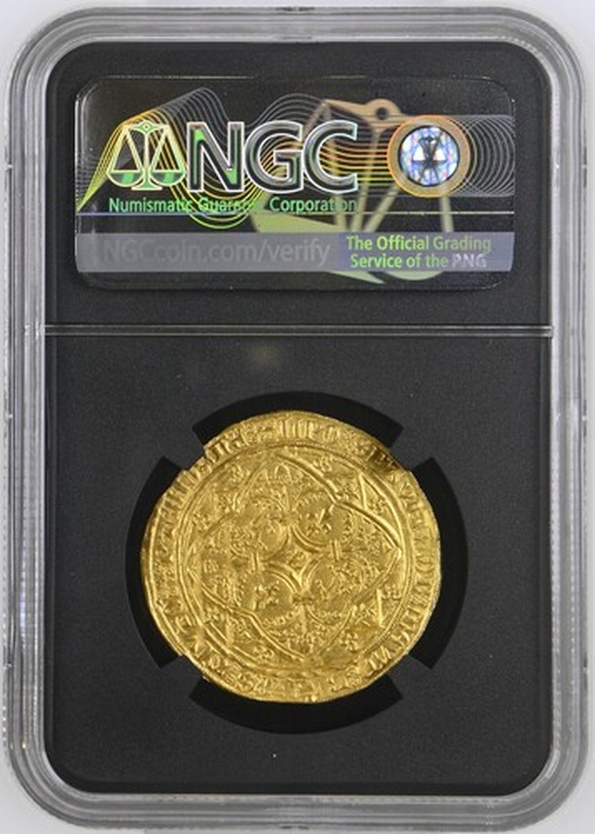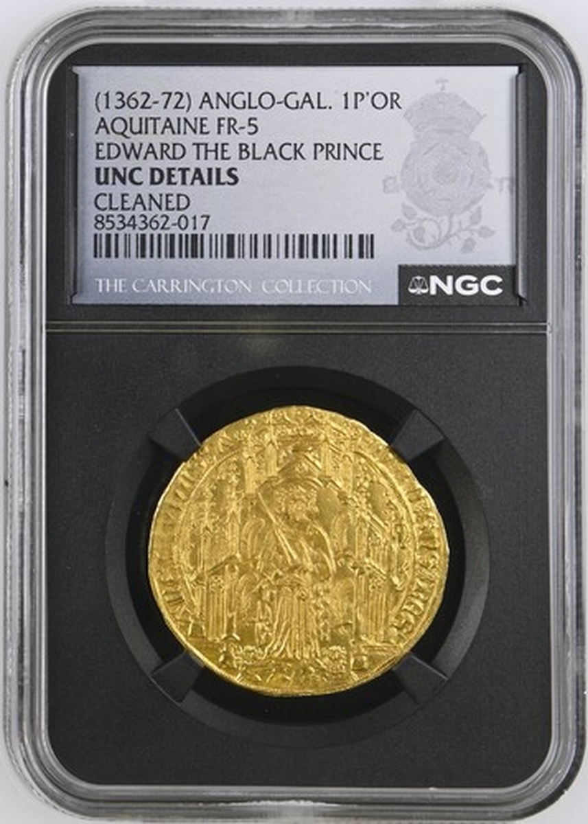 (x) NGC UNC | Anglo-Gallic, Edward the Black Prince (1362-1372), Pavillion d'Or, .ED : PO : GNS : REG | ANGL PNCS : AQ ., Prince standing beneath Gothic portico, sword in right hand, left hand raised, two leopards at his feet, two ostrich feathers at each side, all curved to right, all within a plain inner circle, rev. + DNS : AIVTO : Z : PTECIO : ME : Z : IIPO : SPAVIT : COR : MEVM : B, cross quernée within ornamental quatrefoil, E in centre, leopards in first and fourth angles, 4.461g [68.84grns], 6h, i.m. cross pattée (Schneider III, 50-55; Elias 154 b/c), bright and lustrous with a trace of doubling to peripheries, otherwise extremely fine and much as issued, rare thus, in NGC Black 'Carrington' holder, graded Uncirculated (Cert. #8534362-017)