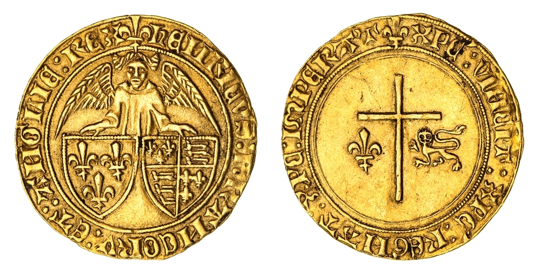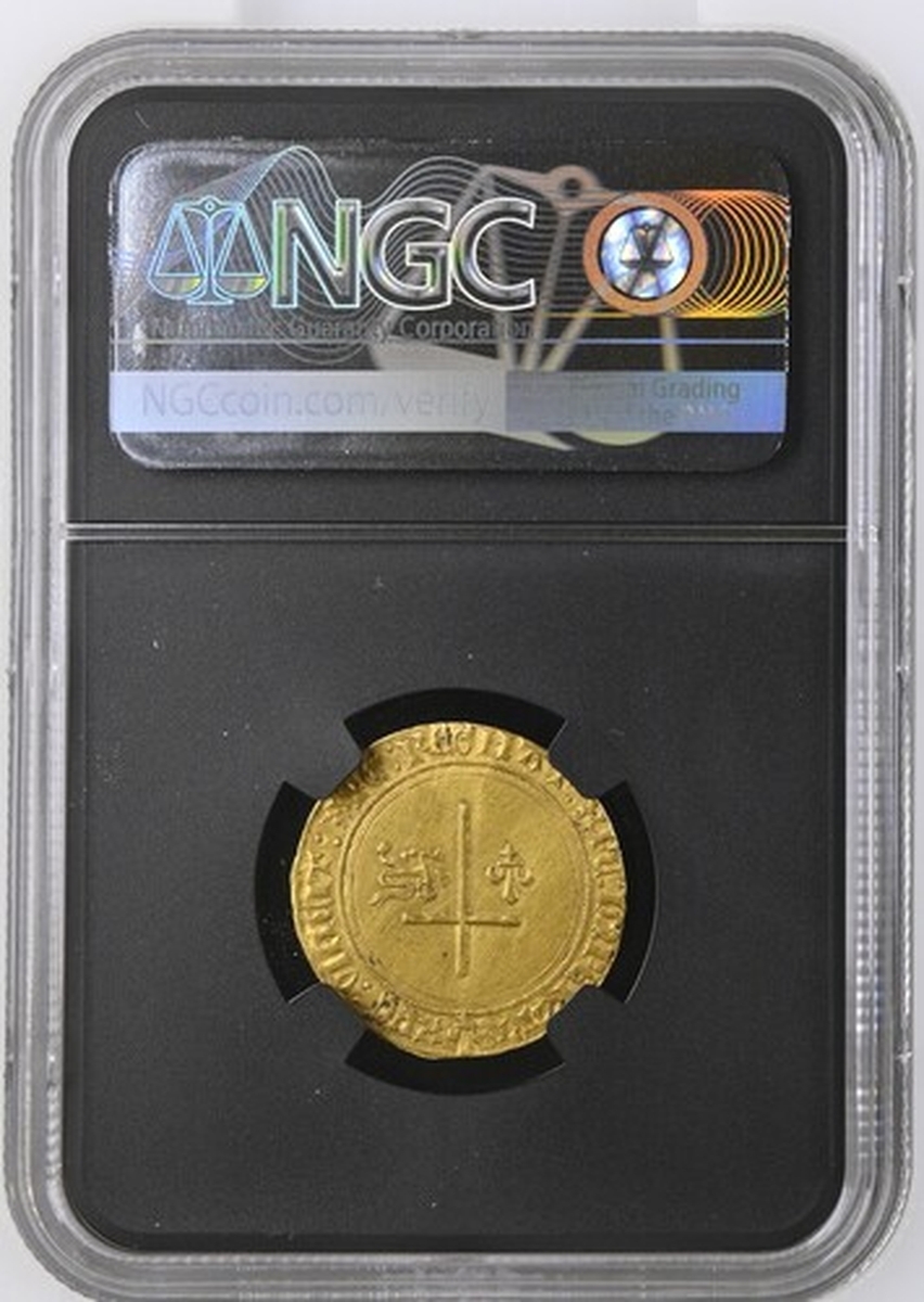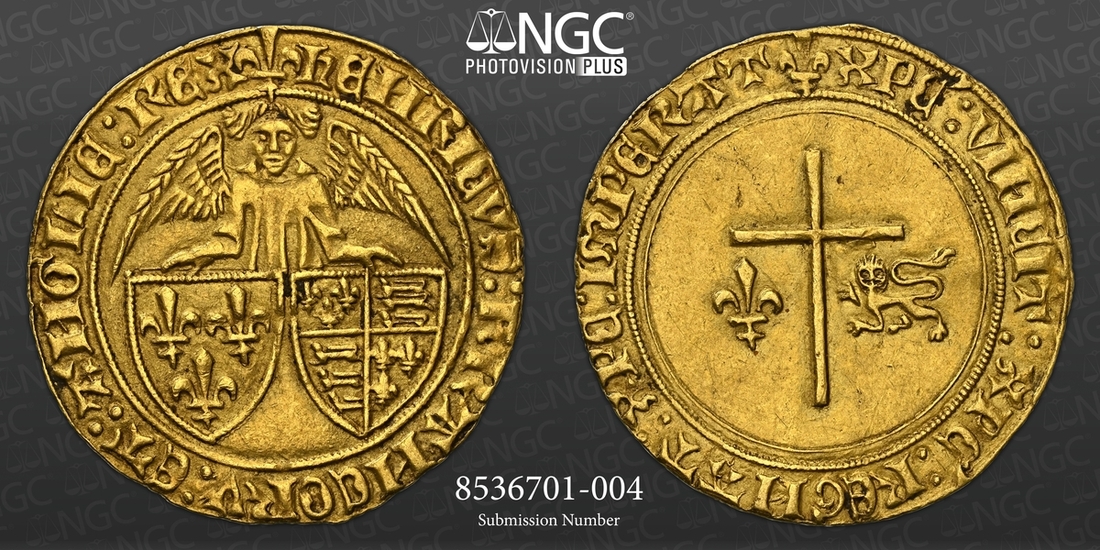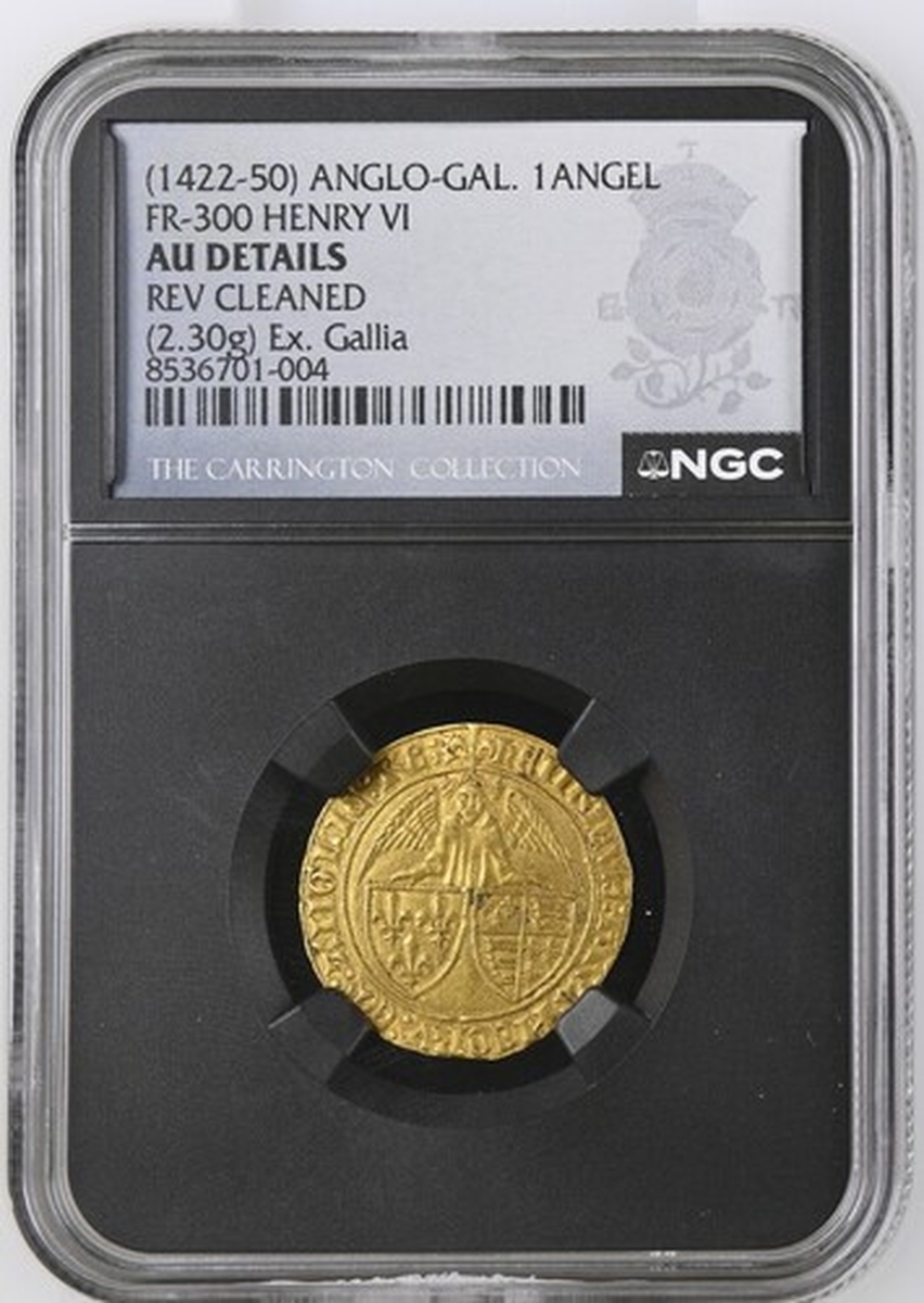 (x) NGC AU | Anglo-Gallic, Henry VI (1422-1461), Angelot d'Or, St Lô, (m.m.) hENRICVS : FRANCORV : ET: ANGLIE: REX, Archangel Gabriel standing facing with outstretched wings supporting the arms of France (on left) and England (on right), rev. (m.m.) XPC': VINCIT : XPC ': REGNAT : XPC': ImPERAT, Latin cross with lys to left and leopard to right, 2.304g [35.55grns], 6h, m.m. lys (Schneider III, 134; Elias 277; S.8165), a hint of cabinet friction in otherwise handsomely toned and lustrous original fields, the strike sumptuously crisp and uniform for issue, near extremely fine and equally rare, especially in this gloriously choice state, in NGC Black 'Carrington' holder, graded AU Details ~ Rev. Cleaned (Cert. #8536701-004)