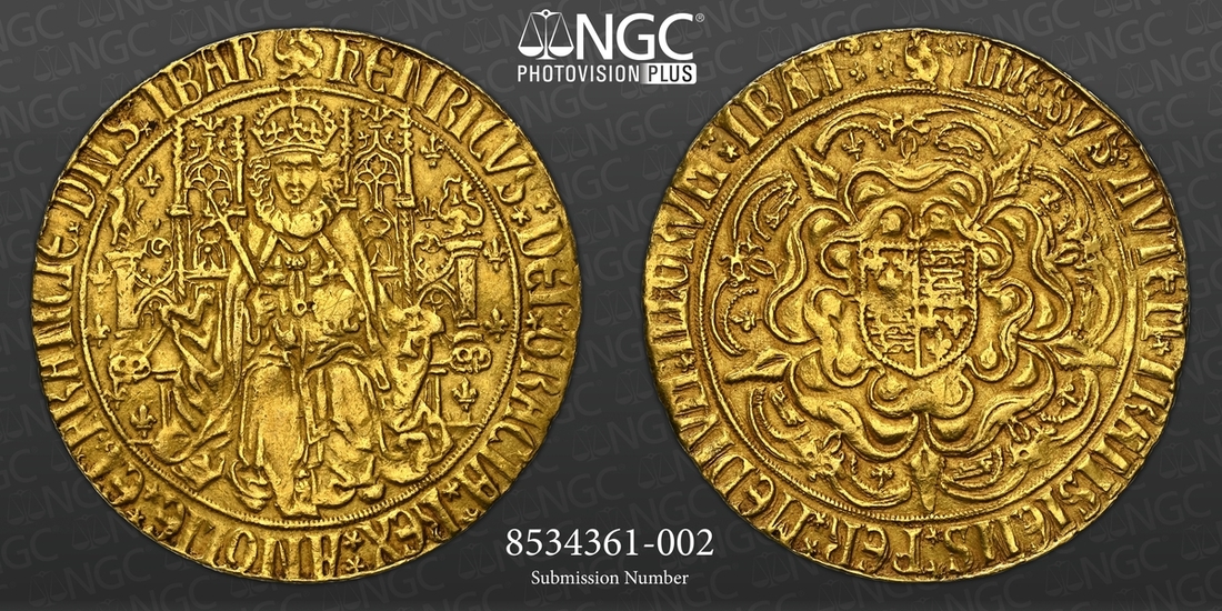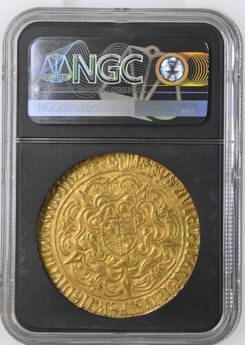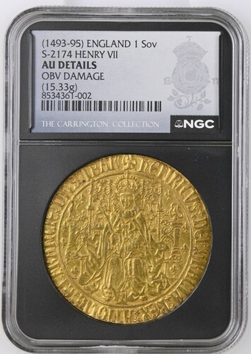 (x) NGC AU | Henry VII (1485-1509), Sovereign, Type III, Spring 1493 - Autumn 1495, Tower (London), (m.m.) hENRICVS : DEI : GRACIA : REX : ANGLIE : ET : FRANCIE : DNS : IBAR, crowned robed figure of King sitting facing on throne, holding orb and sceptre, greyhound and dragon supporters on throne pillars, ten fleur-de-lys around throne, Latin legend with inner and outer beaded borders surrounding, initial mark dragon both sides, mullet colon stops both sides, rev. (m.m.) *IhESVS* AVTEM* TRANSIENS: PER: MEDIVM: ILLORVM: IBAT: :, quartered shield of arms upon blooming rose, within ten arc double tressure of beaded and linear makeup, lion and lys alternation within each arc, Latin legend with inner and outer beaded border surrounding, 15.290g [235.96grns], 12h, m.m. dragon (Ruding, Pl. IV, 5; Kenyon 4; Brooke 3; A E Packe 176 = Thellusson ; SCBI 23 [Ashmolean], 78; Bruun 531; Bruun 532 = Heath 7; Huth 29; Clarke-Thornhill 40; Raynes 58*; Yates-Thompson = Ryan 105*; Lockett 1676 = Cabell = Schneider I, 549; North 1691; BMC 5; S.2174), a smll scratch on orb, otherwise an imposing specimen of this celebrated Tudor rarity, handsomely uniform in the strike on a full round flan, a wholesome very fine and equally rare, in NGC Black 'Carrington' holder, graded Almost Uncirculated (Cert. #8534361-002)