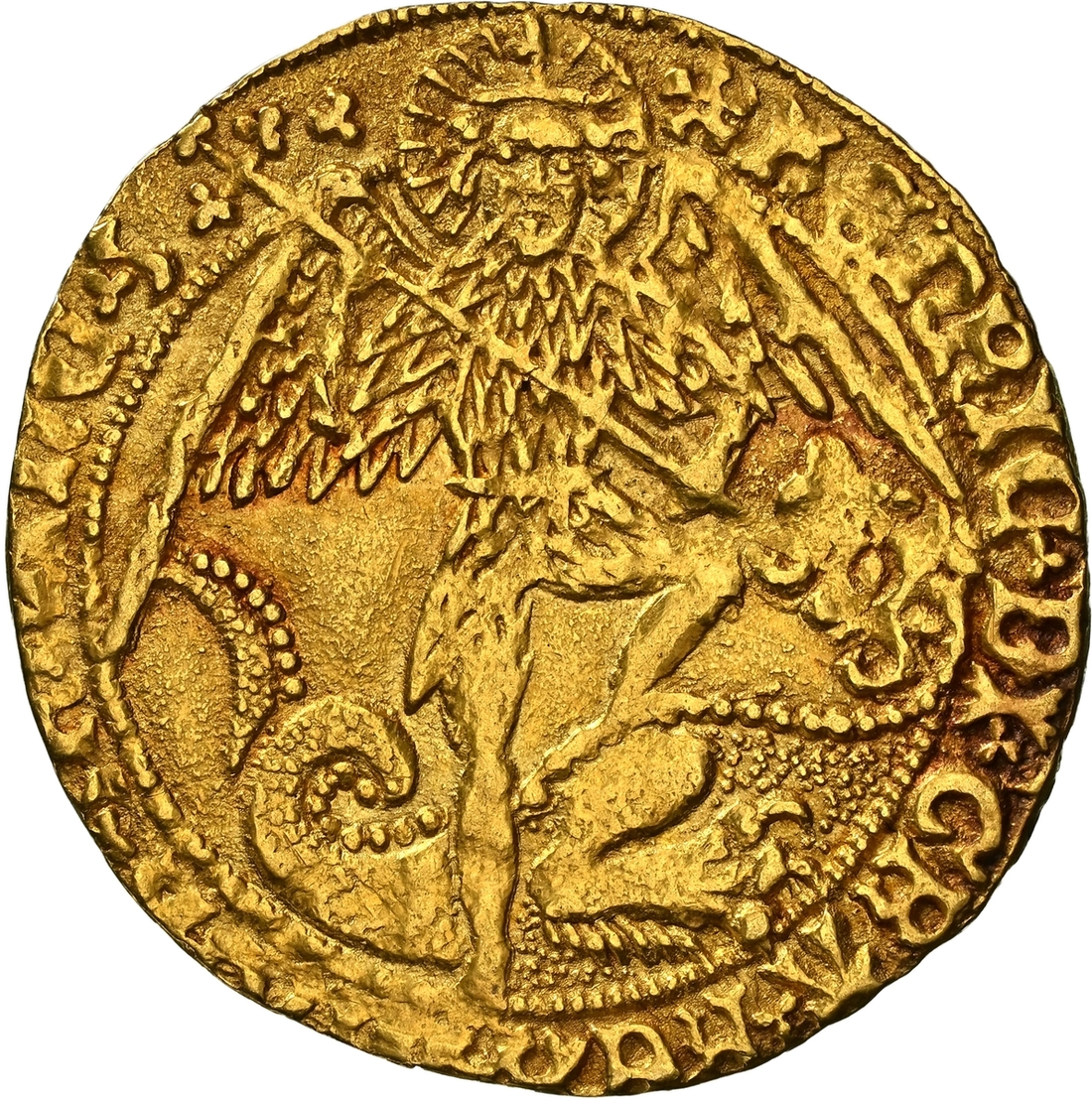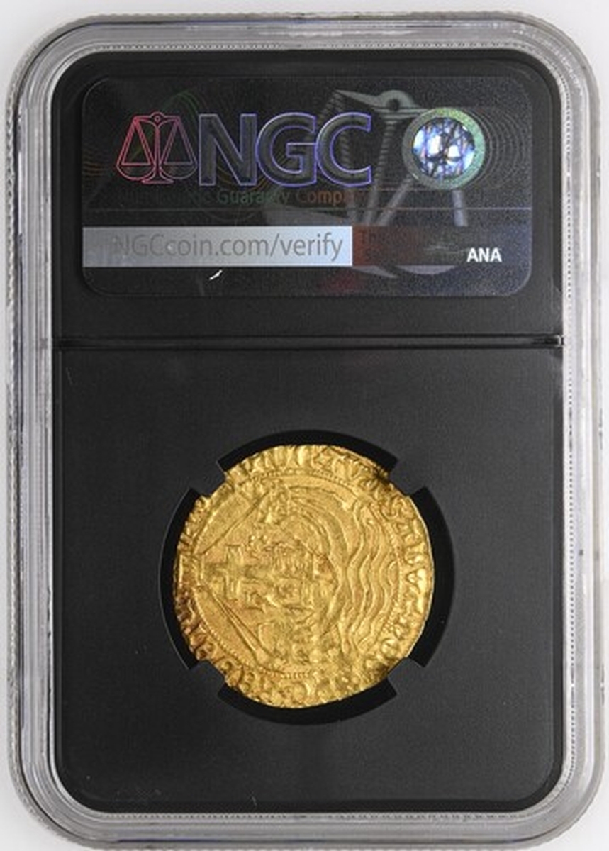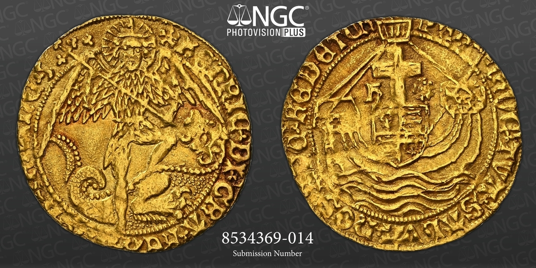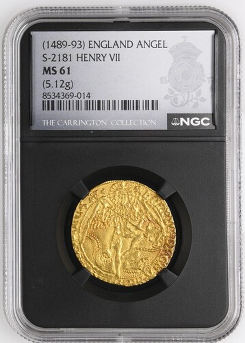 (x) NGC MS61 | Henry VII (1485-1509), Old Type, Angel, Class II, 1489-1493, Tower (London), (m.m.) hENRIC . DI . GRA . REX . ANGL . Z . FRAnC . Z | ., trefoil stops, St Michael vanquishing Dragon, rev. PER | CRVC .' TVA .' SALVA nOS . XPC : REDE'TOR, trefoil stops, ship surmounted by square-topped shield and mast dividing h and Rose, 5.118g [78.98grns], 9h, m.m. cinquefoil (Schneider I, 513-514; North 1695; S.2181), struck with aging dies hence softness to Archangel's legs and corresponding area of reverse, otherwise pleasantly toned and lustrous, an imposing very fine, in NGC Black 'Carrington' holder, graded MS61 (Cert. #8534369-014)