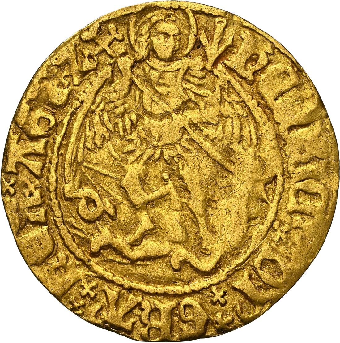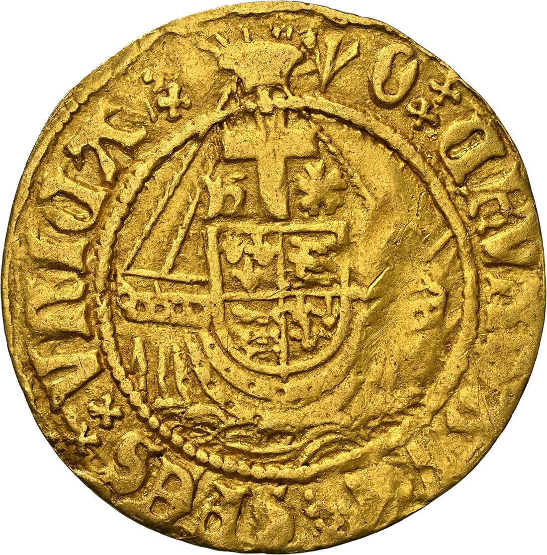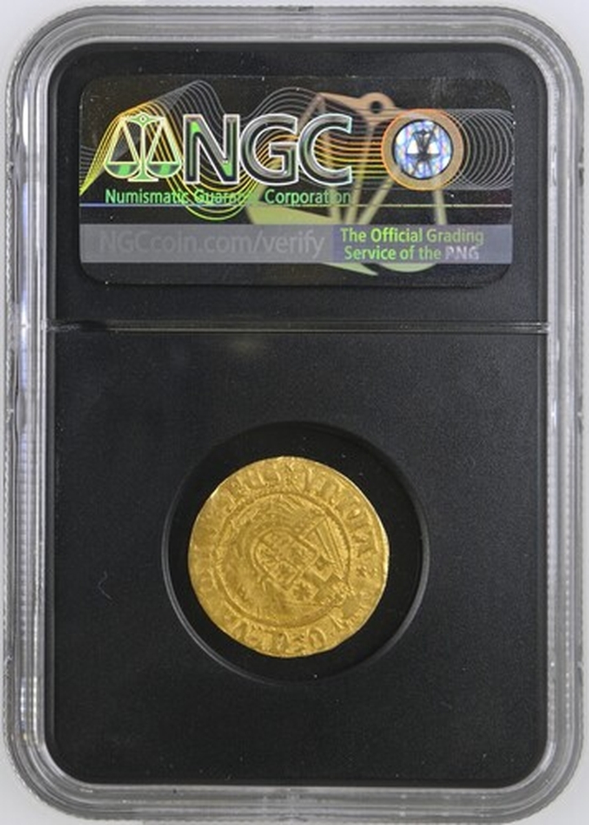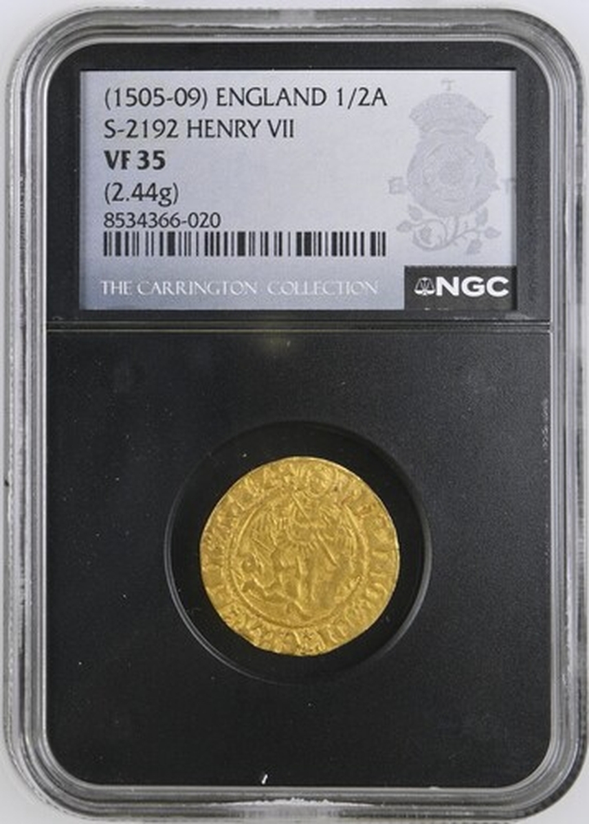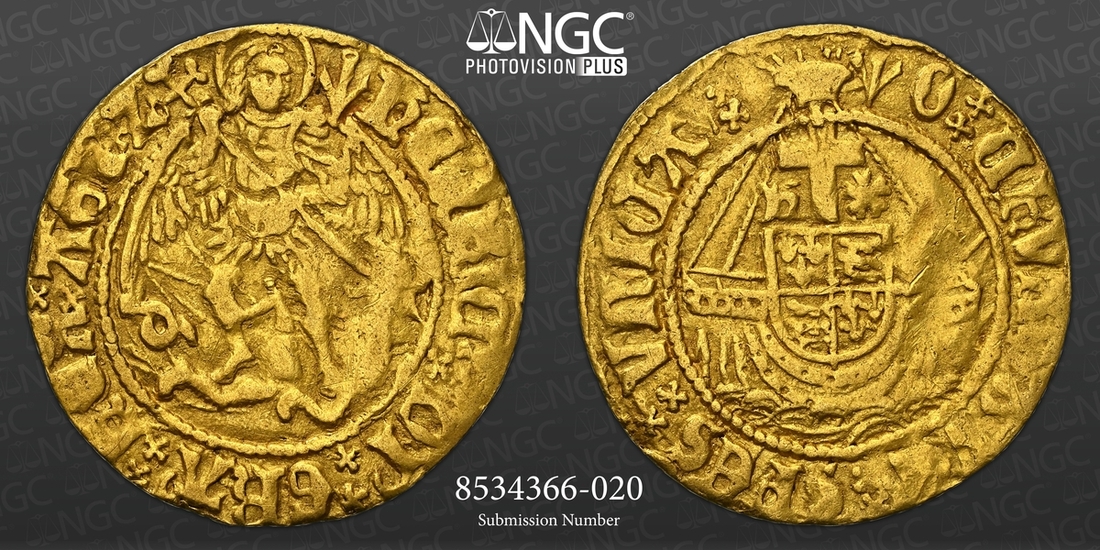 (x) NGC VF35 | Henry VII (1485-1509), Type V, Angelet, 1505-1509, Tower (London), (m.m.) hEnRIC': DI': GRA': REX: AGL'. Z, double saltire stops, St Michael vanquishing Dragon, rev. (m.m.) O: CRVX: AVE: SPES: VnICA:, double saltire stops, ship surmounted by square-topped shield and mast dividing h and Pansy, 2.429g [37.48grns], 5h, m.m. pheon (Schneider I, 547; North 1702; S.2192), softly waterworn but with engraver's preparation lines clear in fields, on a full round flan and residually lustrous, approaching very fine, rare, in NGC Black 'Carrington' holder, graded VF35 (Cert. #8534366-020)
