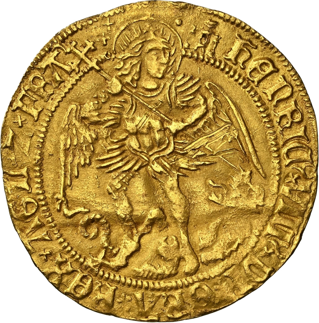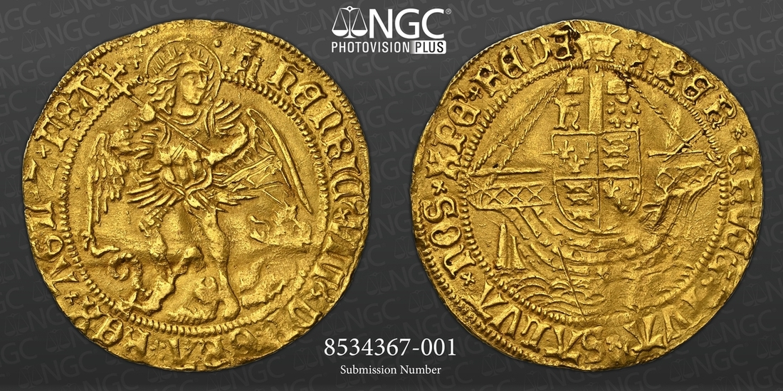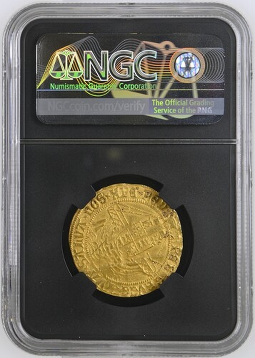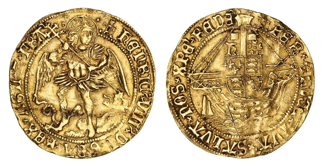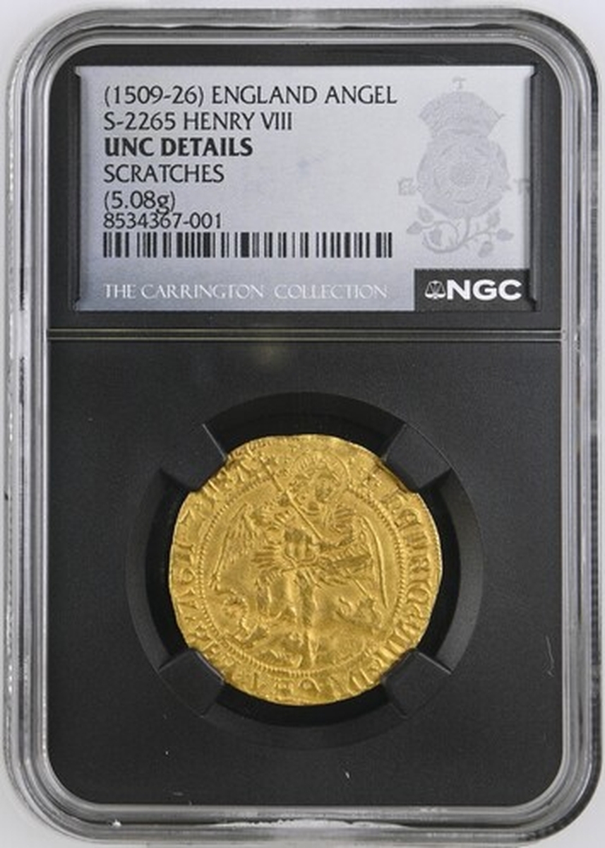 (x) NGC UNC | Henry VIII (1509-1547), First Coinage, Angel, 1509-1526, Tower (London), (m.m.) hEnRIC ?x VIII ?x DI 'x GRA 'x REX x AGL 'x Z x FR ' | : saltire stops, St Michael vanquishing Dragon, rev. (m.m.) PER x CRVCE ' x TVA 'x SALVA x nOS x XPE' x REDE 'x, saltire stops, ship surmounted by square-topped shield and mast dividing h and Rose, 5.061g [78.103grns], 2h, m.m. castle (Schneider I, 558; North 1760; S.2265), scratch below waves and scuffs to wings, with a slight flan crease through legs, otherwise uniformly struck up and toned, a bolder very fine to almost extremely fine in parts, in NGC Black 'Carrington' holder, graded Uncirculated (Cert. #8534367-001)