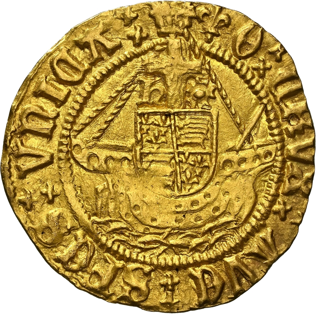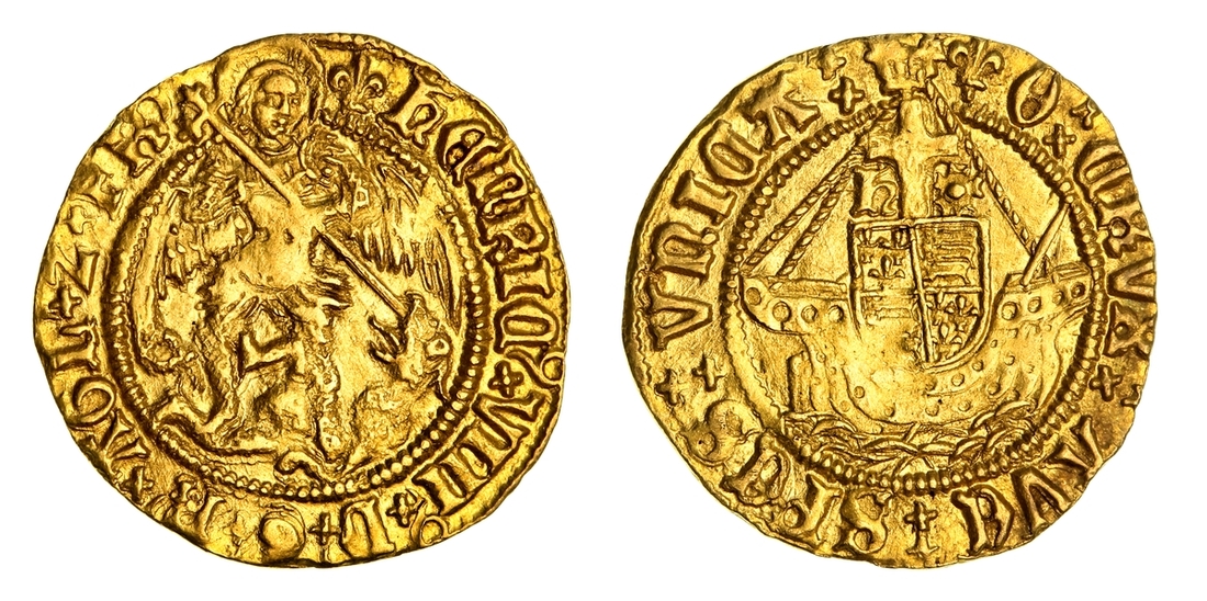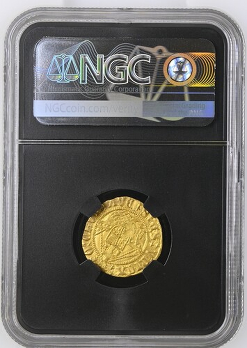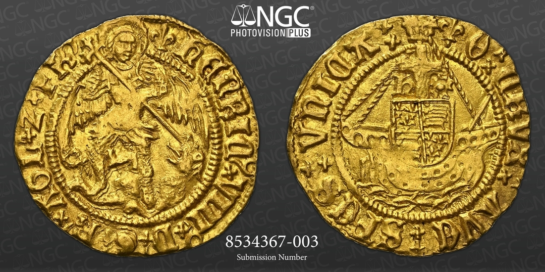 (x) NGC MS63 | Henry VIII (1509-1547), Second Coinage, Angelet, (m.m.) hENRIC ?x VIII ?x D .' G .' R .' AGL .' Z x FR', saltire stops, St Michael vanquishing dragon, rev. (m.m.) O : CRVX : AVE : SPES : VnICA :, double saltire stops, ship surmounted by square-topped shield and mast dividing h and Rose, 2.566g [39.599grns], 7h, m.m. lys (Whitton Pl. XII, 8 same dies; Spink 15004, 25 March 2015, lot 577 same dies; Schneider I, 575 same dies; North 1784; S.2269), some partial striking softness to Archangel's breastplate, otherwise lustrous and more sharply struck to key devices, a really good very fine to almost extremely fine, and an extremely rare denomination for the Second Coinage, in NGC Black 'Carrington' holder, graded MS63 (Cert. #8534367-003)