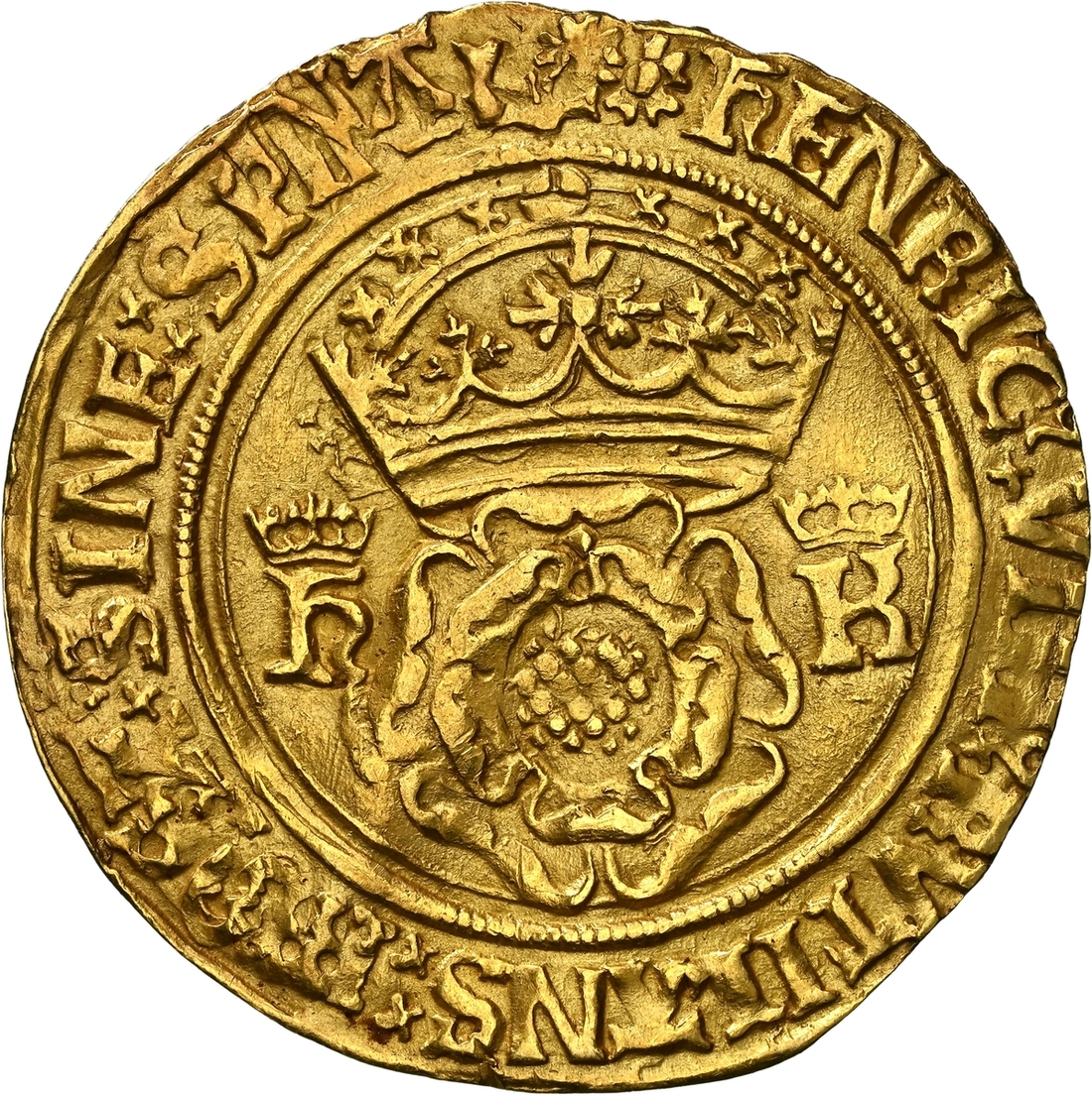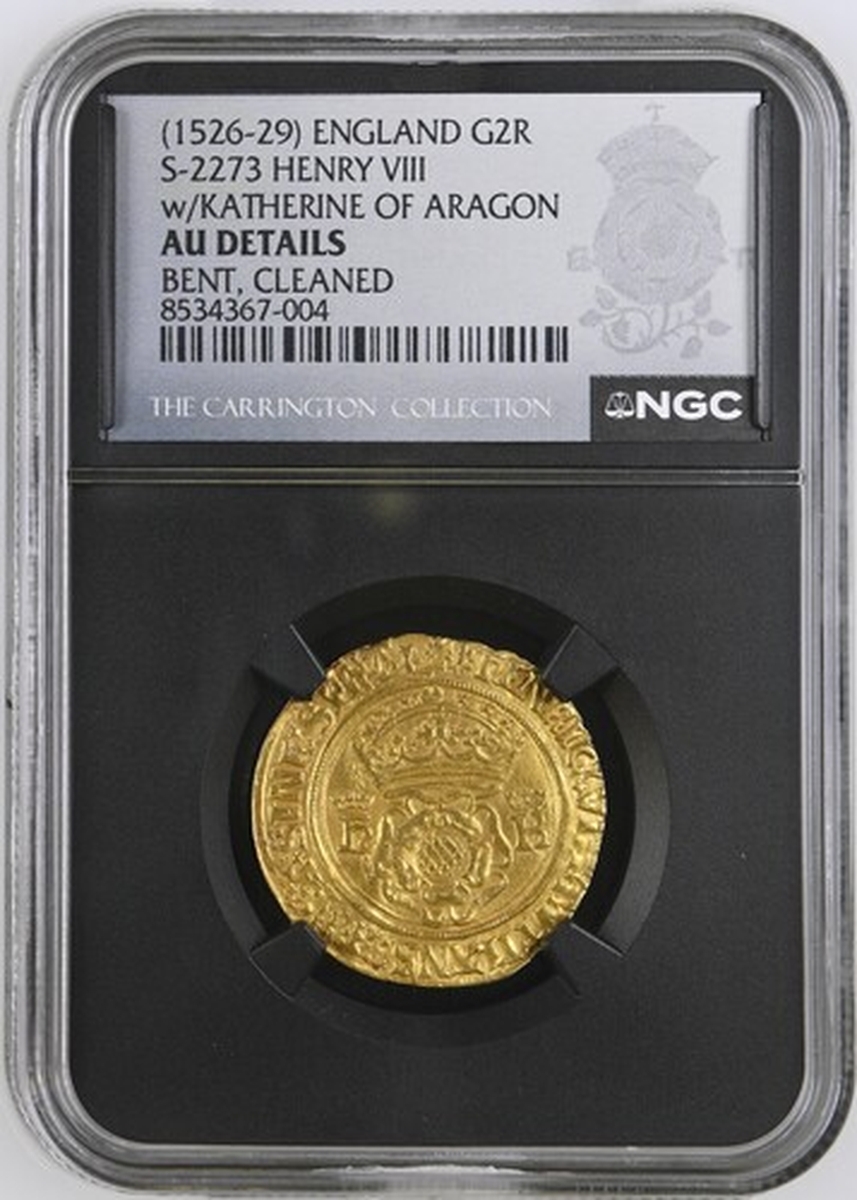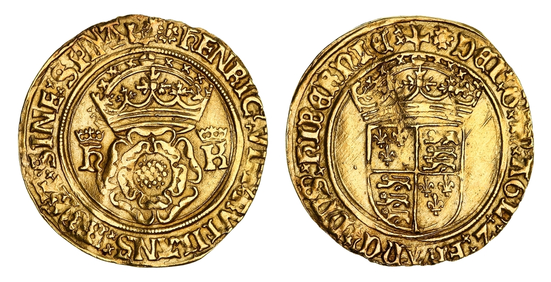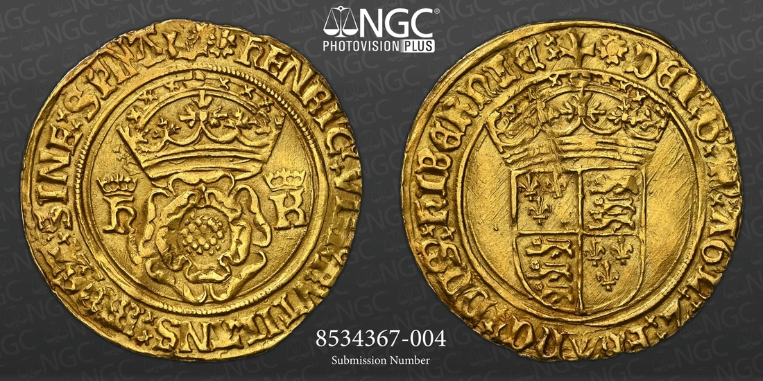 (x) NGC AU | Henry VIII, with Katharine of Aragon or Katharine Howard (1509-1547), Second Coinage, Crown of the Double Rose, Tower (London), (m.m.) hENRIC ?x VIII ?x RVTILANS : ROSA : SINE : SPINA, double saltire stops, Roman Ns, crowned rose dividing h-K, rev. (m.m.) DEI : G' : R' : AGL' : Z : FRANC 'x DNS : hIBERNIE :, crowned shield, 3.655g [56.405grns], 6h, m.m. rose (Whitton i; Schneider I, 579-583; North 1788; S.2273), creased but on a full round flan, with pleasant cabinet tone overlying lustrous original and die-striated fields, an attractively bold extremely fine, truly rare in this exemplary state, in NGC Black 'Carrington' holder, graded Almost Uncirculated (Cert. #8534367-004)