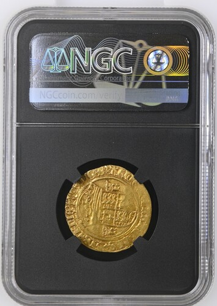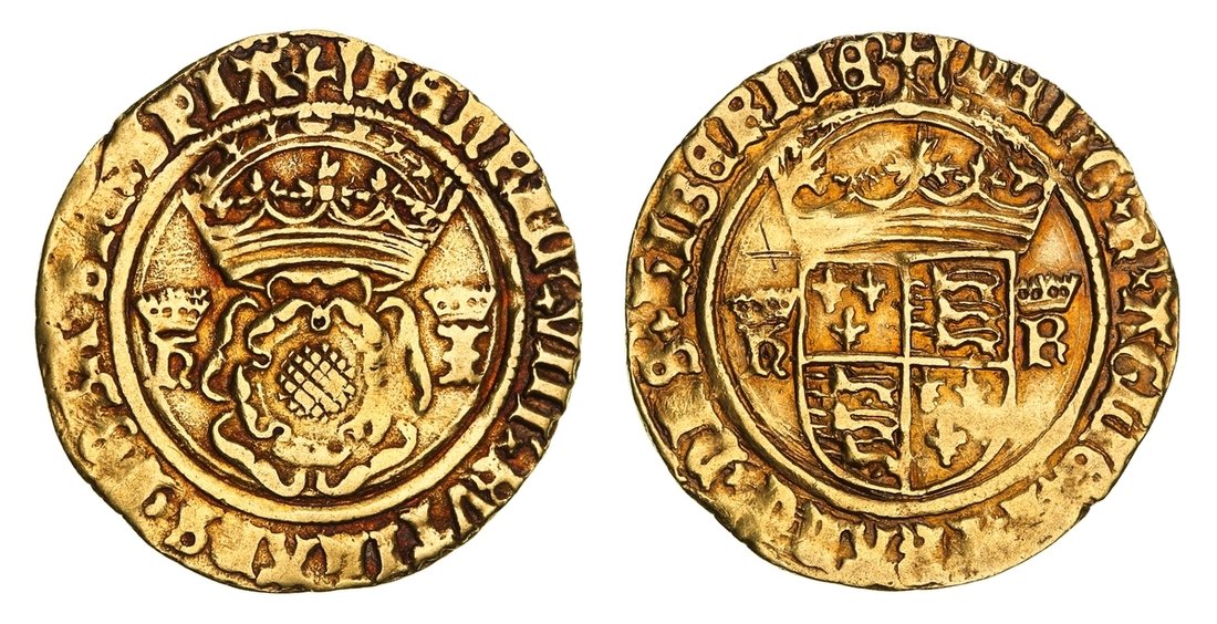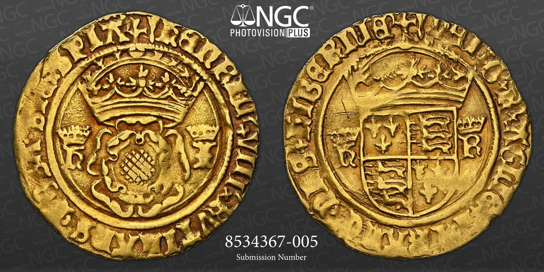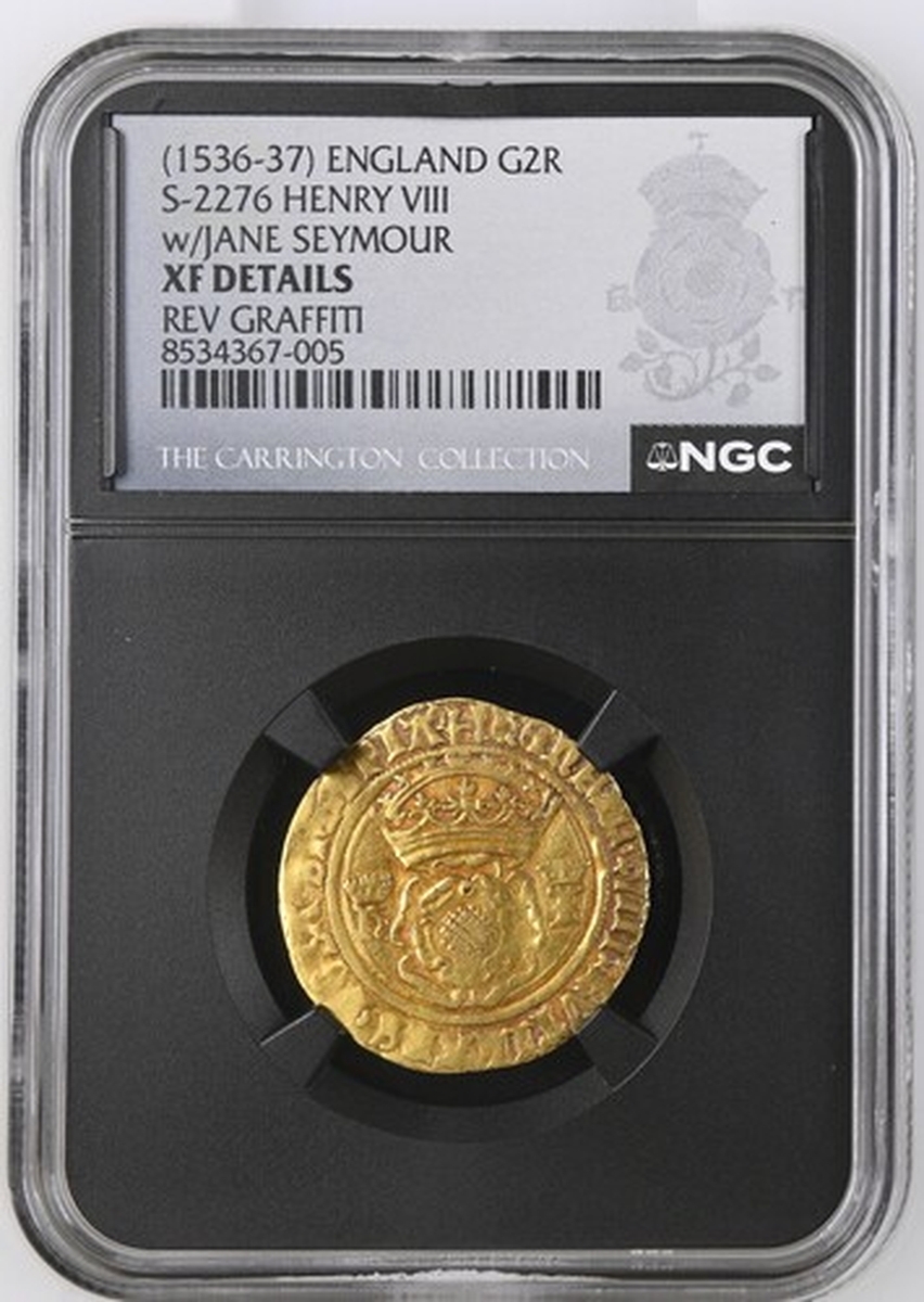 (x) NGC XF | Henry VIII, with Jane Seymour (1509-1547), Second Coinage, Crown of the Double Rose, Tower (London), (m.m.) hENRIC ?x VIII ?x RVTILANS x ROSA x SINE x SPIA, crowned rose dividing h-I, rev. (m.m.) DEI ': G ': R ': AGLIE ': Z : FRANC ': DNS '. hIBER ', crowned shield, dividing h-R, 3.602g [55.587grns], 9h, m.m. arrow (Schneider I, 595; North 1791/1788 S.2276), minor graffito in reverse field and with typical peripheral striking softness, otherwise with rich honey-golden and lustrous residual cabinet tone, a bolder very fine, in NGC Black 'Carrington' holder, graded Extremely Fine (Cert. #8534367-005)