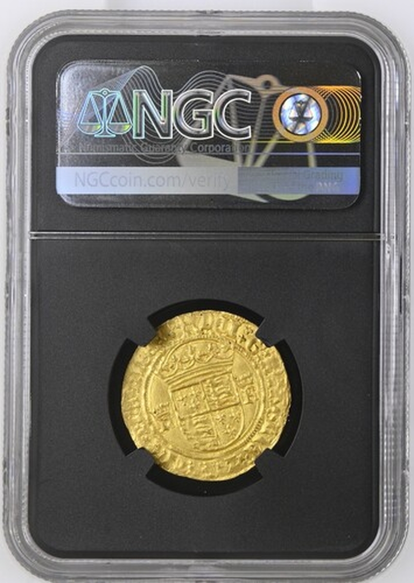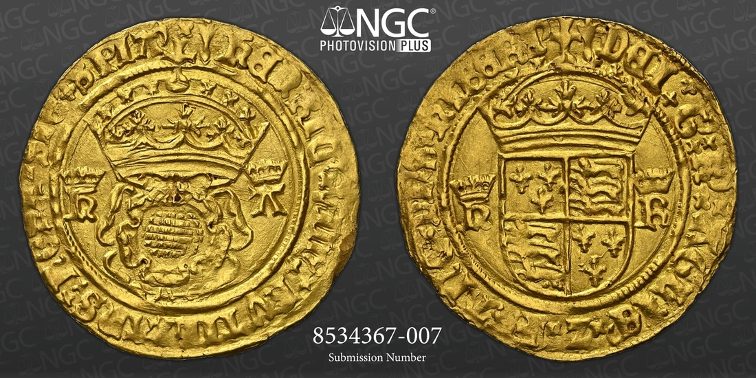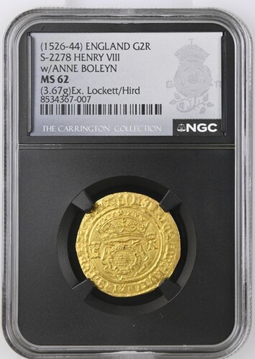 (x) NGC MS62 | Henry VIII, with Anne Boleyn (1509-1547), Second Coinage, Crown of the Double Rose, Tower (London), (m.m.) hENRIC ?x VIII ?x RVTILAnS : ROSA x SINE x SPIA' crowned rose dividing h-A, rev. (m.m.) DEI : G ': R ': AGLIE '. Z .' FRANC '. DNS '. hIBERI ', crowned shield dividing h-R, 3.655g [56.405grns], 10h, m.m. arrow (Schneider I, 593; North 1789/1791; S.2278), bright and with a hint of peripheral striking softness, otherwise splendidly choice for issue, good extremely fine and truly much as issued, in NGC Black 'Carrington' holder, graded MS62 (Cert. #8534367-007)