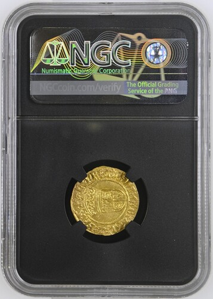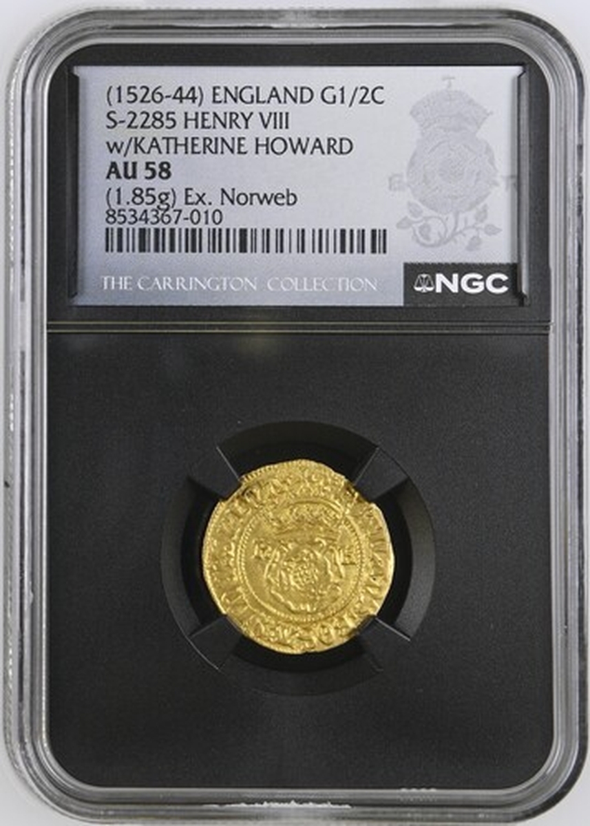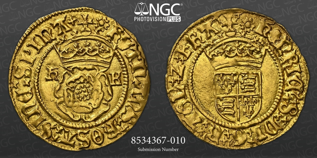 (x) NGC AU58 | Henry VIII, with Katharine of Aragon or Katharine Howard (1509-1547), Second Coinage, Gold Halfcrown of the Double Rose, Tower (London), (m.m) hENRIC ?: 8 : DI ': G ': R ': AGL ': Z : FRA', single and double saltire stops, crowned shield, fields plain, rev. (m.m) RVTILANS : ROSA : SINE : SPINA :, double saltire stops, crowned double Tudor rose, dividing h-K, 1.835g [28.20grns], 9h, m.m. rose (Drabble I, 133 same dies; Schneider I, 600; North 1794; S.2285), bright and lustrous, a most pleasingly bold very fine, rare thus, in NGC Black 'Carrington' holder, graded AU58 (Cert. #8534367-010)