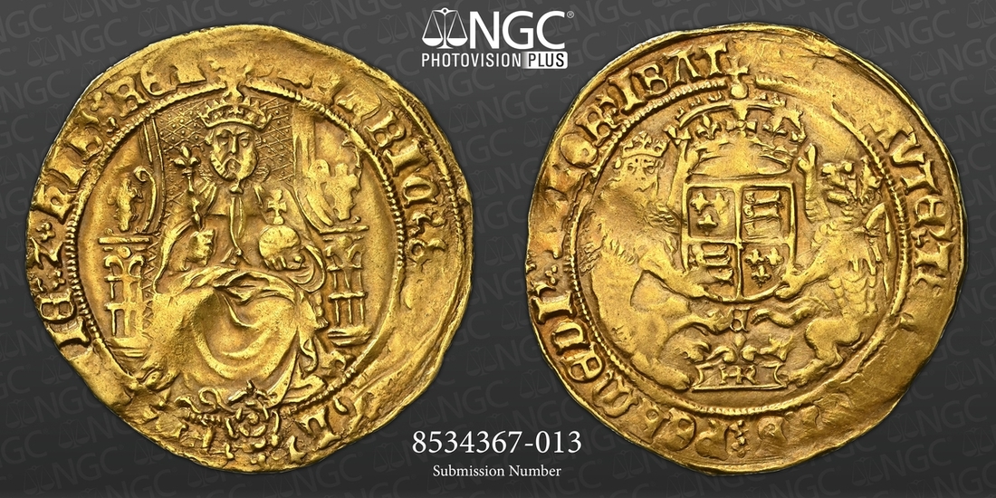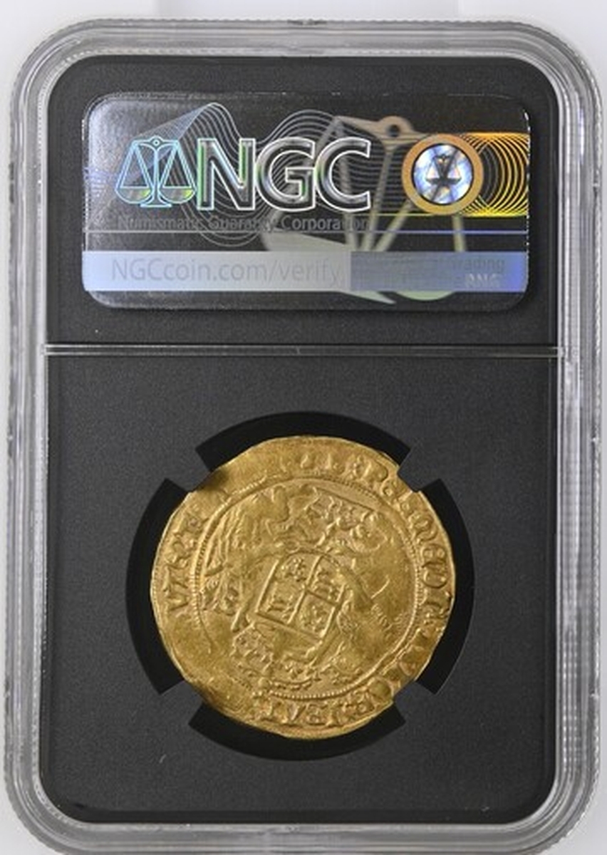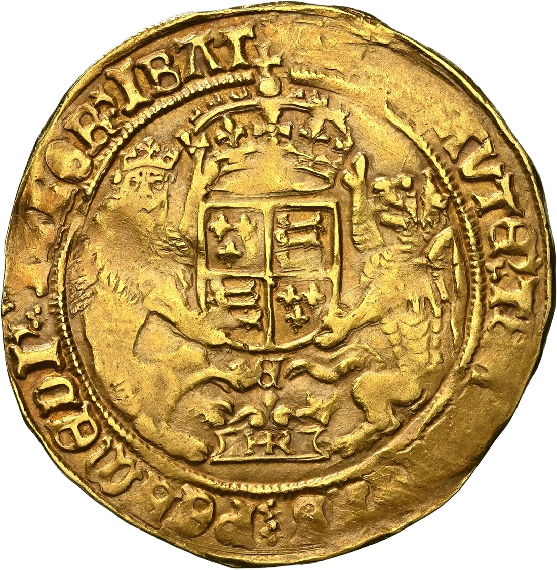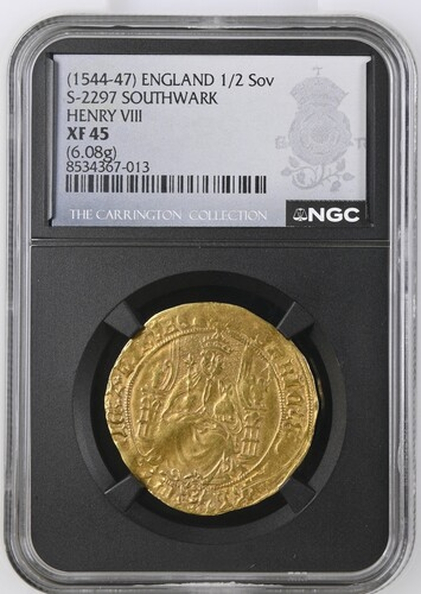 (x) NGC XF45 | Henry VIII (1509-1547), Third Coinage, Half-Sovereign, 1544-1547, Southwark (London), (m.m.) hENRIC .' 8 D G AGL' | FRANCIE . Z . hIB ': REX, quatrefoil stops, King enthroned, holding orb and sceptre, Tudor Rose below, rev. (m.m.) [IhS :] AVTE : TRANSIENS : PER MEDI '. ILLOR .' IBAT, crowned shield with lion and griffin supporters, E below, HR in exergue, 6.057g [93.474grns], 7h (Brooke II; VJE Ryan 144; Schneider I, - [cf. 621]; North 1828; S.2297), light wave through flan, with typical softness of strike to peripheries, otherwise of excellent metal and the key devices superbly bold, especially so to the iconic 'Holbeinesque' portrait so oft obliterated on this type, a really good very fine for issue, the colourful cabinet tone superbly accentuating the finest details, in NGC Black 'Carrington' holder, harshly graded XF45 (Cert. #8534367-013)