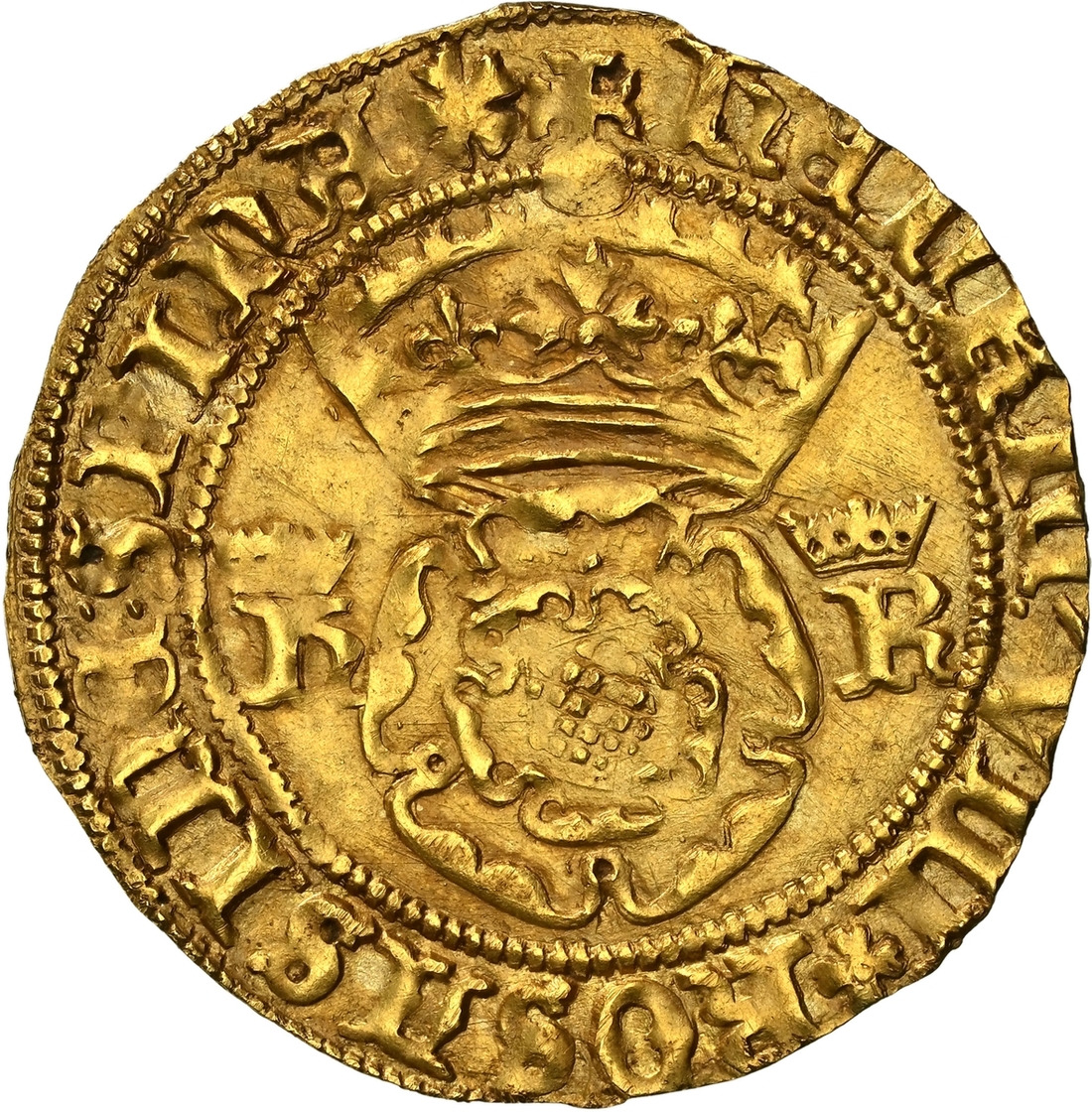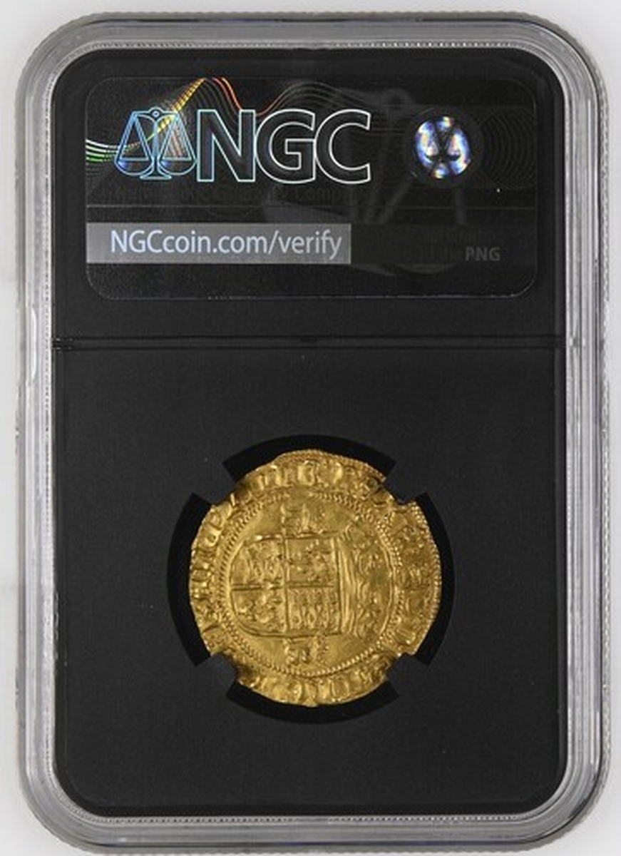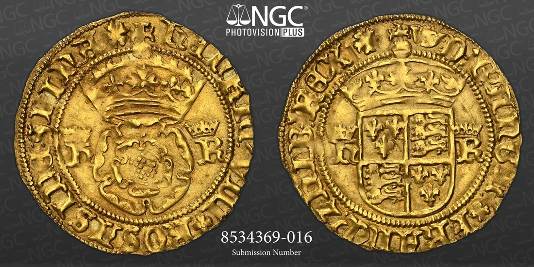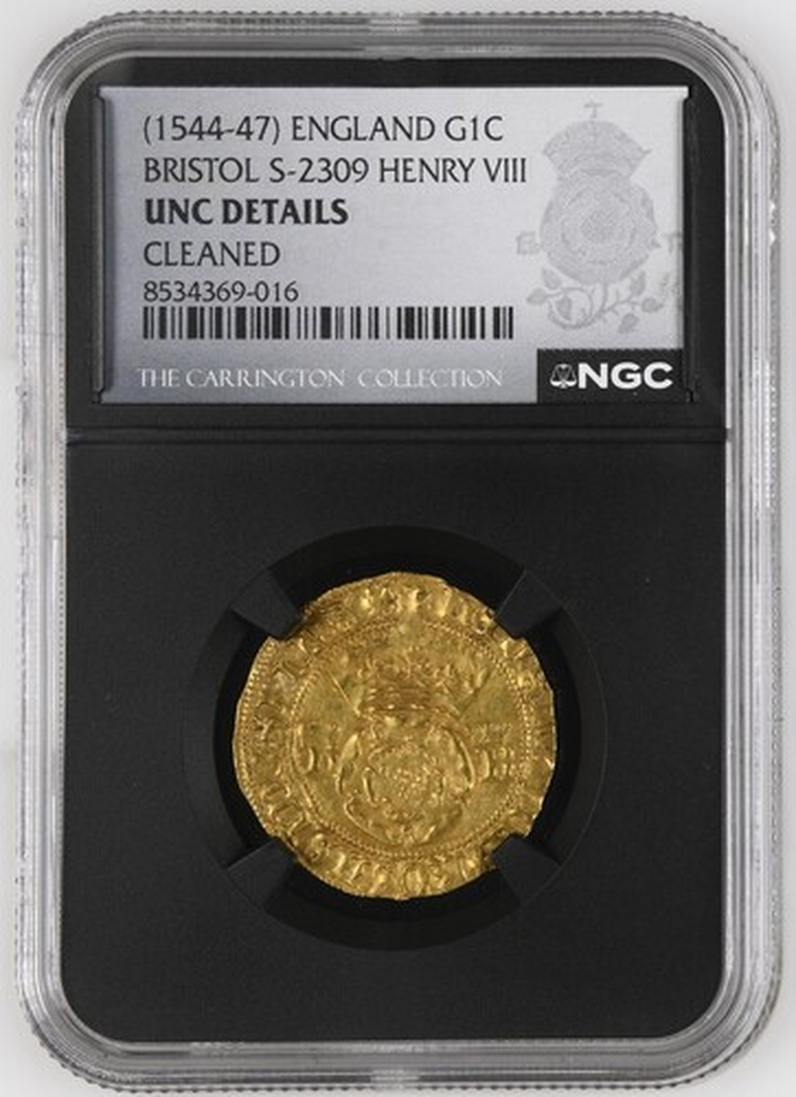 (x) NGC UNC | Henry VIII (1509-1547), Third Coinage, Crown of the Double Rose, Bristol Castle, William Sharrington, hENRIC ? VIII * ROSA SINE : SPInA *, crowned double-rose dividing crowned h-R, rev. (m.m.) : D:' G .' AnGLIE .'*: FRAnC .' Z . hIB .' REX *, crowned square topped shield dividing crowned h-R, 3.053g [47.115grns], 3h, m.m. -/WS (Schneider I, 640; North 1836; S.2309), a small graffito mark in reverse field, otherwise a most pleasingly uniform strike with fiery gold toning in recesses, a really attractively bold very fine to about extremely fine and truly much as issued, scarce thus, in NGC Black 'Carrington' holder, graded Uncirculated (Cert. #8534369-016)
