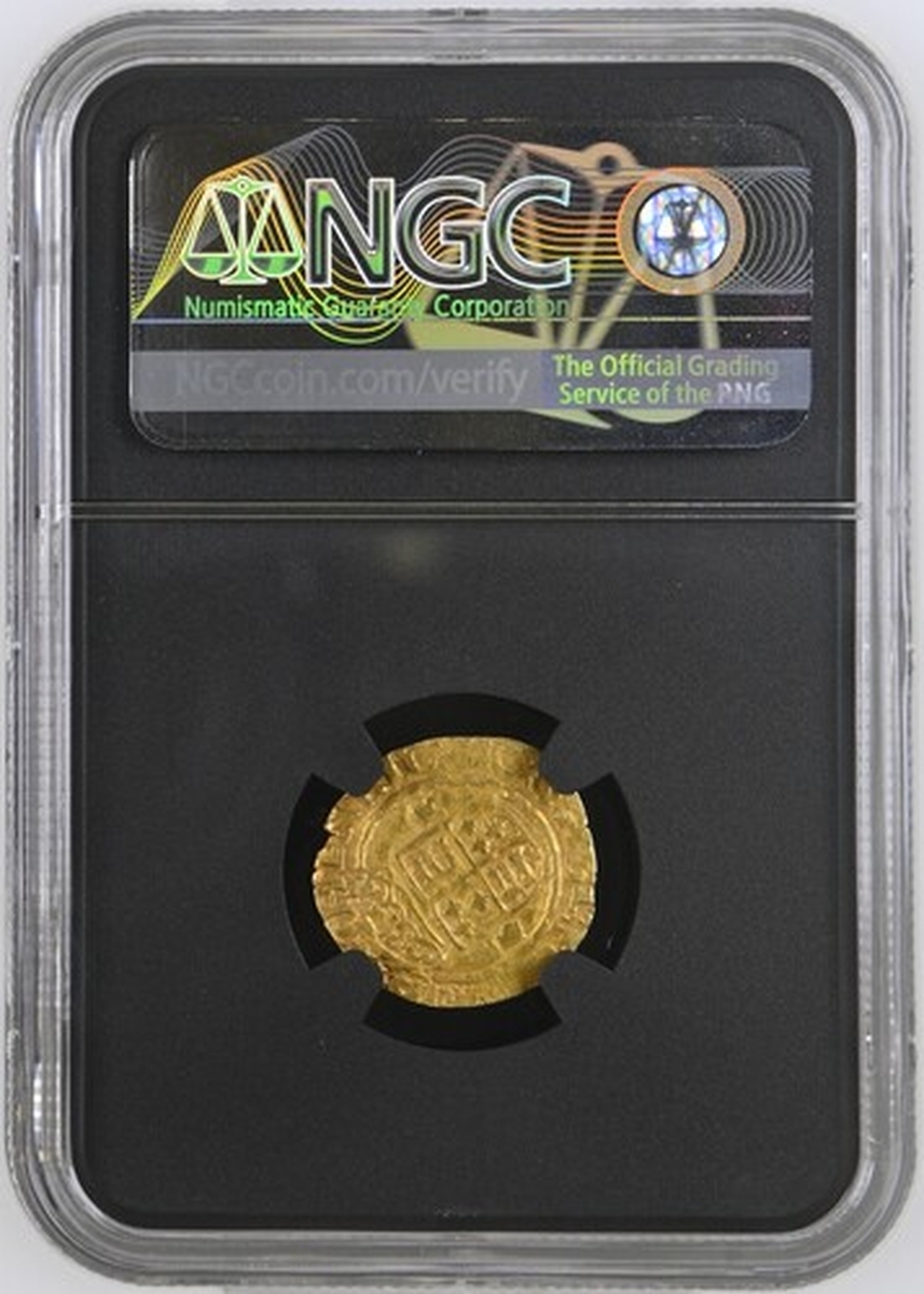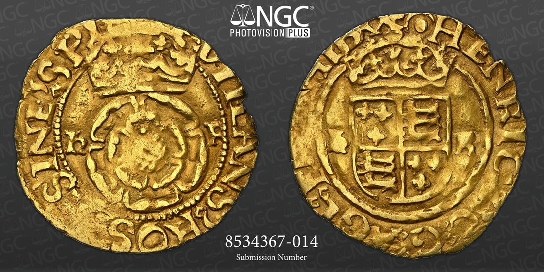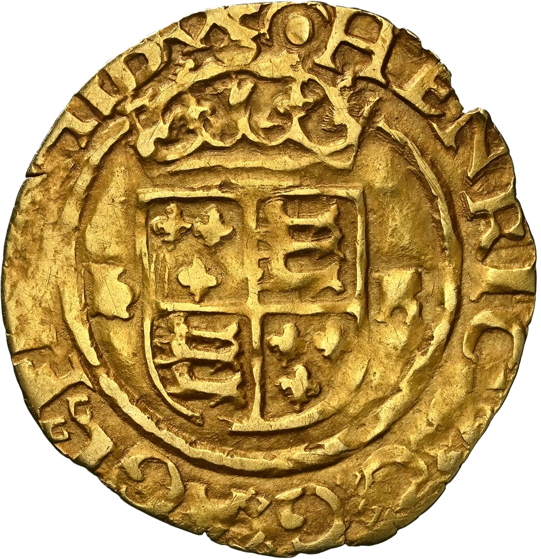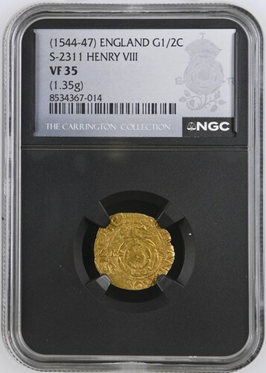 (x) NGC VF35 | Henry VIII (1509-1547), Third Coinage, Gold Halfcrown, 1544-1547, Tower (London), RVTILAnS .' ROSA : SINE .' SPInA, crowned-double rose, dividing h-R, rev. (m.m.) HENRIC '• 8 : D '• G '• AGL : FR '• Z • hIB '• REX, single saltire stops, crowned shield, dividing h-R, 1.349g [20.818grns], 8h, m.m. pellet in annulet (Schneider I, 638; North 1837; S.2311), on a short, irregular flan, otherwise handsomely and honestly cabinet toned, a really bold fine to almost very fine in parts, in NGC Black 'Carrington' holder, graded VF35 (Cert. #8534367-014)
