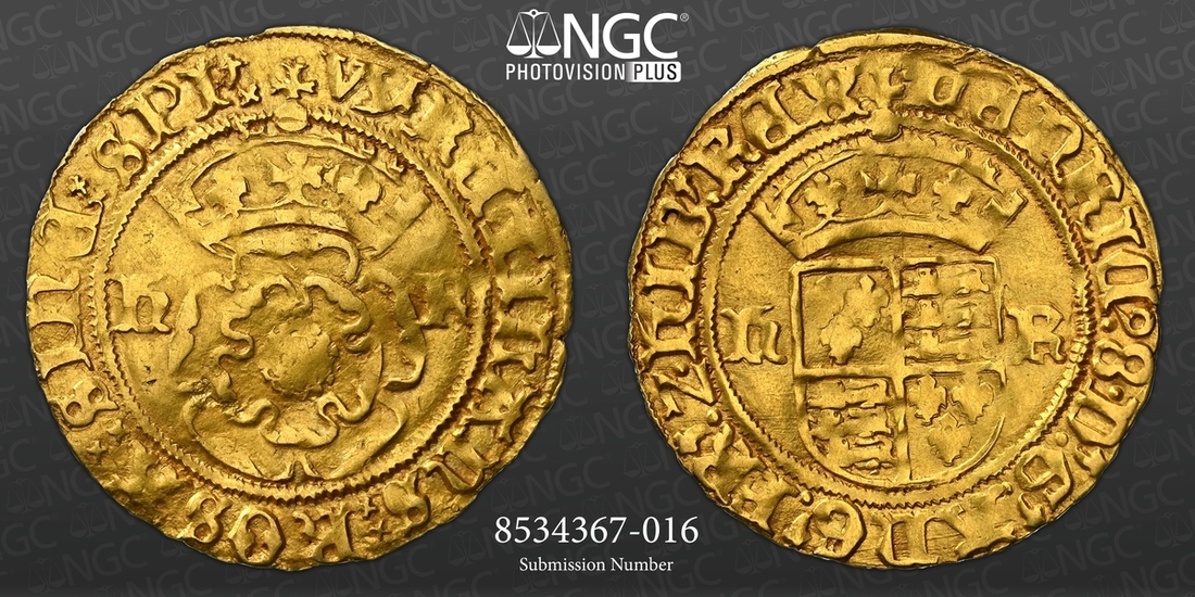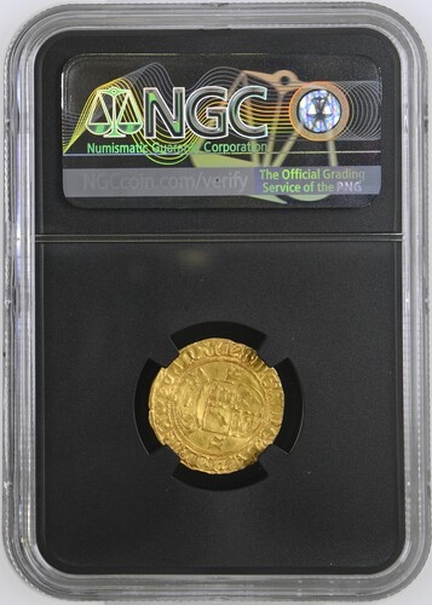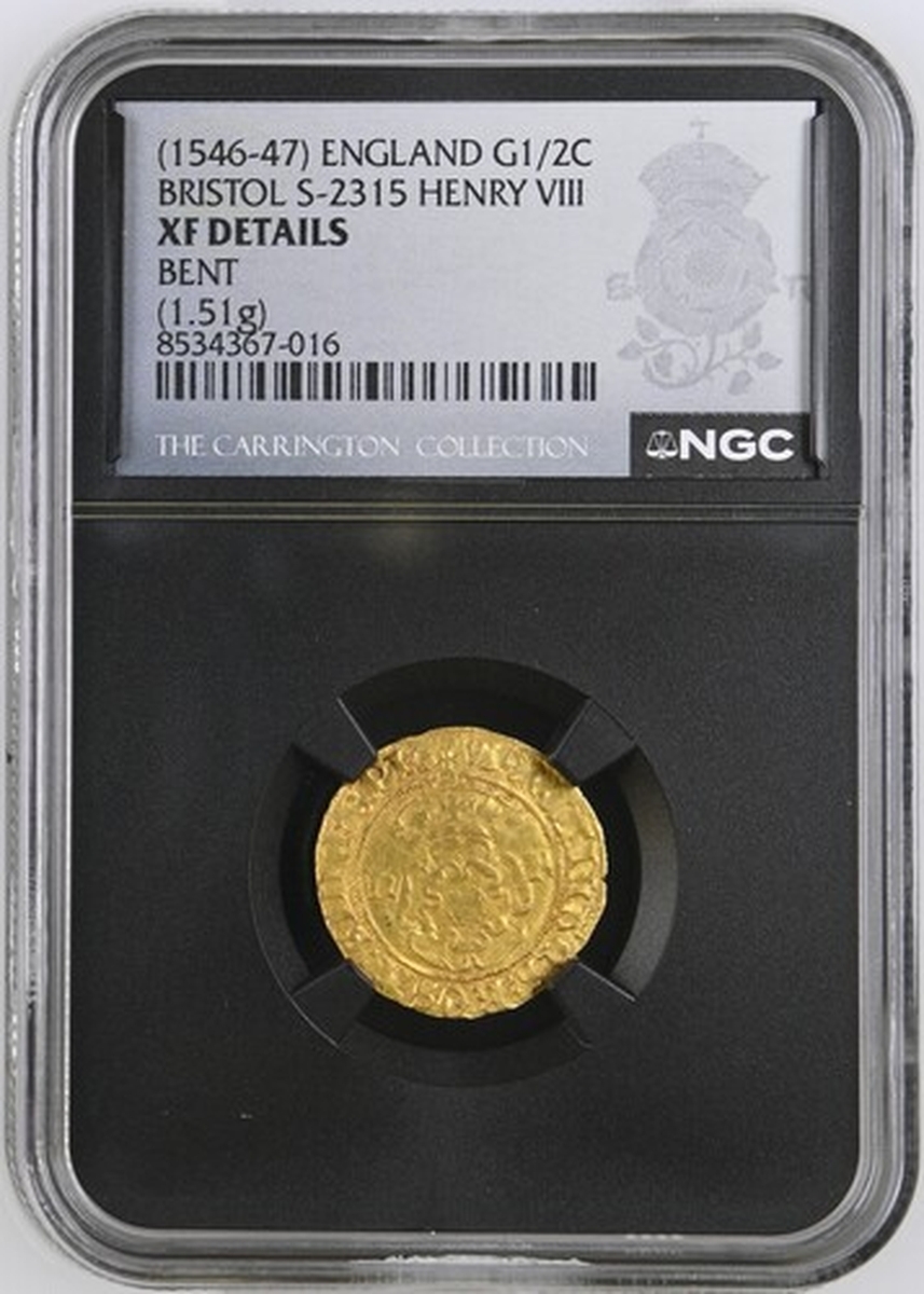(x) NGC XF | Henry VIII (1509-1547), Third Coinage, Gold Halfcrown, 1546-1547, Bristol Castle, Under-Treasurer William Sharrington, hENRIC ? 8 • D .' G .' AnG .' FR .' Z • hIB .' REX, crowned shield, dividing h-R, rev. (m.m.) RVTILAnS : ROSA : SInE . SPI '., pellet stops, crowned double rose, dividing h-R, 1.506g [23.241grns], 10h, m.m. -/WS (Schneider I, 641; North 1839; S.2315), slight wave to an otherwise perfectly round flan, of a paler, baser gold fabric as typical for issue, otherwise largely uniform for strike, very fine or better and equally rare, in NGC Black 'Carrington' holder, graded Extremely Fine (Cert. #8534367-016)