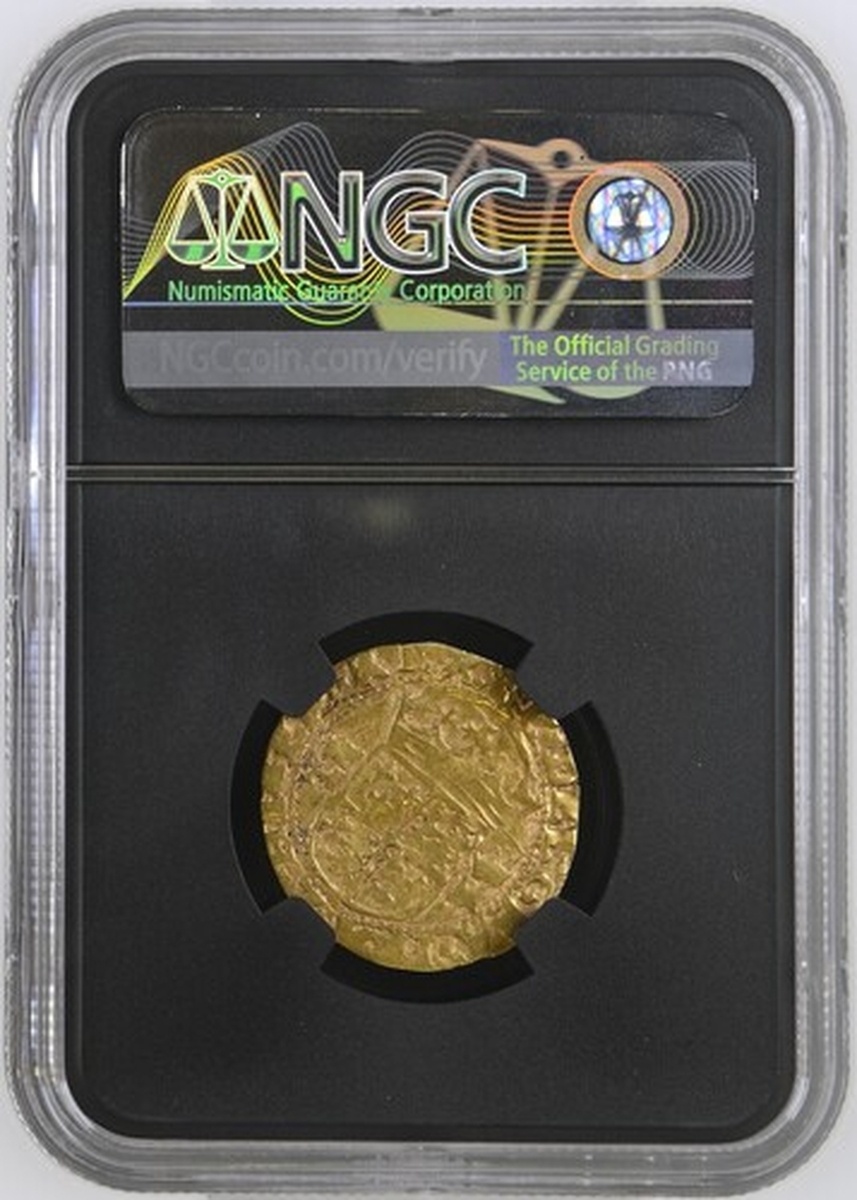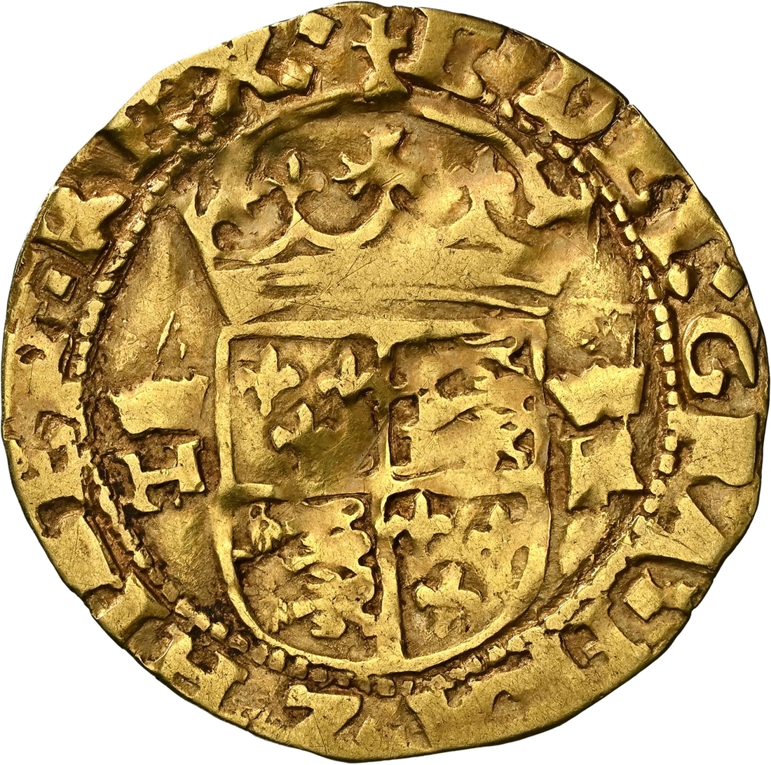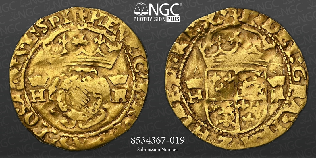 (x) NGC VF | Henry VIII (1509-1547), Posthumous Issue, Gold Crown, 1547-1549, Southwark (London), HENRIC ' 8 .' RVTILANS .' ROSA SINE .' SPI, crowned double rose, rev. (m.m.) DEI : GRA .' FRA . Z .' HIBER . REX :, lozenge stops, crowned square-topped shield dividing crowned roman H-R, 2.945g [45.44grns], 2h, m.m. -/E (Schneider I, 667; North 1868; S.2398), softly struck as usual for issue, and with subtle traces of flan crimping, otherwise naturally toned, strictly fine or marginally bolder, in NGC Black 'Carrington' holder, graded Very Fine (Cert. #8534367-019)