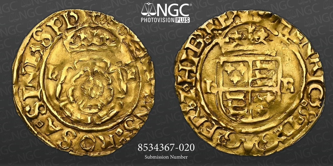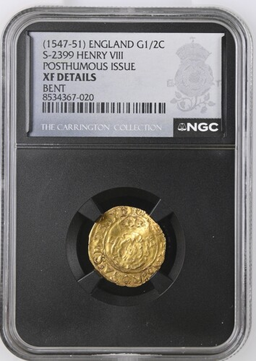 (x) NGC XF | Henry VIII (1509-1547), Posthumous Issue, Gold Halfcrown, 1547-1549, Tower (London), (m.m.) RVTILANS : ROSA . SINE .' SPI', crowned rose dividing h-R, rev. (m.m.) HENRIC .' 8 . D .' G .' AG .' FR '. Z . HIB .' REX, lozenge stops, Roman letters, crowned shield dividing H-R, 1.550g [23.92grns], 9h, m.m. grapple (Schneider I, 655, North 1869; S.2399), subtly crimped on a shorter flan, otherwise naturally cabinet toned and playfully lustrous, a most wholesome very fine, in NGC Black 'Carrington' holder, graded Extremely Fine (Cert. #8534367-020)