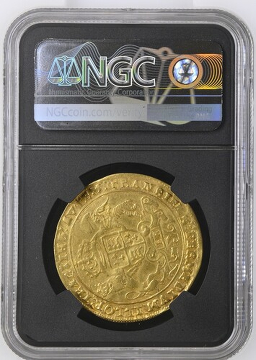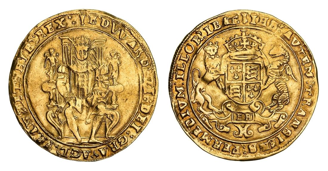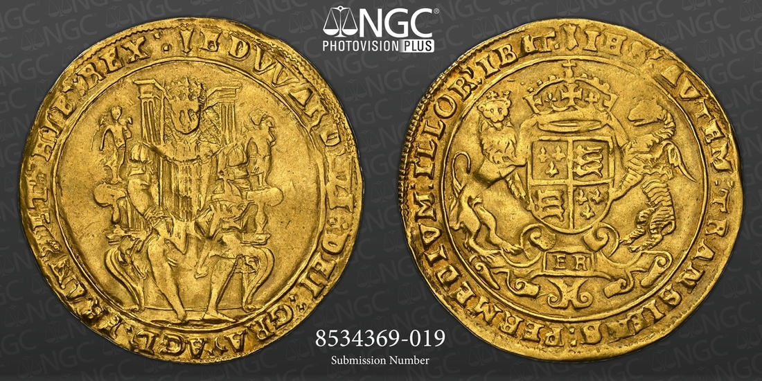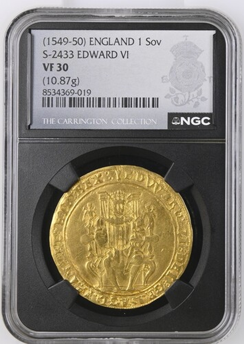 (x) NGC VF30 | Edward VI (1547-1553), Second Period, Sovereign, January 1548/9 - June 1549 [OS], Tower (London), Under-Treasurer, Sir Martin Bowes, (m.m.) EDWARD .' VI : DEI : GRA '. AGL '. FRAN .' ET : HIB ': REX :, Edward seated facing on decorated throne, holding upraised sword and orb, small square stops, rev. (m.m.) IHS .' AVTEM : TRANSIENS : PER MEDIVM : ILLOR .' IBAT : Royal coat-of-arms with crowned leopard and griffin supporters; all set on ornate frame with central titulus inscribed E-R, small square stops, 10.846g [167.1grns], 1h, m.m. arrow / arrow over inverted arrow (Snelling, Pl. III, - [no. 12 for type]; Ruding, Pl. VII, - [no. 2 for type]; Cuff [1854], -; Kenyon [1884], p. 109 and Pl. X, 70 var.; Montagu [1896] -; Murdoch I, 461 same dies [167.5grns]; Bruun [1925] -; Earl of Ducie [1949], 15 = Rashleigh [1953], 28 = M W Hall [1963], 122 = Thos H Law, 20072 same dies; Raynes [1950] -; Ryan [1950] -; Lockett [1956], 1857 = Dabney-Thompson = SNC, April 1973, no. 3078 same dies; Hird -; Beresford-Jones 42 same dies; Baumhauer III, 1074 same dies; Potter, p. 135; Schneider I, 668 same dies; North 1906; S.2433), slightly crimped and lightly wiped, otherwise residually lustrous with a hint of cabinet tone, almost very fine, an extremely rare variety with only EIGHT examples recorded, in NGC Black 'Carrington' holder, graded VF30 (Cert. #8534369-019)