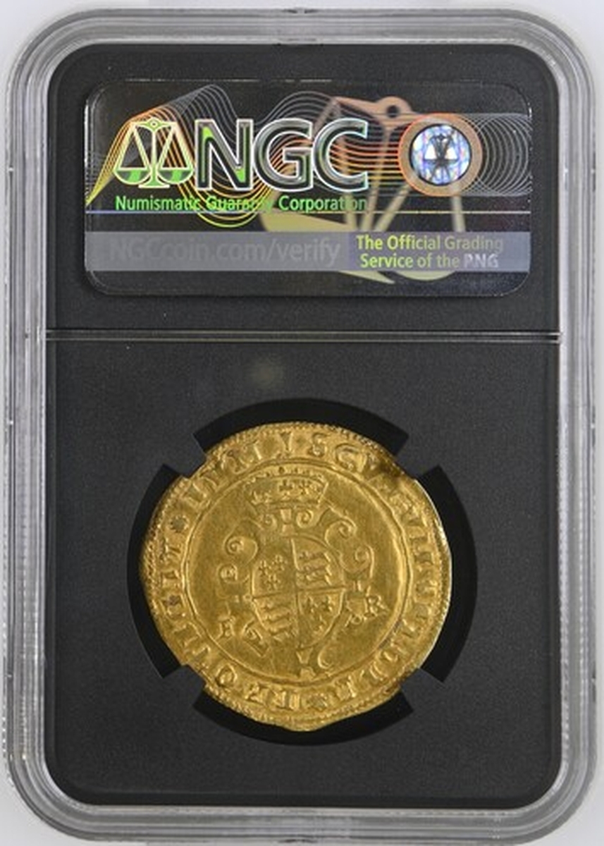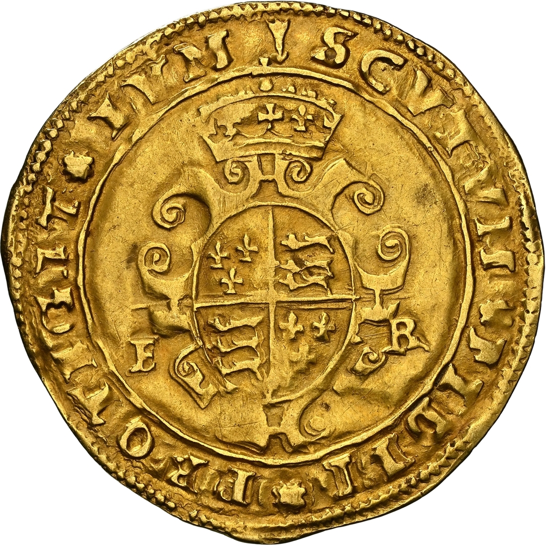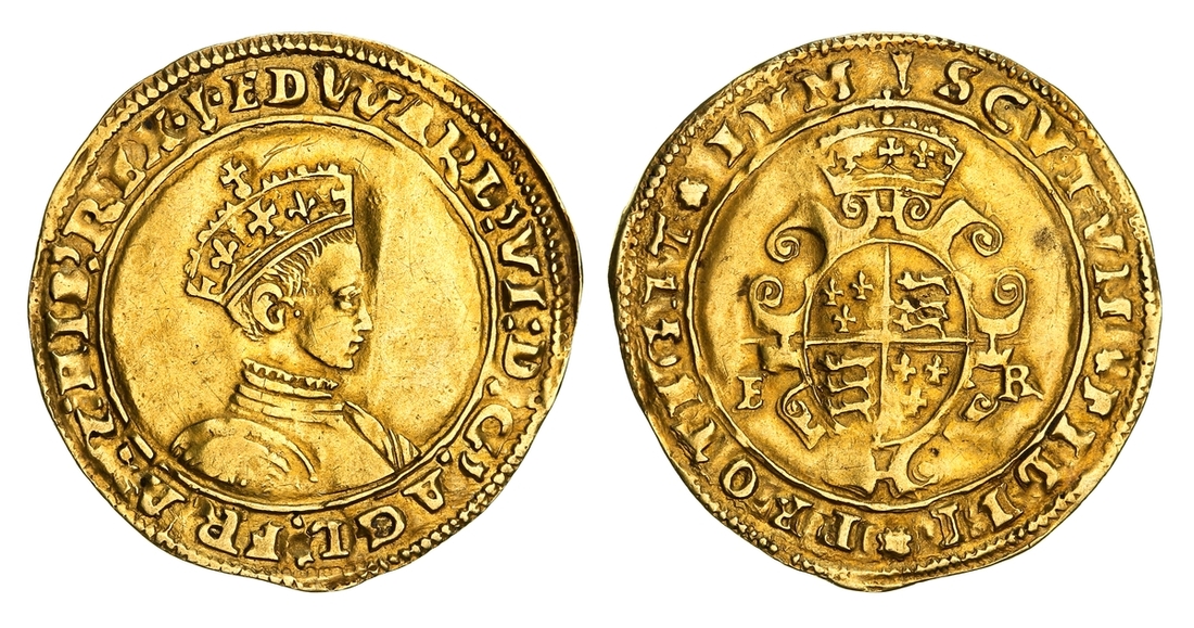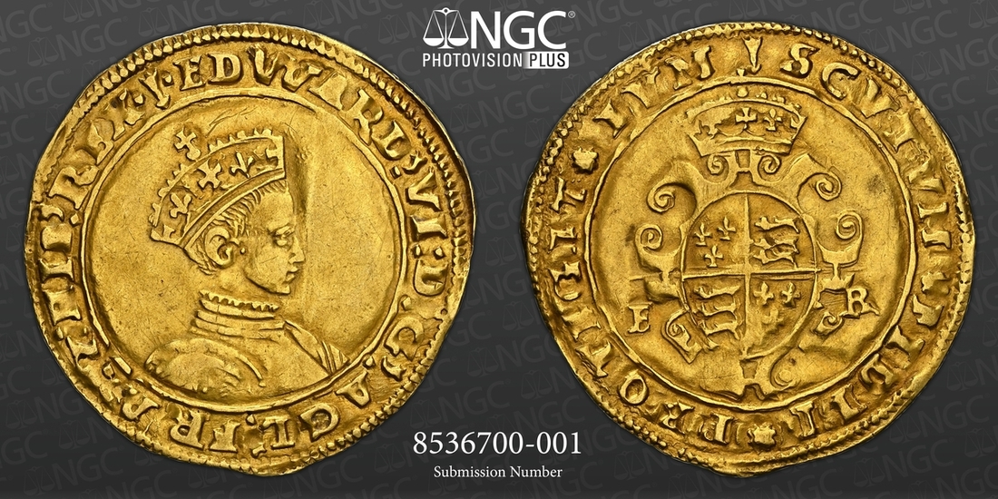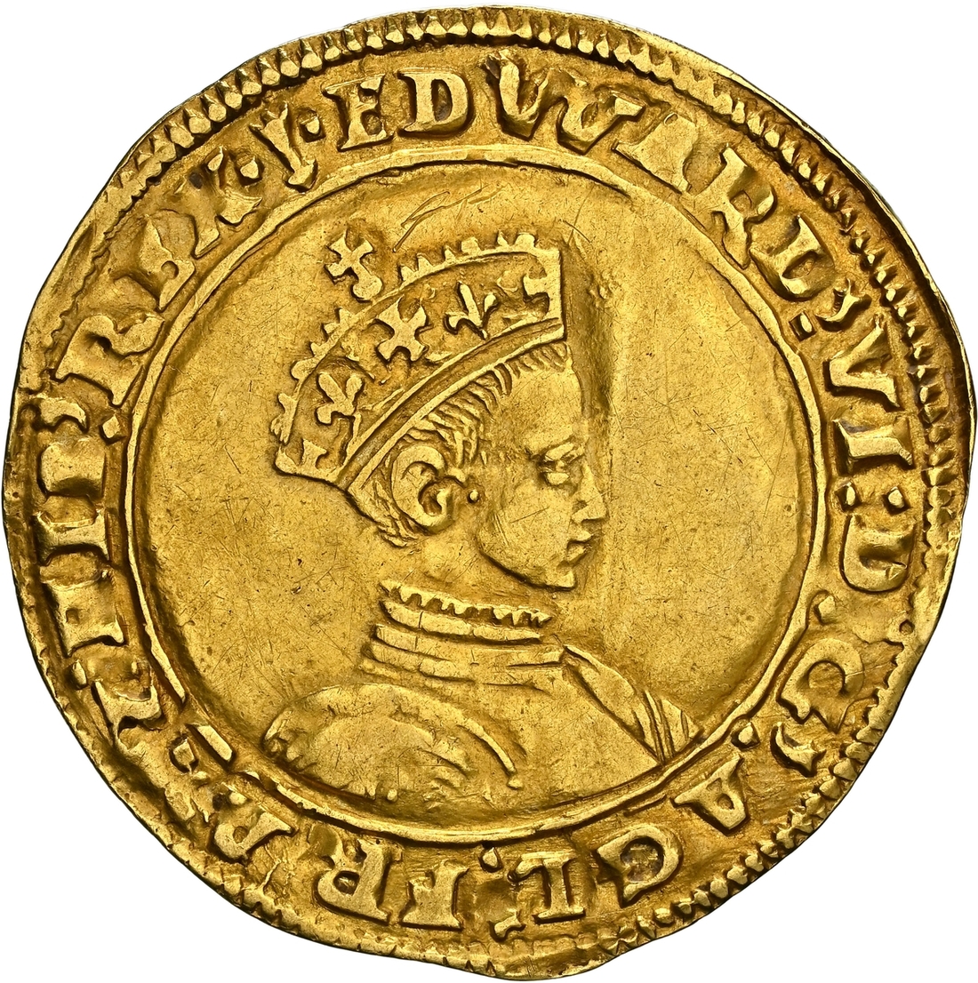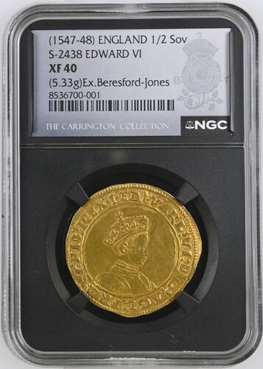 (x) NGC XF40 | Edward VI (1547-1553), Second Period, Second Issue, Half-Sovereign, 12 April 1549 - April 1550, Tower (London), (m.m.) . EDWARD.' VI : D.'G.' AGL.' FRA.' Z: HIB.' REX ., small square stops, crowned and cuirassed bust right, rev. (m.m.) SCVTVM* FIDEI* PROTEGET* EVM, rosette stops, crowned oval shield dividing E-R, 5.316g [82.03grns], 12h, m.m. arrow (Schneider I, 672; North 1911; S.2438), deft traces of crimping and tiny scuffs above crown, otherwise on a handsomely full flan and largely uniform for strike, with playful hues of honey-orange tone, an attractive very fine, in NGC Black 'Carrington' holder, graded XF40 (Cert. #8536700-001)