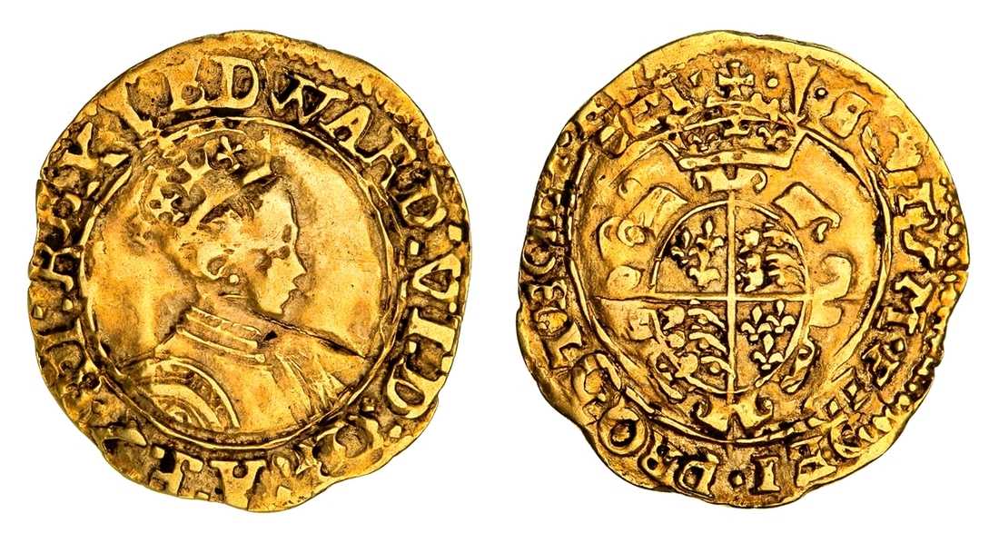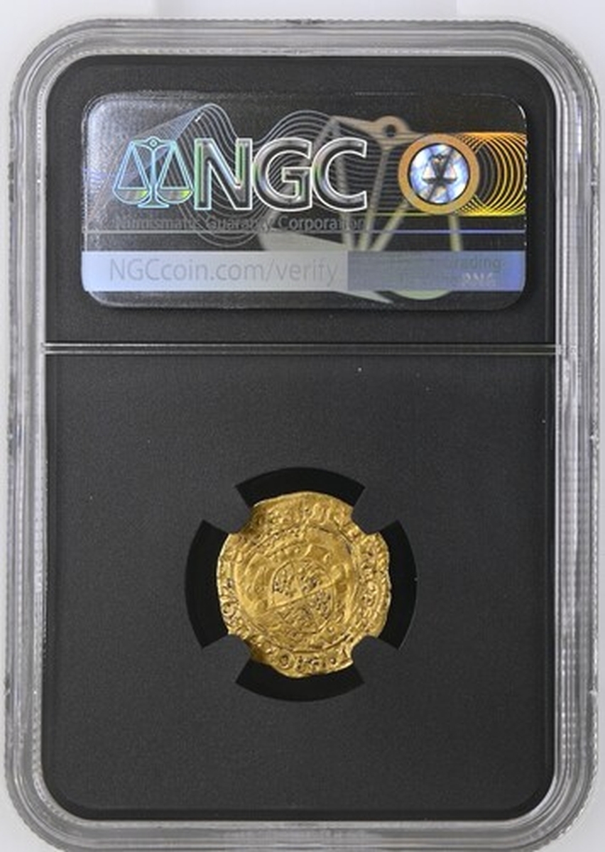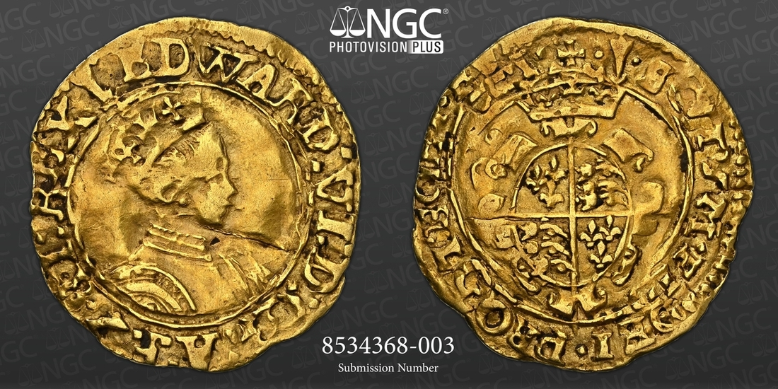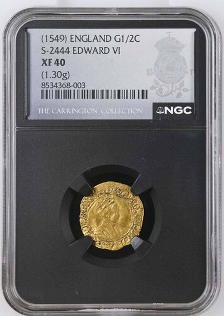 (x) NGC XF40 | Edward VI (1547-1553), Second Period, Second Issue, Gold Halfcrown (or Eighth Sovereign), 12 April 1549 - April 1550, Tower (London), (m.m.) EDWARD : VI : D : G : A : F : Z : HI : REX, young crowned bust right, with plain breast armour, rev. (m.m.) SCVTVM . FIDEI . PROTEGET . EVM, crowned oval garnished shield, small square stops, 1.296g [20.00grns], 11h, m.m. arrow [both sides] (Rud. VII, 6; Sir Henry Russell [1850] = Brice = Murchison [1864], 160 = Bergne [1873], 551 = Brice = Montagu [1896], 802 = Roth 265* = Lockett 4363* = Norweb 912* same dies; Lord Grantley 1514* same dies; Schneider I, 679; North 1916; S.2444), overtly double-struck to reverse, with a hairline split in portrait and crimping to flan, otherwise with an attractive old cabinet tone, very rare, in NGC Black 'Carrington' holder, graded XF40 (Cert. #8534368-003)