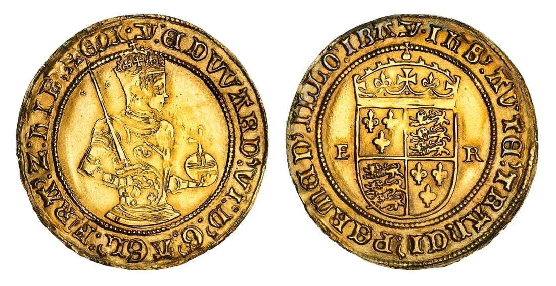(x) Edward VI (1547-1553), Third Period, Half-Sovereign, 1551, Southwark (London), under Sir John Yorke, (m.m.) : EDWARD '. VI : D '. G '. AGL ': FRA '. Z : hIB '. REX ., half length figure of King in armour right, carrying sword and orb, rev (m.m.) . IHS .' AVTE .' TRANCI .' PER MED '. ILLO '. IBA, crowned square shield with E-R at sides, crown not frosted, large lettering, double pellet/pellet stops, 5.569g [85.94grns], 10h, m.m. y (VJE Ryan 252 = King 39; Schneider I, - cf. 693; North 1928; S.2451), lightly gilt and the edges made round from past lunette-mounting, otherwise uniformly struck on a remarkably full flan, an attractive and bolder very fine, a rare issue under this mintmark
