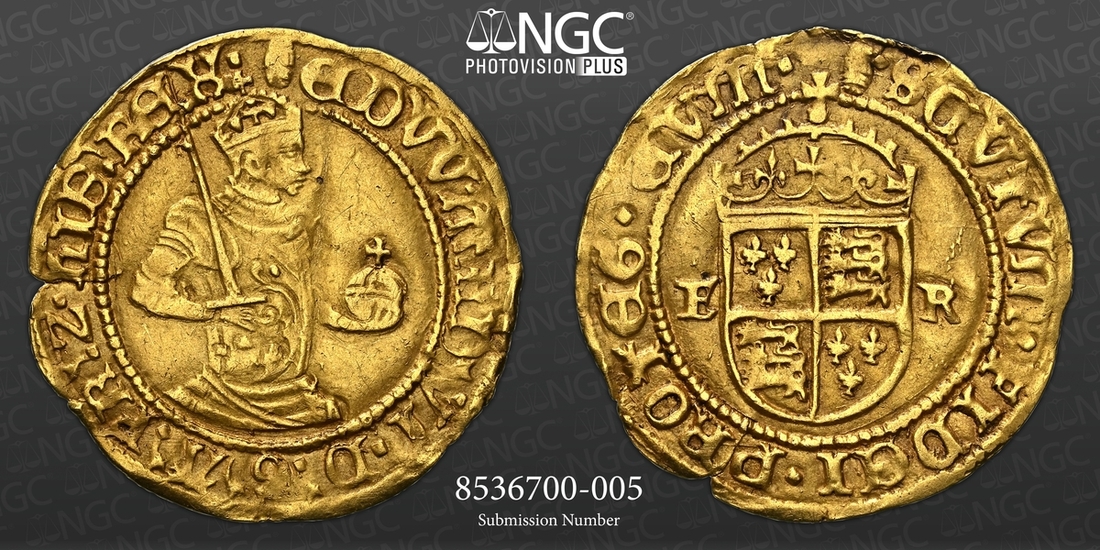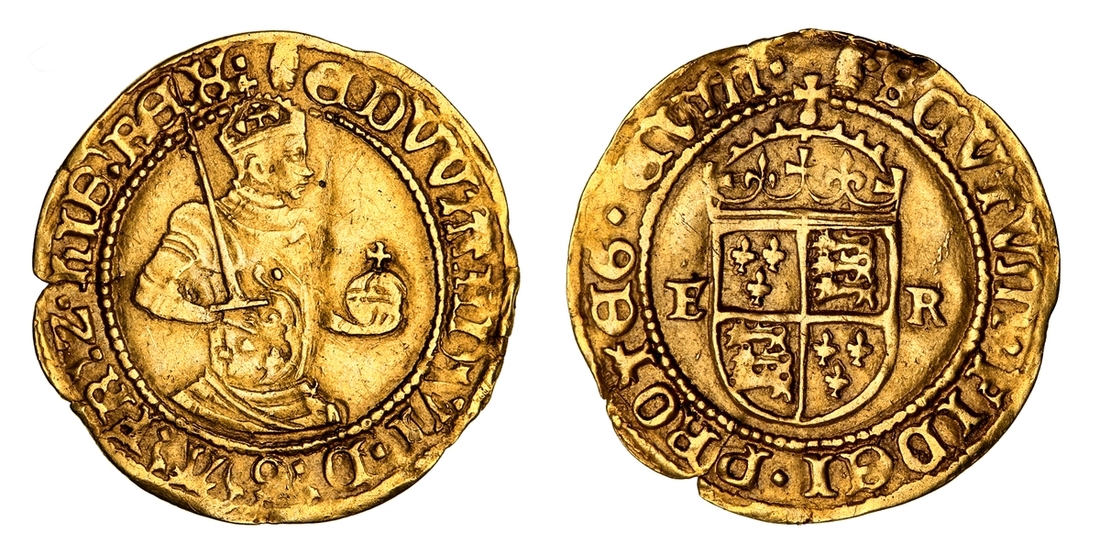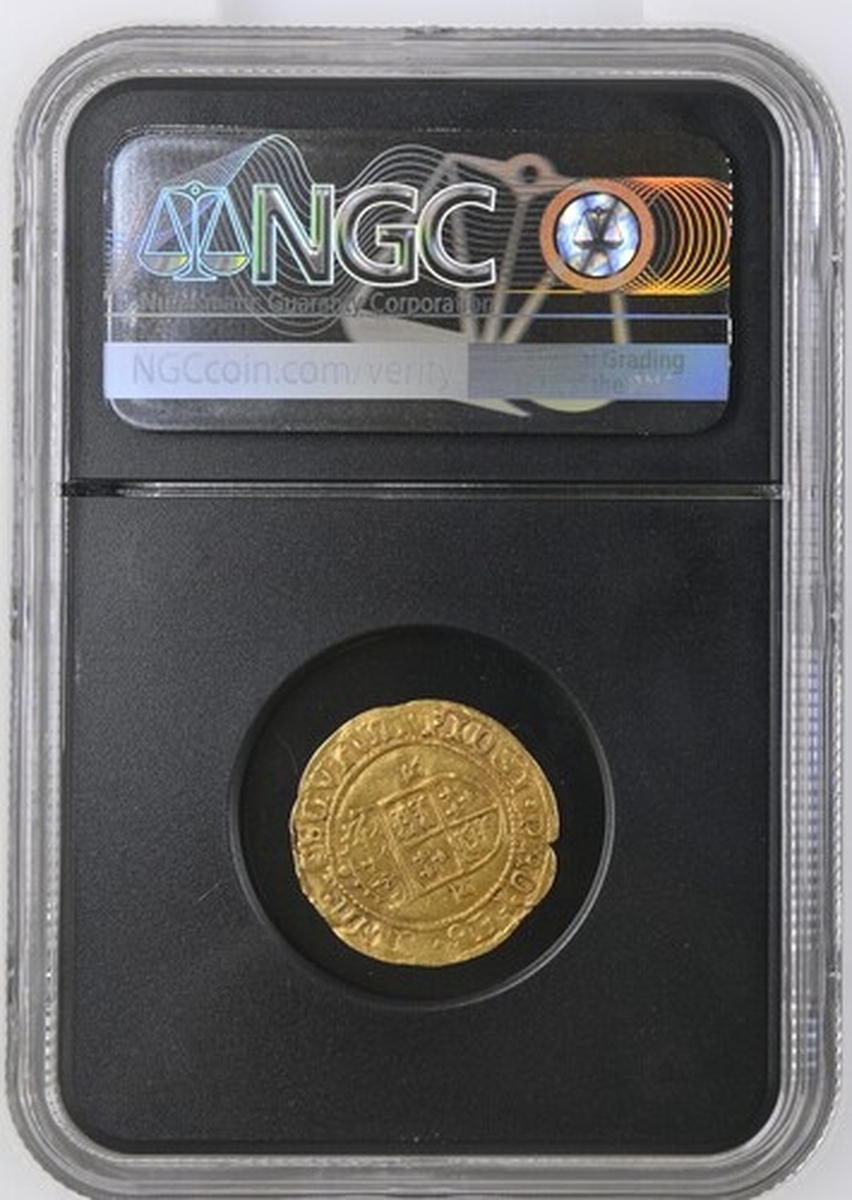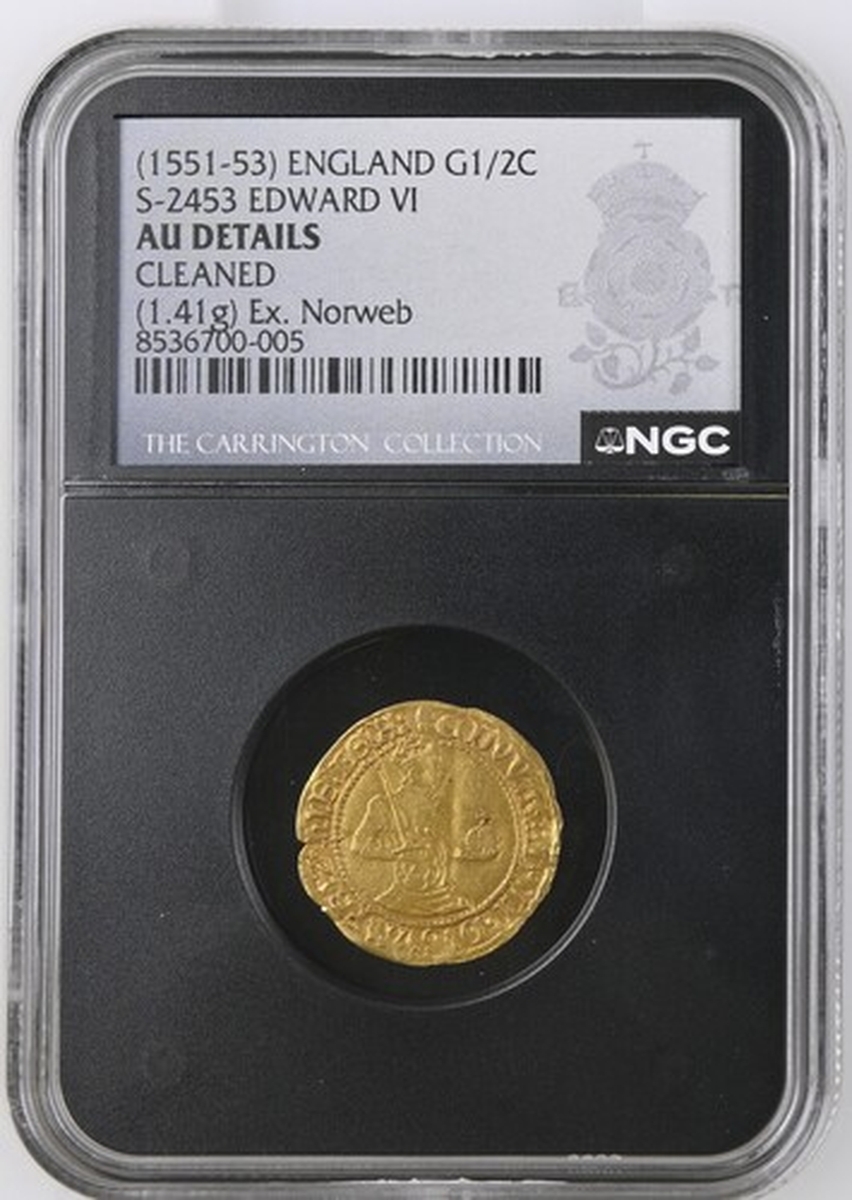 (x) NGC AU | Edward VI (1547-1553), Third Period, Gold Halfcrown or 'Half-Quarter' (Eighth of a) Sovereign, 1551-1553, Tower (London), (m.m.) EDVVARD ' VI • D '. G ' A '. FR '. Z • hIB .' REX •, lozenge stops, half-length figure of King right, holding orb and sceptre, rev. (m.m.) • SCVTVM • FIDEI • PROTEGE • EVM •, crowned square-topped shield dividing E-R, 1.416g [21.8grns], 8h, m.m. tun (Tyssen 1660(c); Murchison = Shepherd = Montagu I, 813 = Murdoch I, 489 = Hilton-Price 116 same dies; Vaughan-Morgan = Raynes 105 same dies; Glendining, 21 July 1911, lot 69 = SNC, October 1911, 91874* = Virgil Brand = Lockett II, 1880* = HCN 68 = AHH Virtual 56 = Simon English 173 same dies; Ryan 255 = Schneider I, 699 same dies; Norweb 913 this coin; North 1930; S.2453), hairline split at 9 o'clock, otherwise uniformly struck on a neater round flan, a pleasing and bolder very fine and of the utmost rarity, but five examples being known, in NGC Black 'Carrington' holder, graded Almost Uncirculated (Cert. #8536700-005)