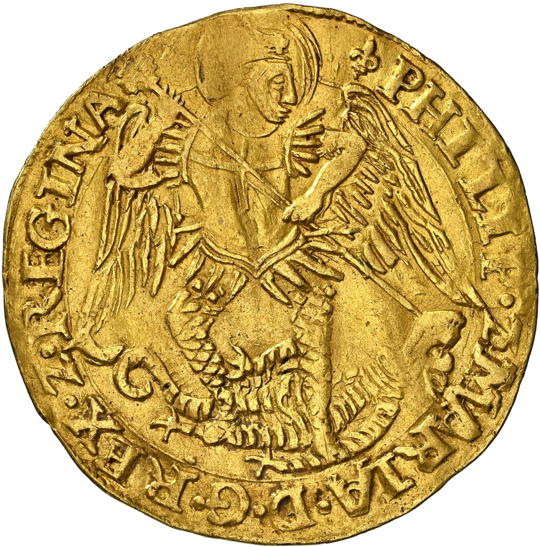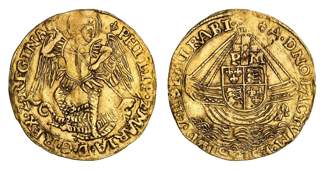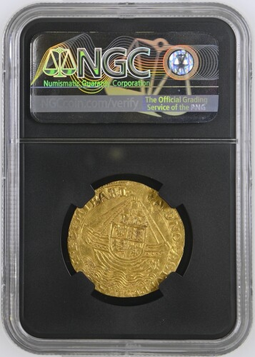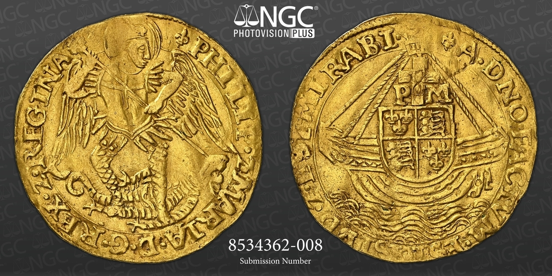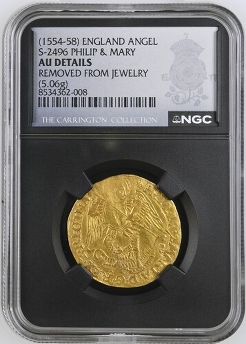 (x) NGC AU | Mary and Philip (1554-1558), Old Style, Angel, Tower (London), (m.m.) PHILIP • Z • MARIA • D • G • REX • Z • REGINA, St Michael vanquishing Dragon, with long wings, rev. (m.m.) A • DNO FACTVM • EST • ISTVD • Z • EST MIRABI •, ship surmounted by square-topped shield and mast dividing P and M, wire line inner circles both sides, 5.033g [77.62grns], 12h, m.m. lys (Scheider I, 726; North 1965; S.2496), light scuffing and subtle crimping to an otherwise broad round planchet, with much lustre adorning the unfurled Angelic wings, a bolder very fine, rare, in NGC Black 'Carrington' holder, graded Almost Uncirculated (Cert. #8534362-008)