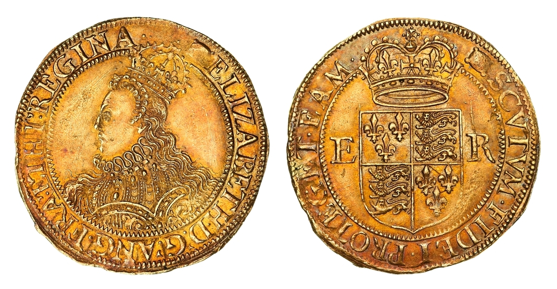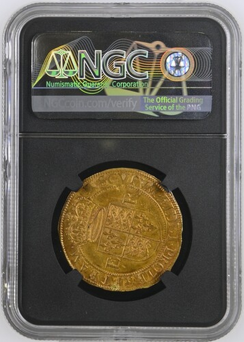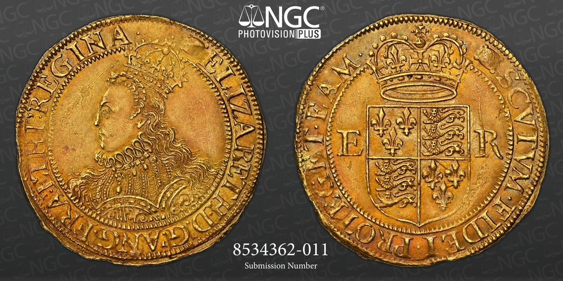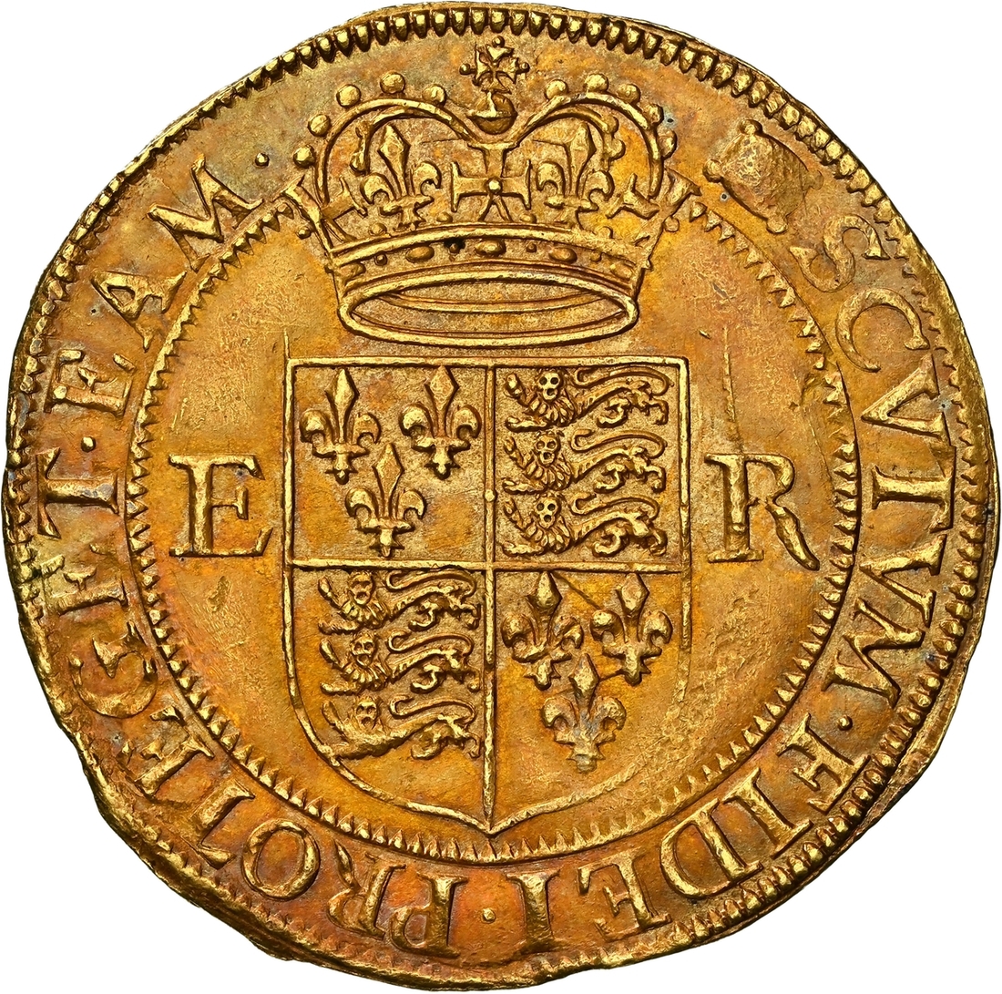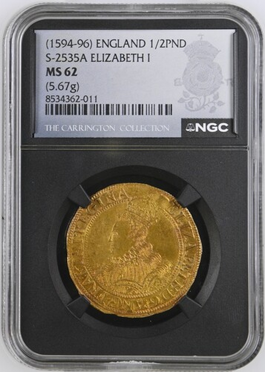(x) NGC MS62 | Elizabeth I (1558-1603), Third 'Restoration' Coinage, Sixth Issue [Crown Gold], Halfpound [of 10-Shillings], (Pyx Period: 9 May 1594 - 13 February 1596), Tower (London), (m.m.) ELIZABETH • D .' G .' ANG . FRA '. ET HI .' REGINA • elaboratedly decorated and crowned bust left, rev. (m.m.) SCVTVM • FIDEI • PROTEGET • EAM •, crowned square-topped shield dividing E-R, 5.662g [87.37grns], 10h, m.m. woolpack (Schneider I, 810; North 2009; S.2535A), an extraordinary coin, beautifully, naturally and arrestingly toned, with much underlying lustrous 'warmth', practically as struck, and undoubtedly amongst the finest known specimens of Charles Anthony's "elaborately bejewelled" canon, in NGC Black 'Carrington' holder, graded MS62 (Cert. #8534362-011)