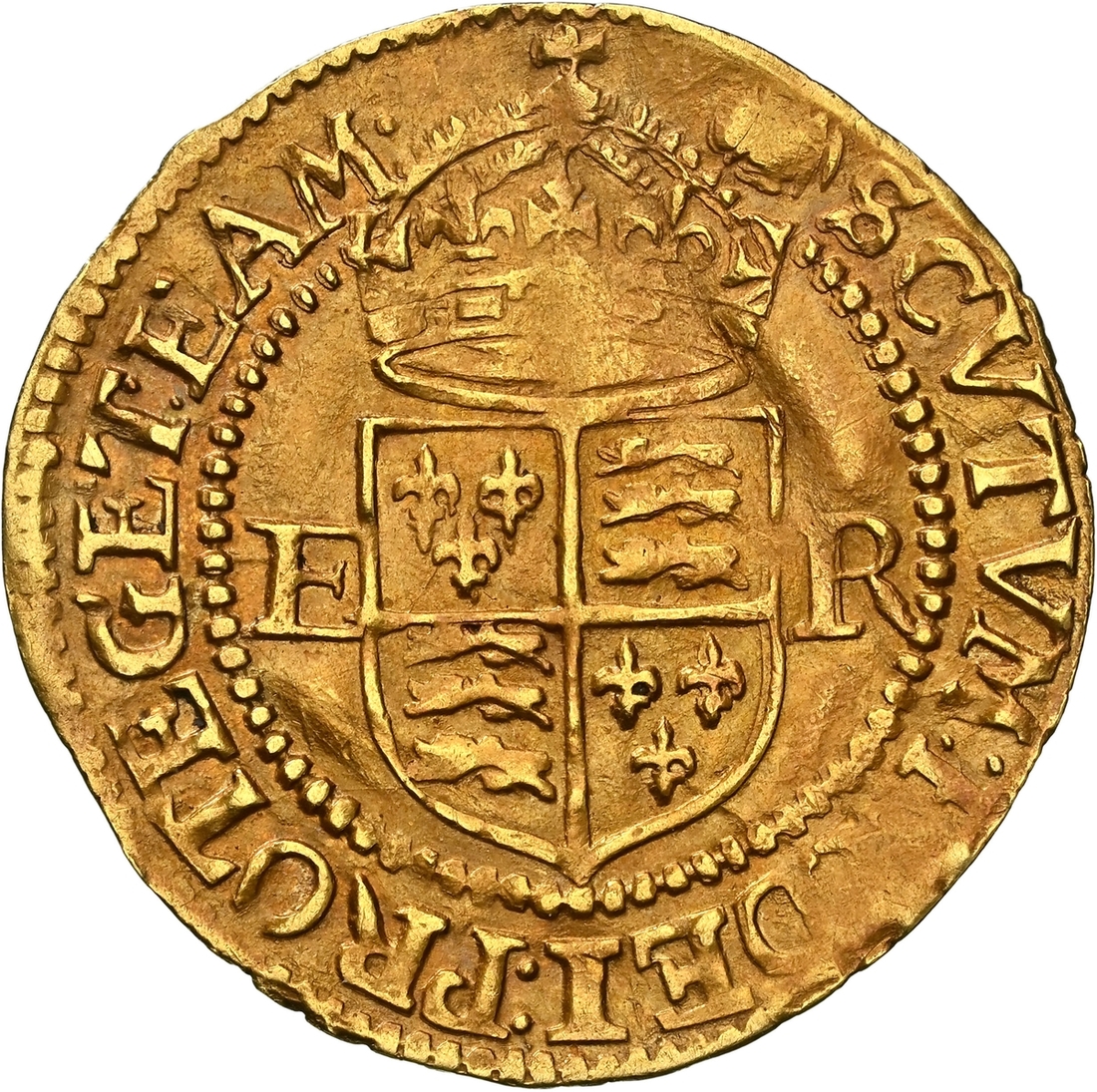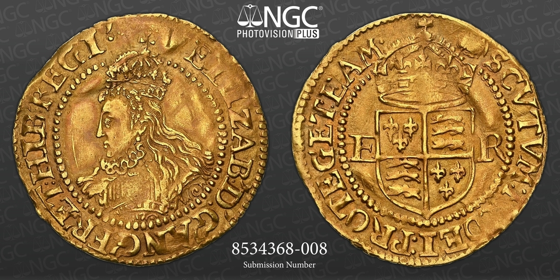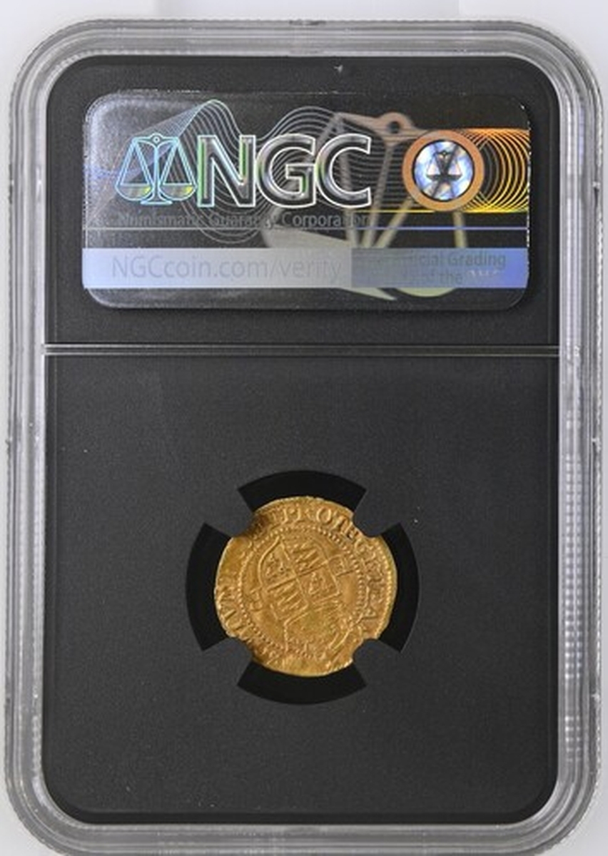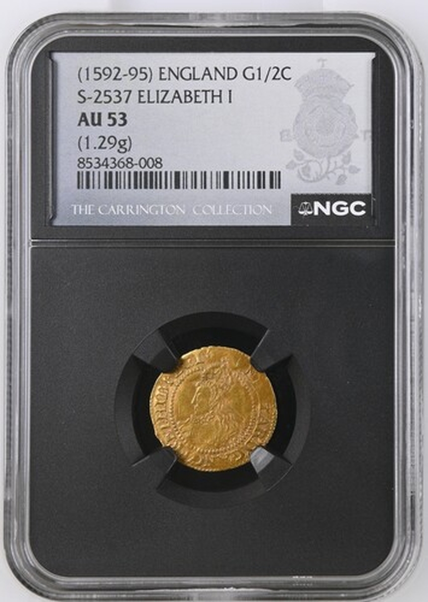 (x) NGC AU53 | Elizabeth I (1558-1603), Third 'Restoration' Coinage, Sixth Issue [Crown Gold], Halfcrown [of 2.5 Shillings], (Pyx Period: 10 June 1593 - 8 May 1594), Tower (London), (m.m.) ELIZAB .' D .' G •' ANG •' FR .' ET : HIB .' REGI •', crowned bust left, rev. (m.m.) SCVTVM : FIDEI : PROTEGET : EAM •, crowned square-topped shield dividing E-R, 1.274g [19.66grns], 5h, m.m. tun (Schneider I, 818; North 2011; S.2537), lightly creased but carefully straightened in antiquity, with delectably uniform reddish-brown overlying cabinet tone on a neater round flan, a pleasing very fine, scarce in any state, in NGC Black 'Carrington' holder, graded AU53 (Cert. #8534368-008)