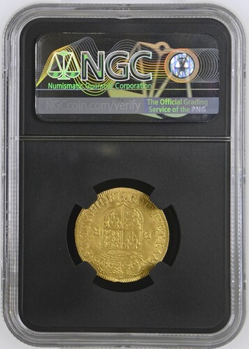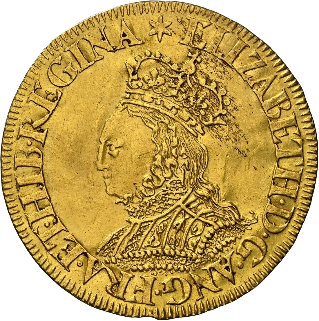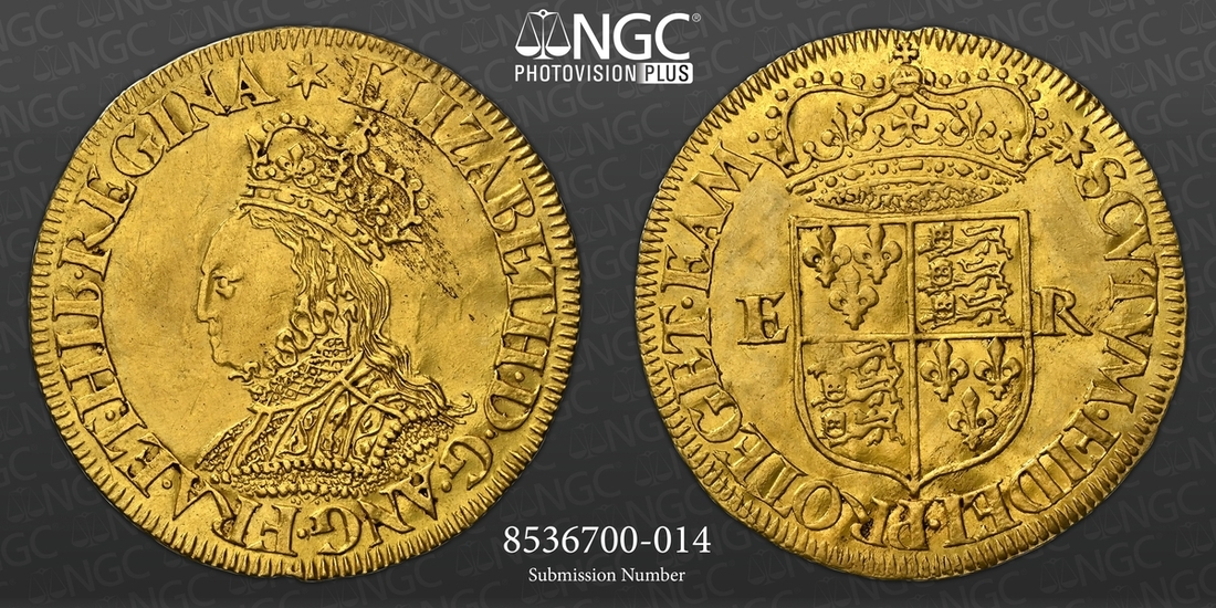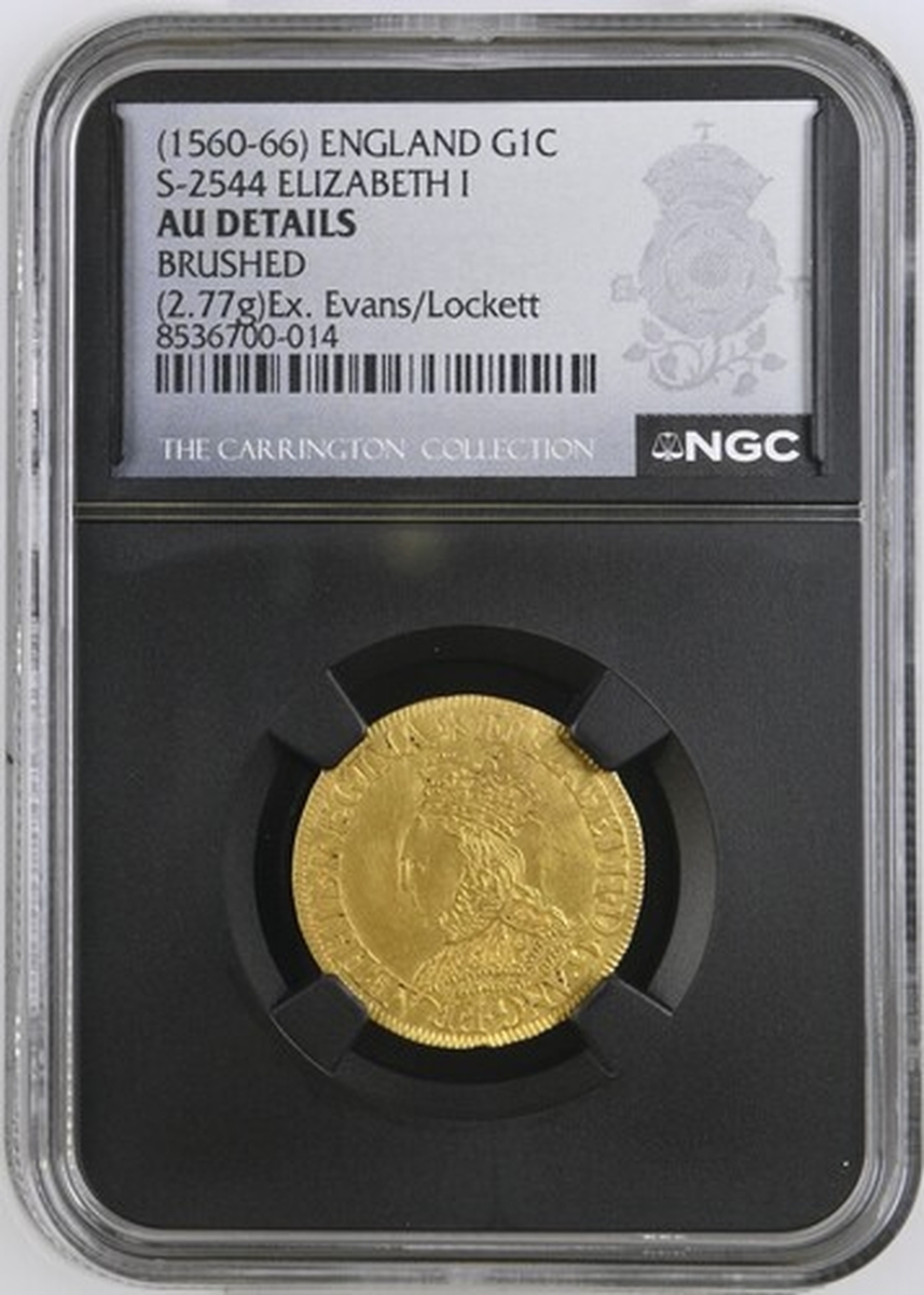 (x) NGC AU | Elizabeth I (1558-1603), Mestrelle's Milled Issues, Gold Crown, [1561], Upper House, Tower (London), struck from the Groat obverse die, (m.m.) ELIZABETH • D • G • ANG • FRA • ET • HIB • REGINA, crowned bust A left, rev. (m.m.) SCVTVM • FIDEI • PROTEGET • EAM •, crowned arms dividing ER, 2.777g [42.5grns], 6h, mm. star (Borden & Brown 7 [O1/R1] / OR M1 CHECK; Schneider I, 761 same dies; North 2020/1; S.2544), lightly creased and bright, nonetheless a most beautifully uniform strike, especially sharp to bodice, almost extremely fine, and very rare, in NGC Black 'Carrington' holder, graded Almost Uncirculated (Cert. #8536700-014)
