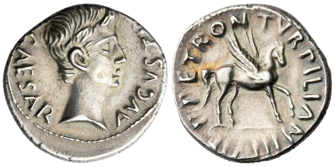 (x) Roman Empire, Augustus (27 BC-AD 14), AR Denarius, P. Petronius Trupilianus, moneyer, Rome, struck c. 19, CAESAR AVGVSTVS, bare head right, rev. P PETRON TVRPILIAN III VIR, Pegasus walking right, 3.66g (RIC 297), toned, struck off centre as typical for type on a short flan, nice portrait, good very fine, described by NGC as "hair perhaps tooled, no decision", and hence not slabbed (Cert. #8534359-001)