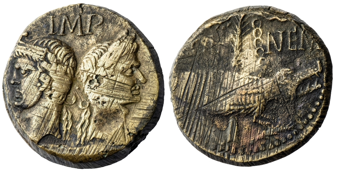 Roman Empire, Augustus (27 BC-AD 14), AE As, Nemausus, struck 10 BC-AD 10, IMP [DIVI F], rostral-crowned and laureate head of Agrippa left, wreathed head of Augustus right, rev. [COL] NEM, chained crocodile, palm-shoot with tip to right, wreath with long ties above to left, 14.03g (RIC I, 158), bright, heavily defaced, about fine