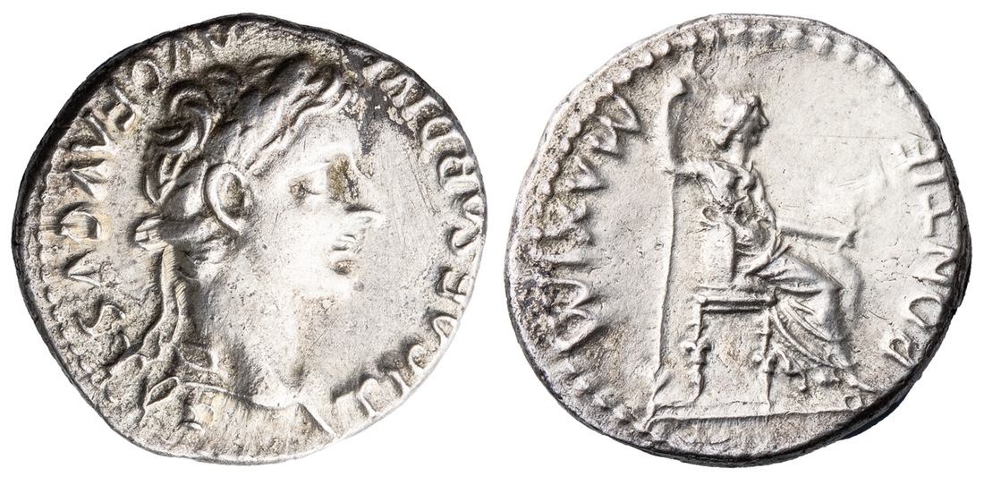 Roman Empire, Tiberius (AD 14-37), AR Denarius, "Tribute Penny" type, Lugdunum (Lyon), struck 14-37, TI CAESAR DIVI AVG F AVGVSTVS, laureate head right, rev. PONTIF MAXIM, female figure seated right, on chair with ornamented legs, holding inverted spear and branch, 3.69g (RIC I 28), very fine