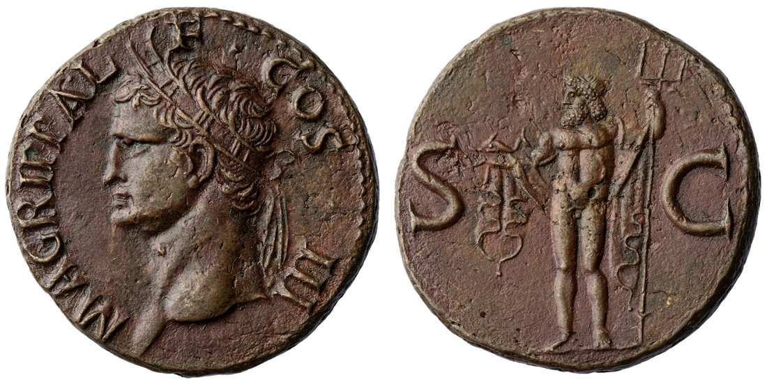 Roman Empire, Agrippa, AE As, struck under Caligula (AD 37-41), M AGRIPPA L F COS III, head of Agrippa left, wearing rostral crown, rev. Neptune standing left, nude except for cloak hanging over his left shoulder and right arm, holding trident and dolphin, S-C across fields, within beaded border, 11.11g (RIC 58), rich red-brown patina, lovely portrait, extremely fine