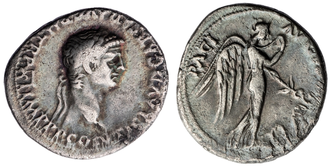 Roman Empire, Claudius (AD 41-54), AR Denarius, Rome, struck c. 51, TI CLAVD CAESAR AVG GERM TR P XI IMP P P, laureate head right, rev. PACI AVGVSTAE, Nemesis advancing right, pointing caduceus at serpent, 3.72g (RIC 52; BMC 62), slightly smooth surfaces, yet toned and about very fine, rare