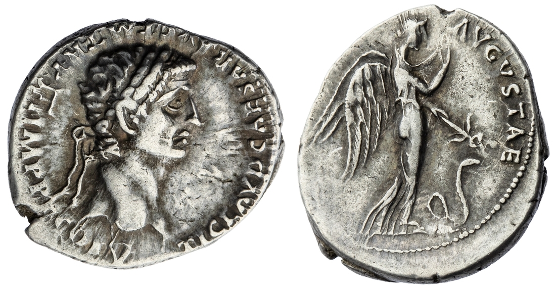 Roman Empire, Claudius (AD 41-54), AR Denarius, struck c. 51-52, TI CLAVD CAESAR AVG P M TR P XI IMP P P COS V, laureate head right, rev. [PACI] AVGVSTAE, Nemesis standing right, drawing out fold of dress before her, and holding caduceus over serpent, 3.64g (RIC 62; BMC 69; Cohen 68), struck slightly off-centre, nevertheless a toned and detailed example of this rarity, about extremely fine