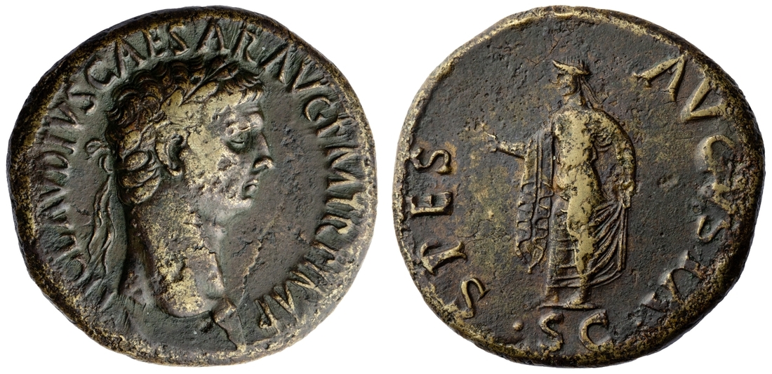Roman Empire, Claudius (AD 41-54), AE Sestertius, struck 41-50, TI CLAVDIVS CAESAR AVG P M TR P IMP, laureate head right, rev. SPES AVGVSTA, Spes advancing left, holding flower, raising skirt with left hand, S C in exergue, 24.38g (RIC I 99), shallow crack on obverse, good fine