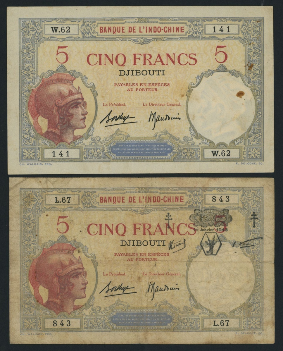 (x) Banque de l'Indo-Chine, French Somaliland, [2 notes], 5 Francs, 1927-1943,