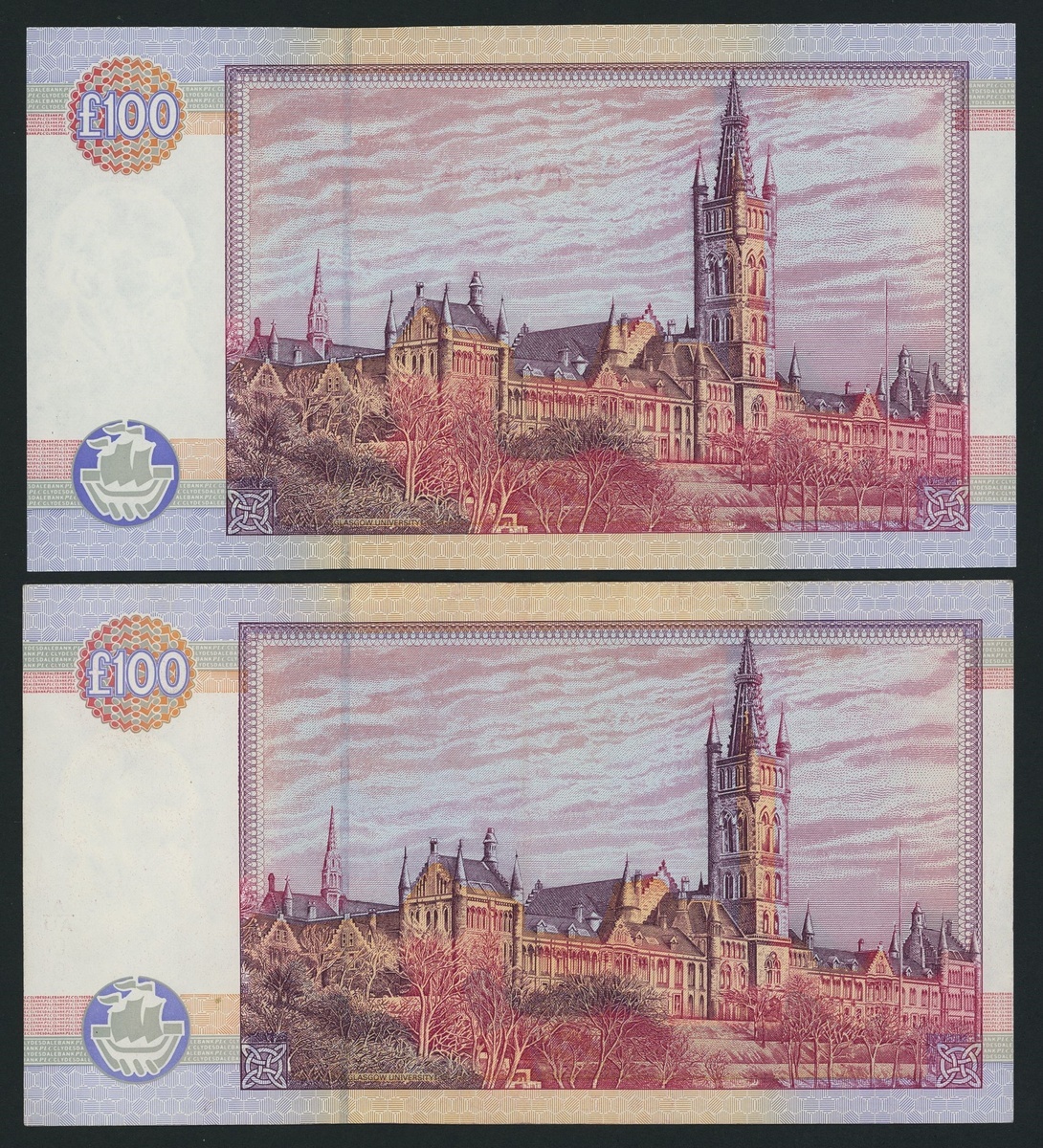 (x) Clydesdale Bank plc, [2 notes] £100, Glasgow, 2nd October 1996, serial numbers A/AA 000257 and A/AU 003300, including low serial number with first prefix,