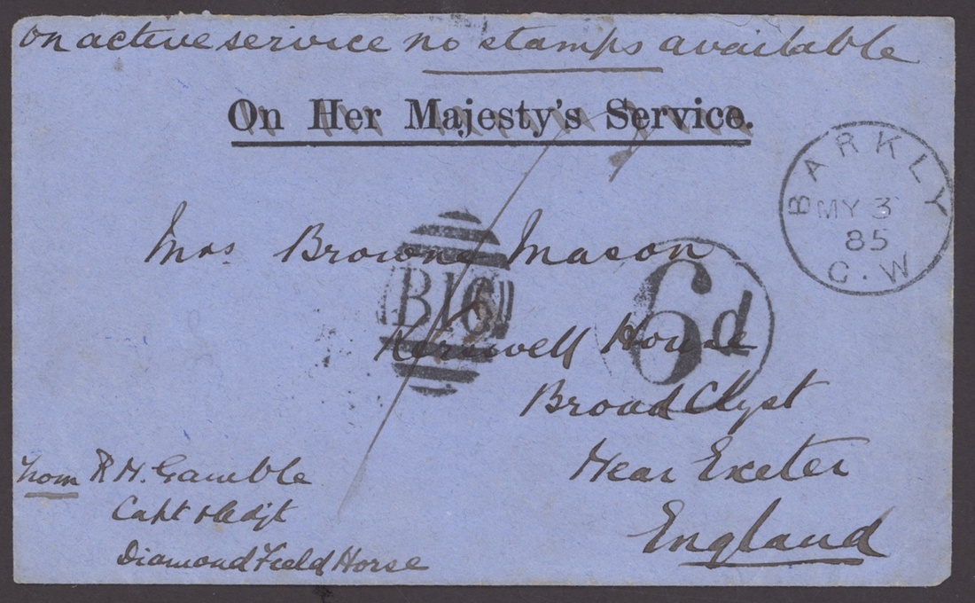 1885 (3 May) blue "On Her Majesty' Service" (deleted) envelope from Capt. Gamble of the Diamond Field Horse to Exeter marked "on active service no stamps available", showing "