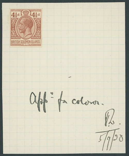 4½d. red-brown affixed to piece (76x93mm.) marked "Appd for Colour" and dated "5/9/30", fine. Photo