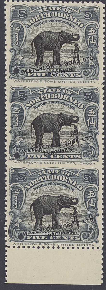 1909-23 5c. black and slate-grey and 12c. black and carmine, both in vertical strips of three imperforate between with the foot and the lower left corner of the sheet respectively, overprinted "