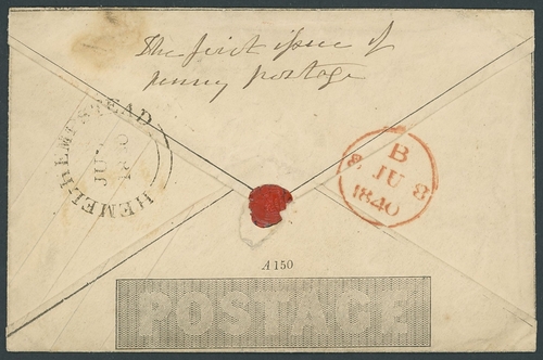 A150, dated 8 June 1840, addressed to London, upright and central red Maltese Cross cancellation, on reverse Hemel Hampstead despatch and red arrival datestamps. Inscribed on the flap "The first piece of penny postage" in a contemporary hand, possibly that of the recipient. A little soiled and small stain on reverse. A rare and delightful envelope