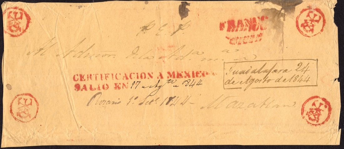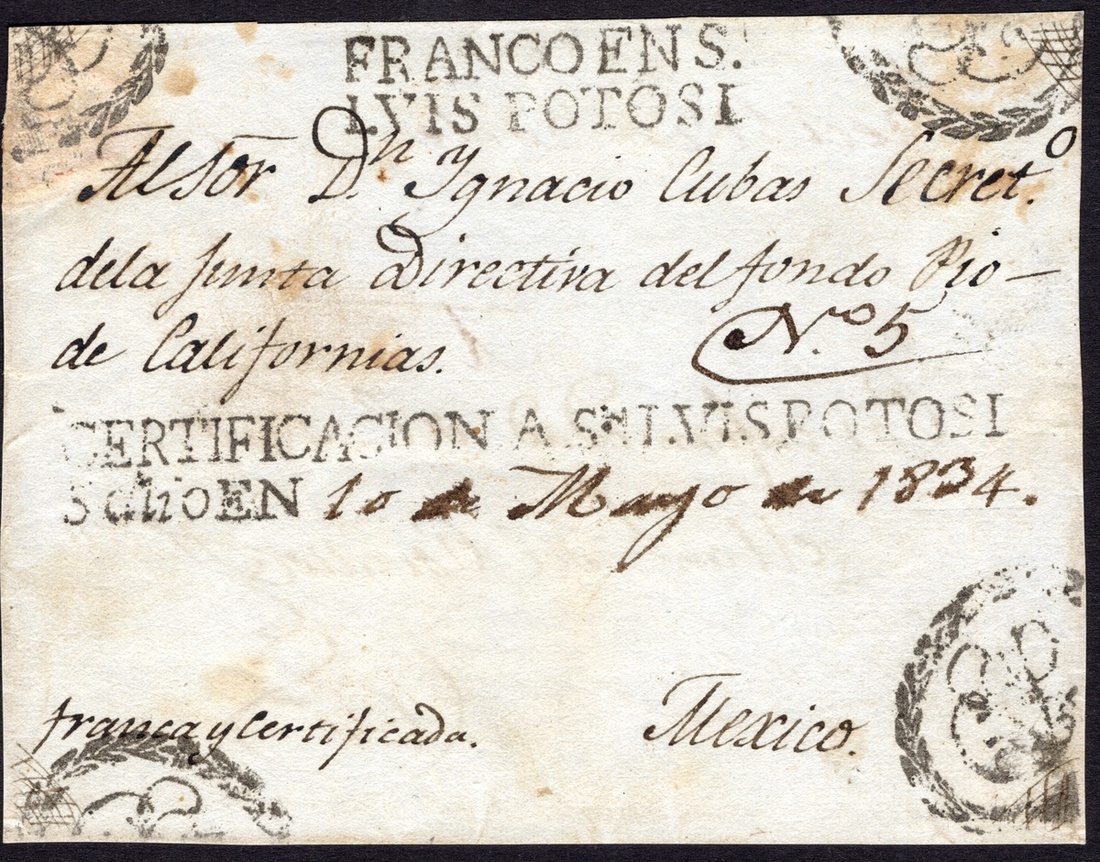 Mexico District, San Luis Potosí Two Republican stampless registered cover fronts, dated May 10th 1834 (from San Luis Potosí) and August 24th, 1844 (from Mexico City), both displaying the decorative monograms in corners. From the Colonial era until 1882, the rules for certified mail required that, upon receipt, the front of the cover or package be cut out and the recipient sign the reverse as proof of delivery. This signed front was then returned to the office of origin, where it was kept as proof of delivery for two years before being destroyed. This explains their rarity.
