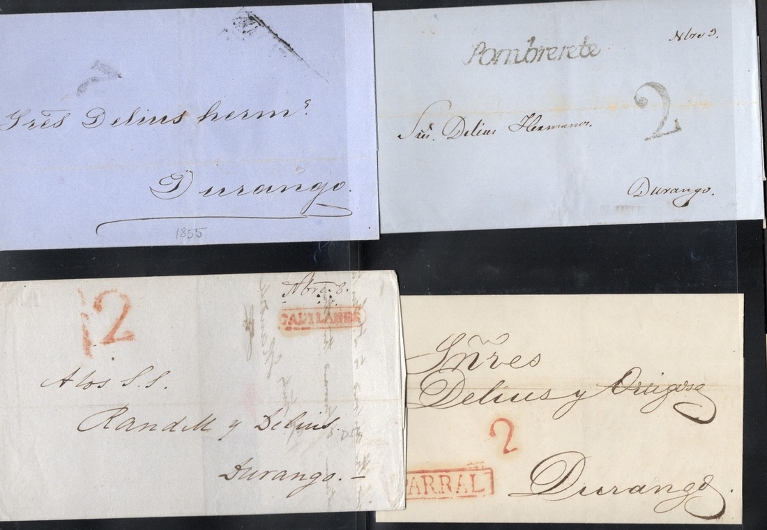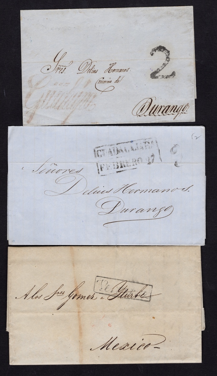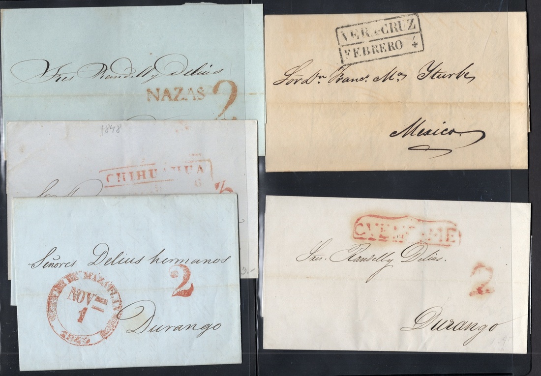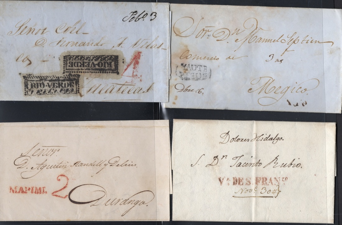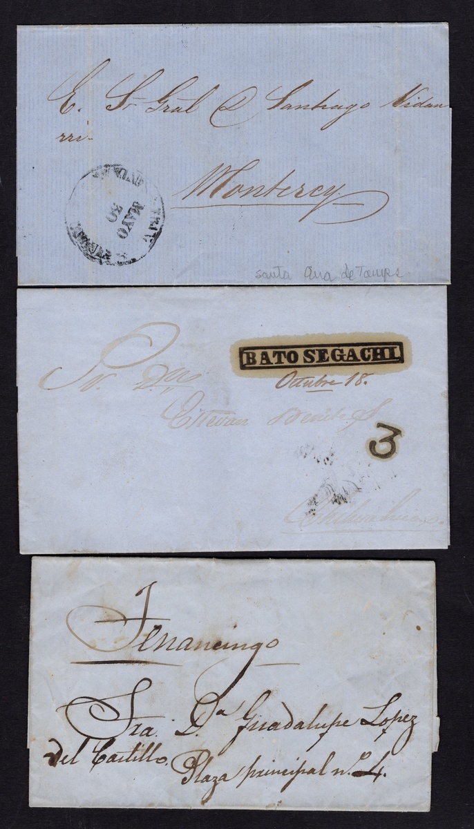 1835-56 Group of 32 Republican stampless covers and entire letters, boasting a very high quality overall, with outstanding and spectacular handstamps of Batosegachi, Río Grande, Río Verde, and Yautepec. Others include Mapimí, Chihuahua, Rosales, Cerro Gordo, Dolores, Veracruz, Guanajuato, Tampico, Puebla, Nazas, Gavilanes, Parral, Sombrerete and Cuencamé.