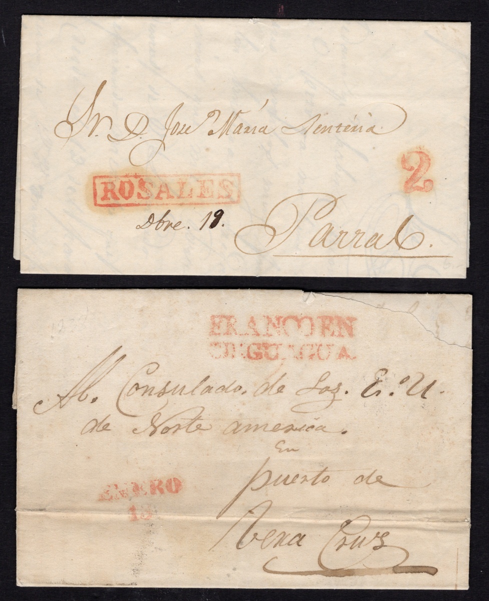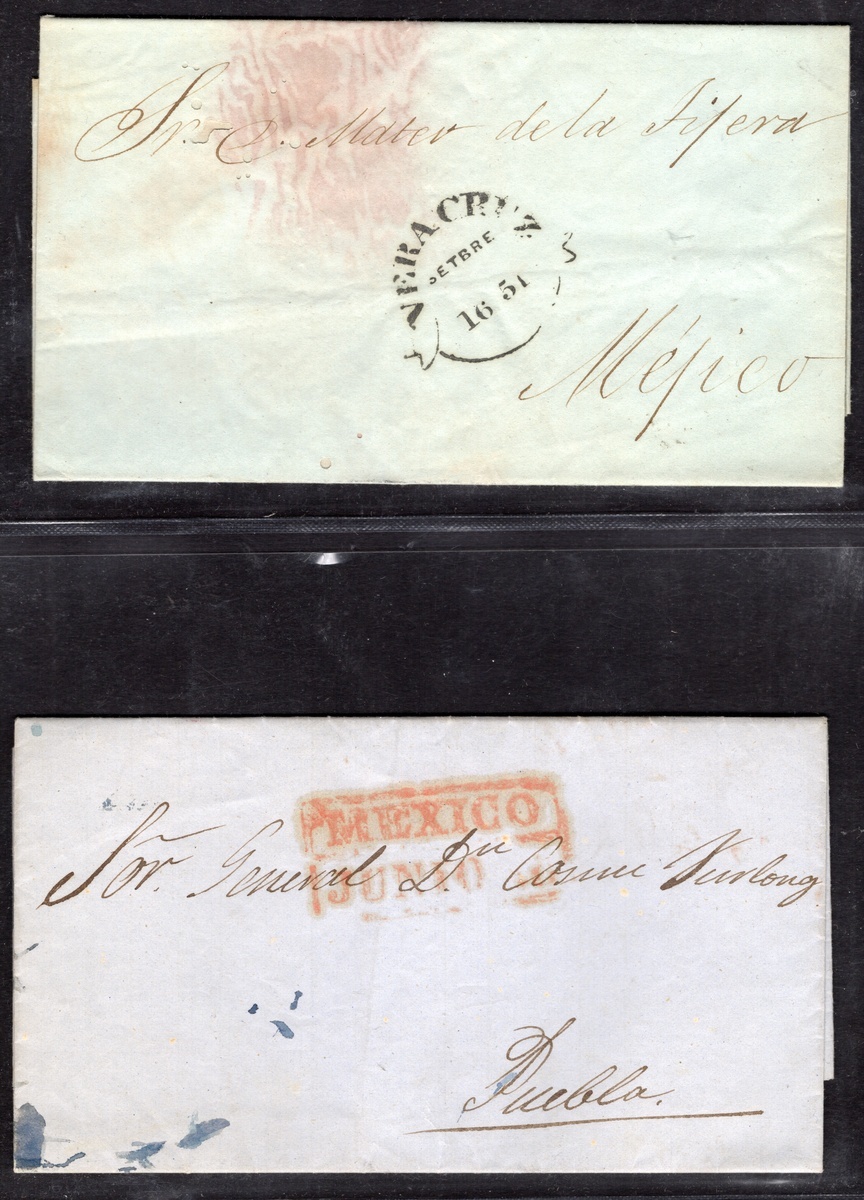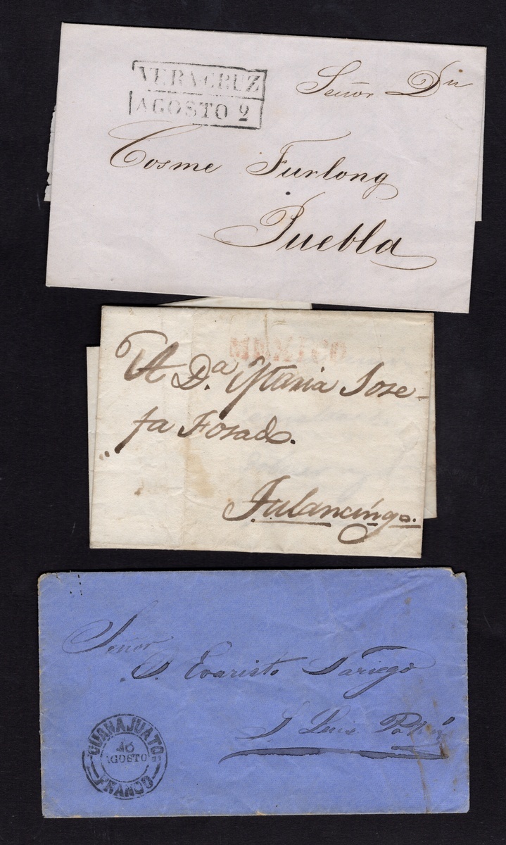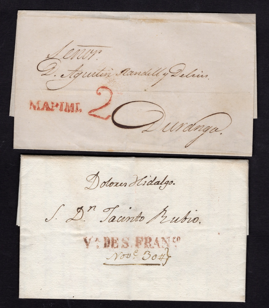 1835-56 Group of 32 Republican stampless covers and entire letters, boasting a very high quality overall, with outstanding and spectacular handstamps of Batosegachi, Río Grande, Río Verde, and Yautepec. Others include Mapimí, Chihuahua, Rosales, Cerro Gordo, Dolores, Veracruz, Guanajuato, Tampico, Puebla, Nazas, Gavilanes, Parral, Sombrerete and Cuencamé.
