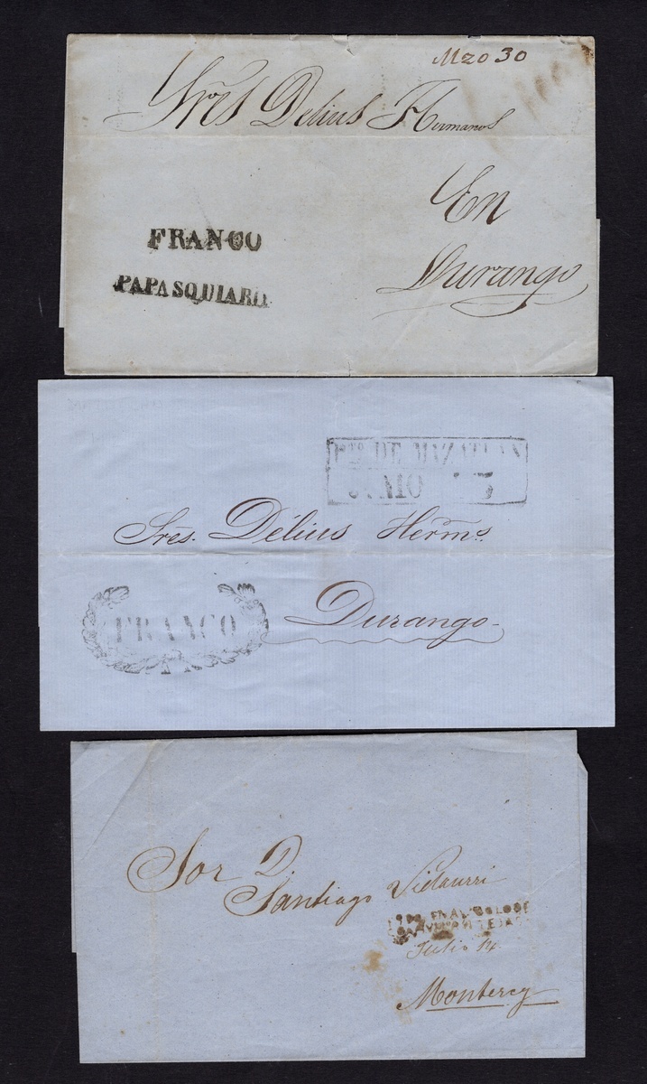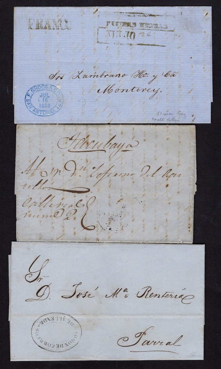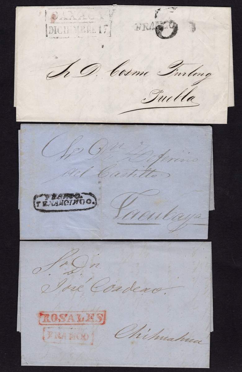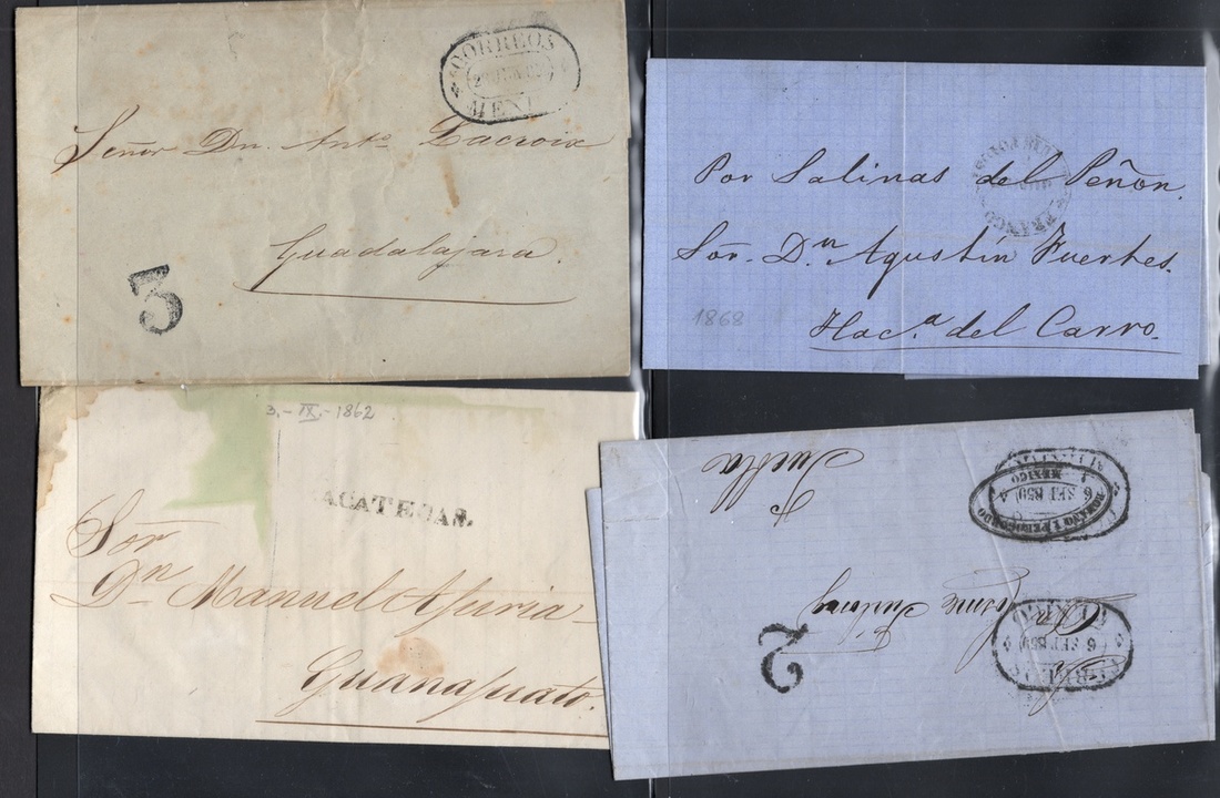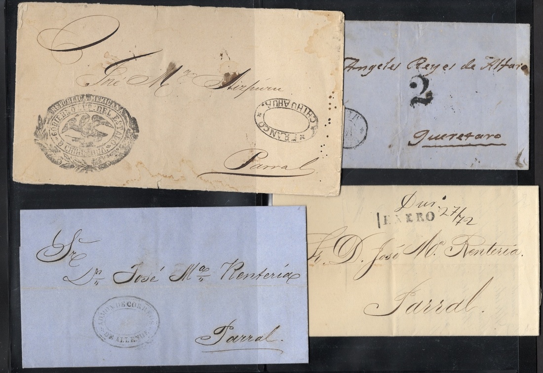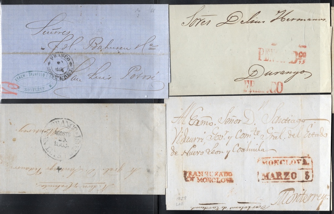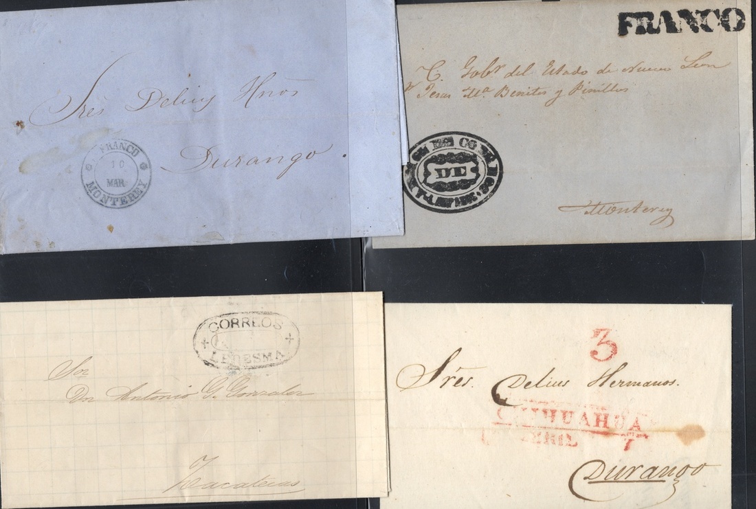 1859-72 Group of 25 Republican stampless covers and entire letters, in very fine condition with great handstamp strikes of Lampazos, Paso de Ovejas (in red), Monclova, Tenancingo, Chihuahua official large Eagle cachet. Others include Papasquiaro, Monterrey, Allende, Oaxaca, San Luis Potosí, Zacatecas, Piedras Negras, Peñón Blanco and Guadalajara.