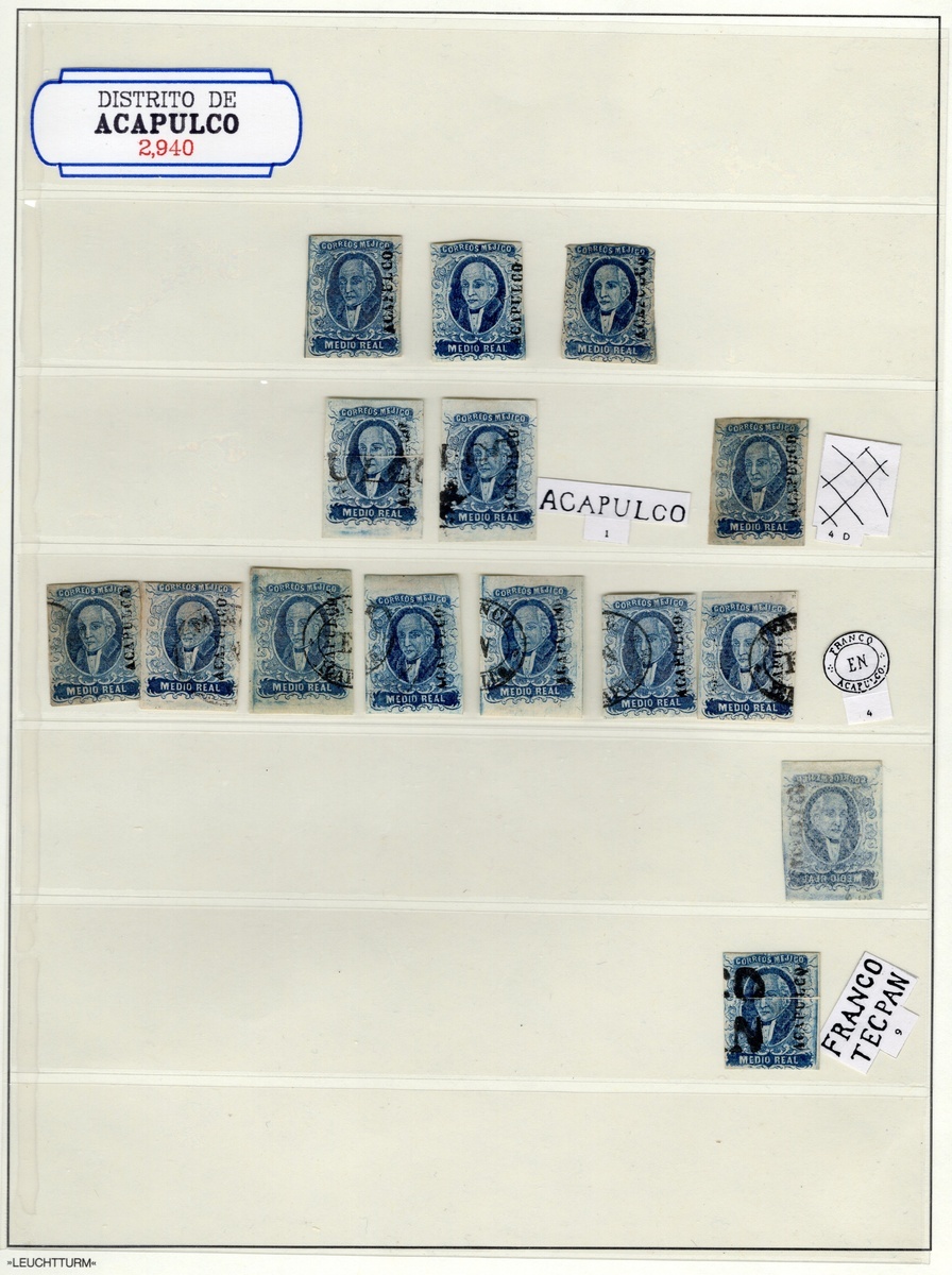 Acapulco ½r. Blue, group of 15 stamps, of which three unused, including cancellations from the two Acapulco types and the rare Tecpan, and one used example printed on unusually thin paper, creating the illusion of a double-sided print due to its high transparency. Very fine condition throughout and mainly good margins. 2025 MEPSI certificate. Scott 1; NF $1,230.,
