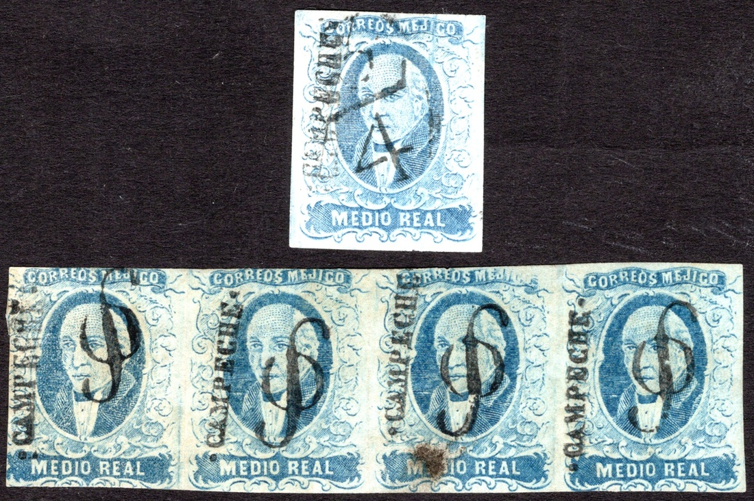 Campeche ½r. Blue, including a very attractive strip of four with mute "O S" h.s., margins touching or cutting into top and bottom, but very rare with this cancel; as well as one single with "1/4" numeral cancel, margins all around. A rare duo. Scott 1; NF $450.