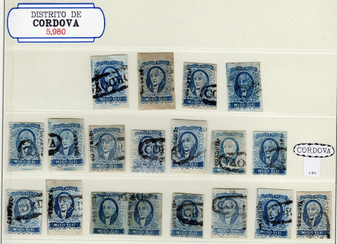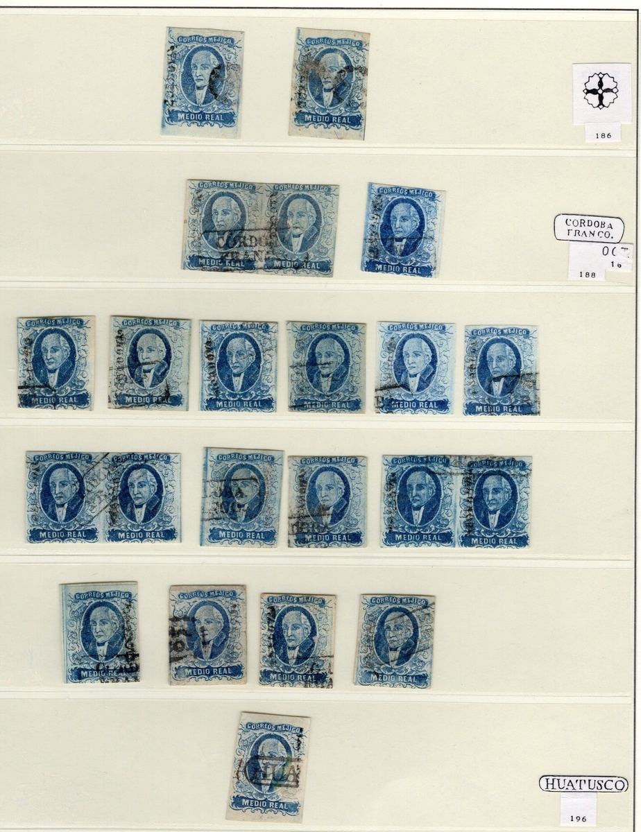 Córdova ½r. Blue, assembly of 41 used stamps, including usages from Córdova and Huatusco, with also the rare Maltese Cross h.s. Good condition throughout, with mainly three or four margins. Scott 1; NF $1,890.