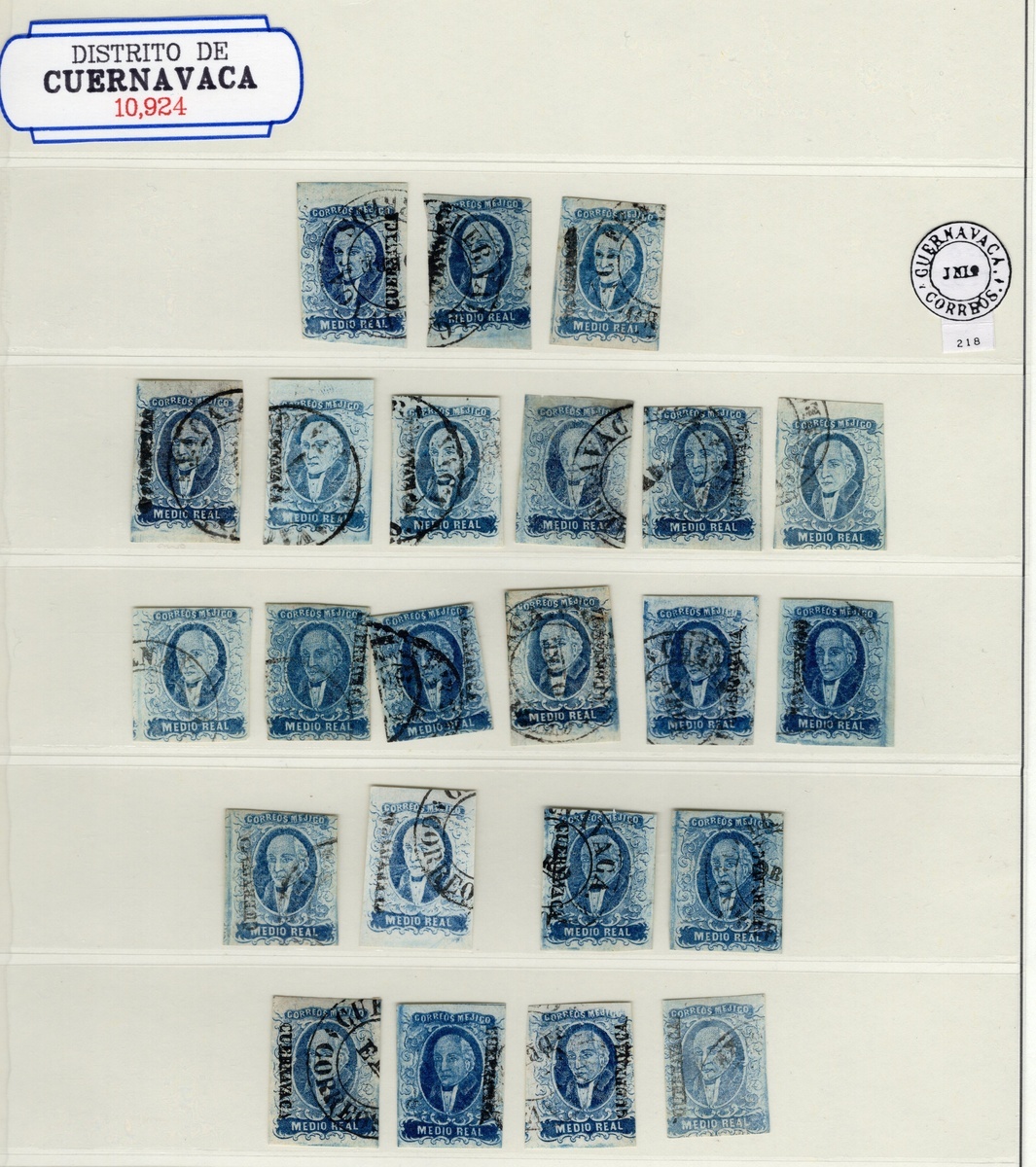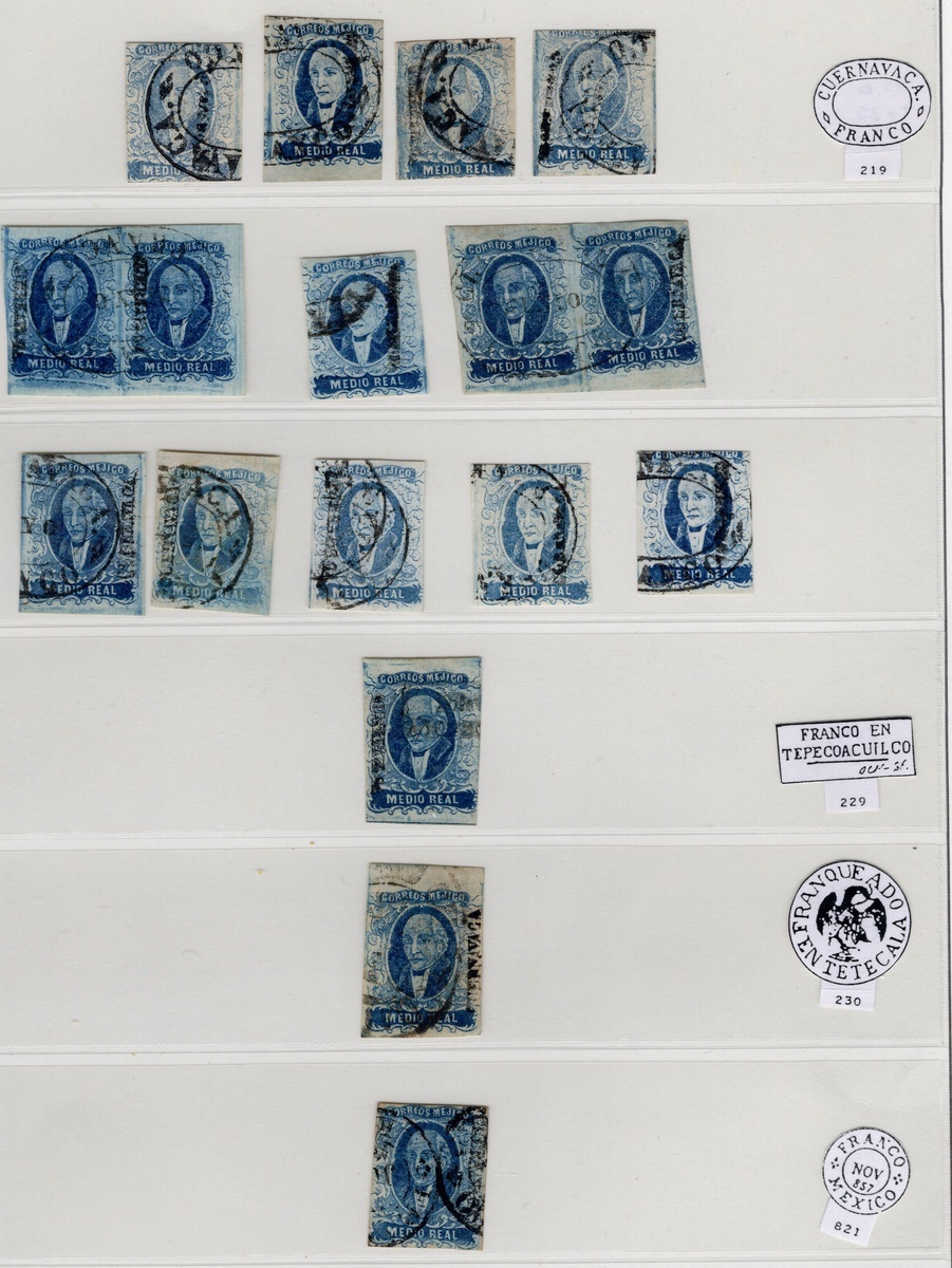 Cuernavaca ½r. Blue, group of 40 used stamps, with cancellations from Cuernavaca, Tepecoacuilco, Tetecala and Mexico City. Good condition throughout, mainly with three or four margins. Scott 1; NF $2,400.
