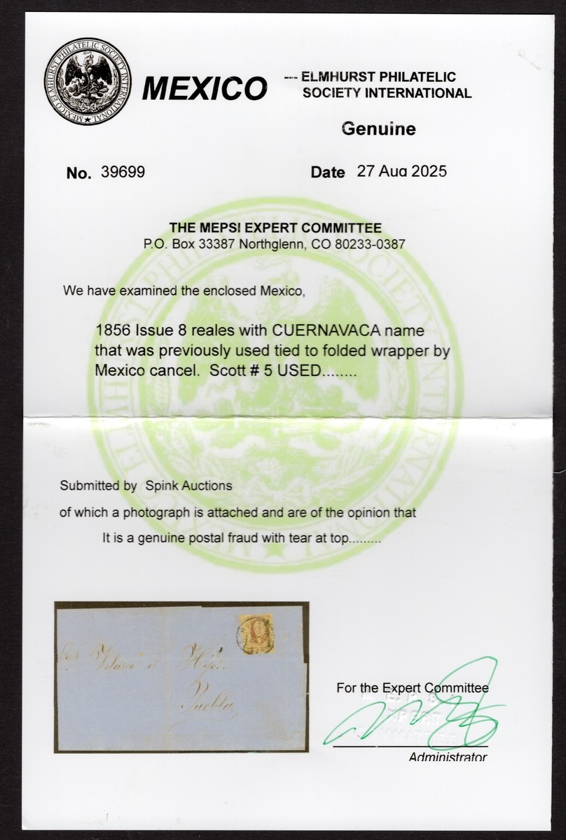 Cuernavaca 8r. Lilac, cut into at top and right, tied to aged cover (tear) from Mexico City to Puebla dated June 1st, 1859. One tear at top of the stamp is to be expected, as this was previously cancelled. A rare postal fraud, as 8r. are scarce on cover. . 2025 MEPSI certificate. Scott 5; NF $850 off-cover.