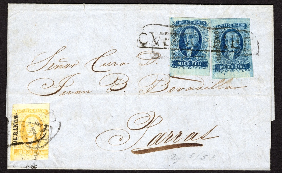 Durango, Veracruz Two very appealing entire letters, including one from Cuéncame to Parral franked by two ½r. Blue and one 1r. Yellow , dated August 5, 1857; as well as single use of ½ r. Blue with margins all around, dated December 18, 1856 from Tlacotalpam, showing a striking blue cancel. Scott 1, 2.